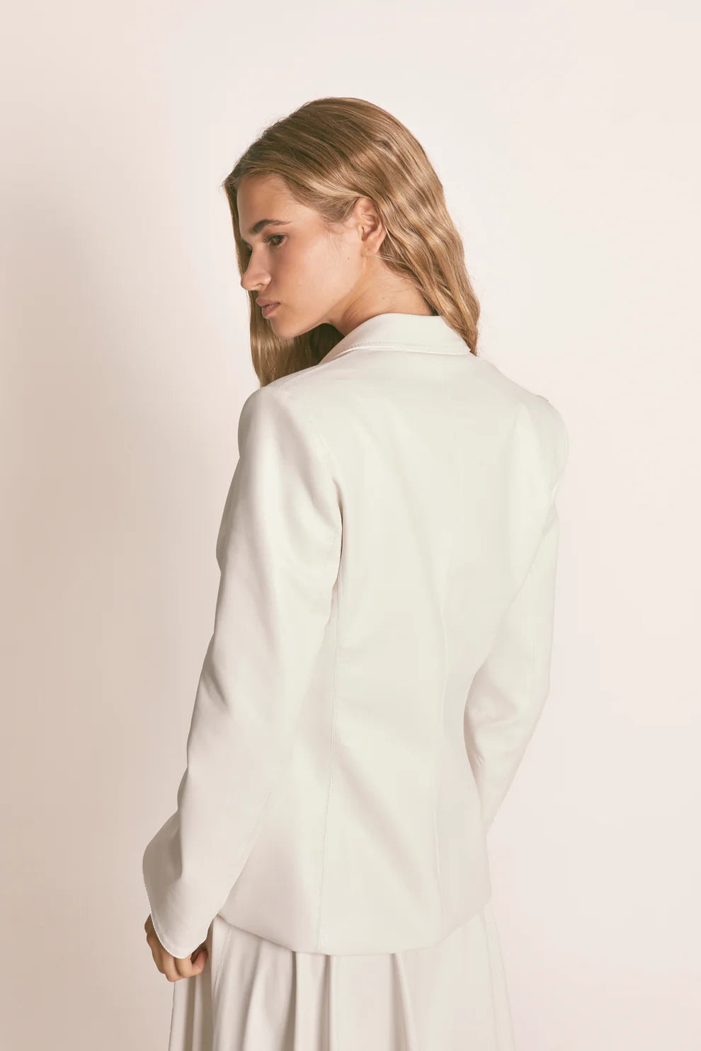 Elegant white faux leather blazer. Its sophisticated design features a slim fit, peaked cuffs and incorporates a front fastening with decorative clasp and front pockets with flaps and metal buttons. Flap pocket and tassel details accentuate its unique style. Perfect for special occasions or to add a touch of sophistication to your everyday look.