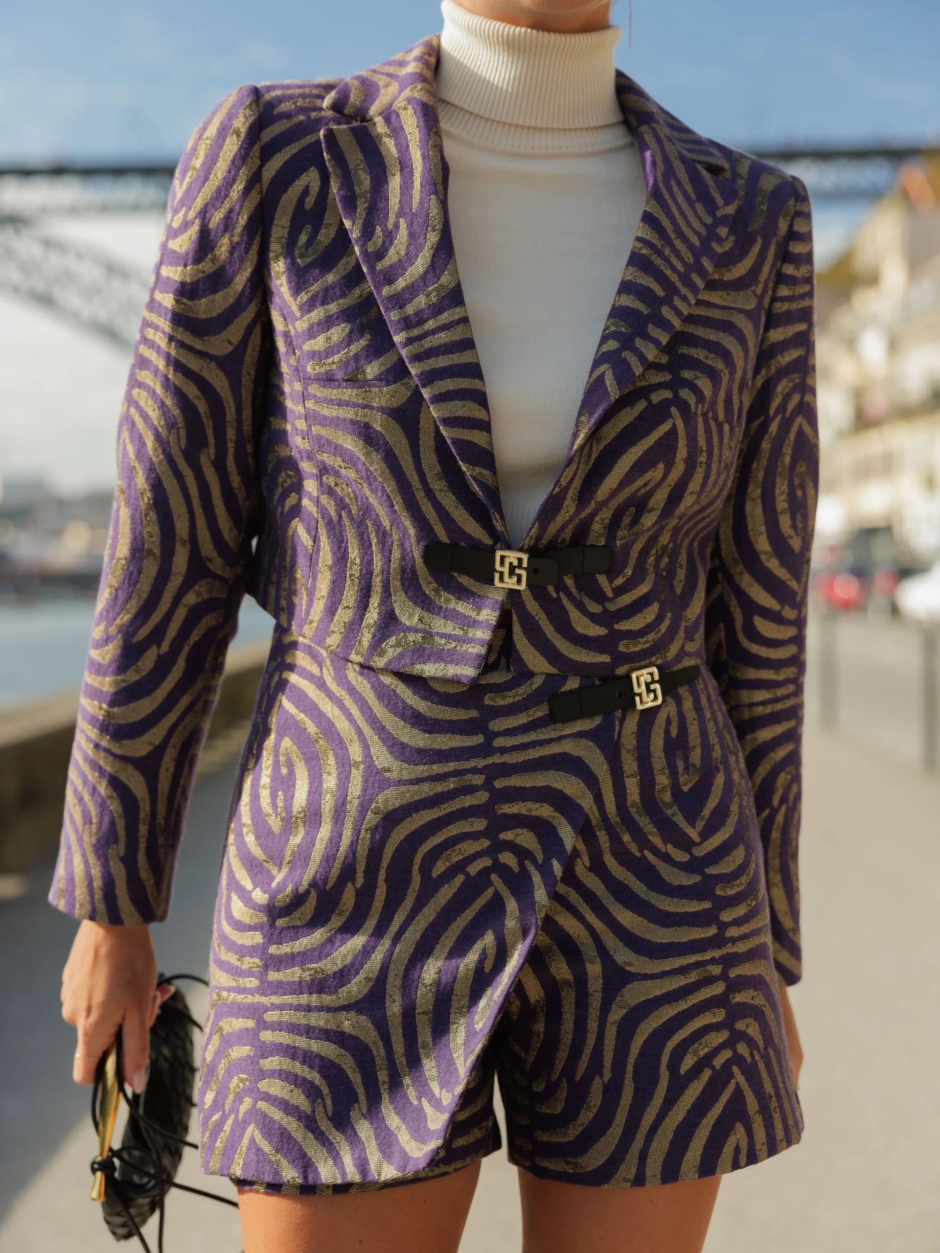 Short jacquard blazer with flap collar and long sleeves. Front closure with custom strap. The fitting of the piece is loose.