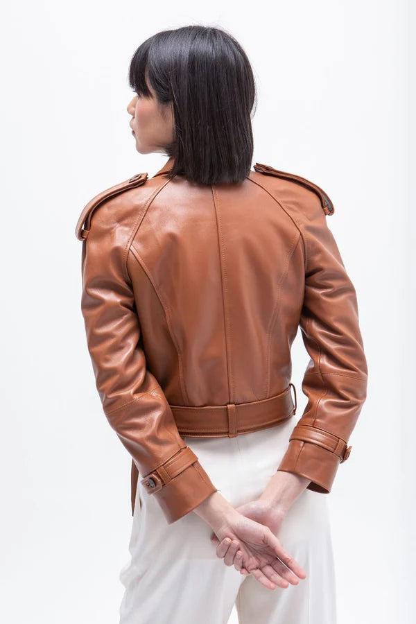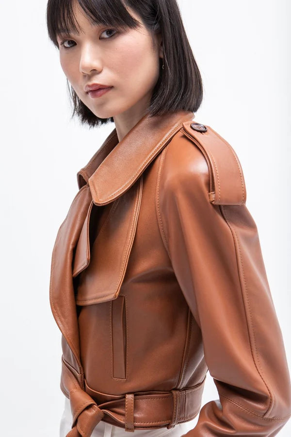 Casaco curto em pele de cordeiro na cor camelo. Apresenta um design estruturado estilo trench coat, com lapelas largas, ombreiras proeminentes e punhos com fivela ajustável. O corte é cintado, afinando a silhueta, e o fecho é feito com botões e cinto a condizer para um ajuste perfeito. O interior é forrado em cetim. Esta é uma peça versátil e marcante que combina tanto com looks casuais como com conjuntos mais elegantes.