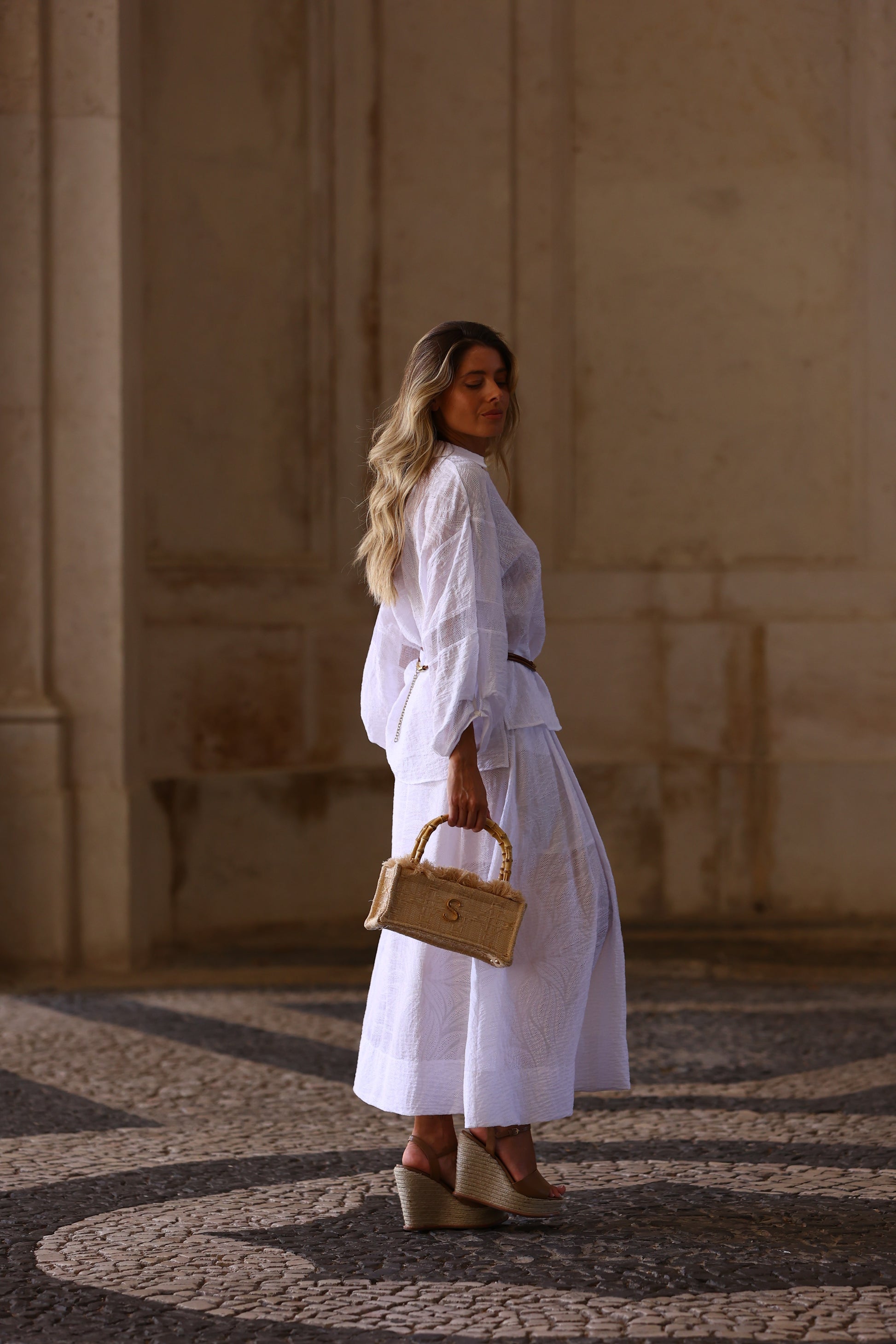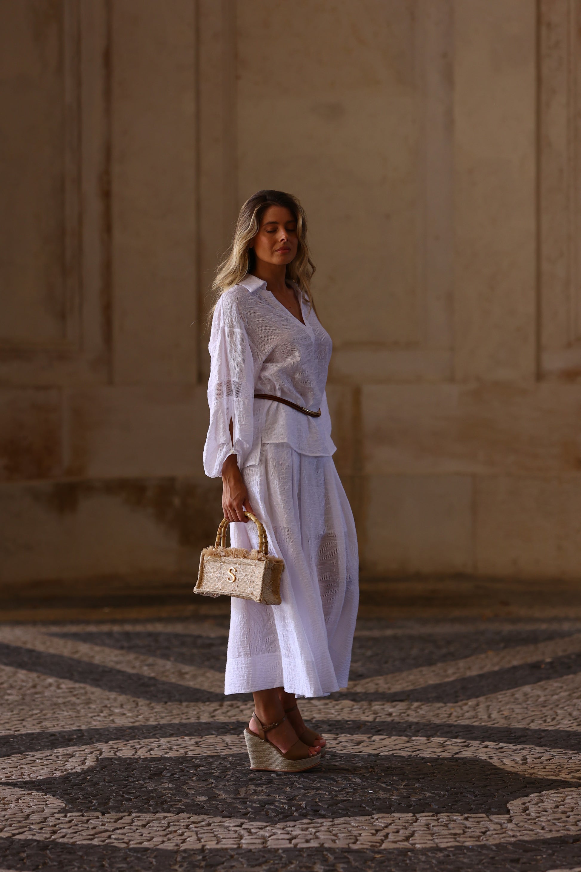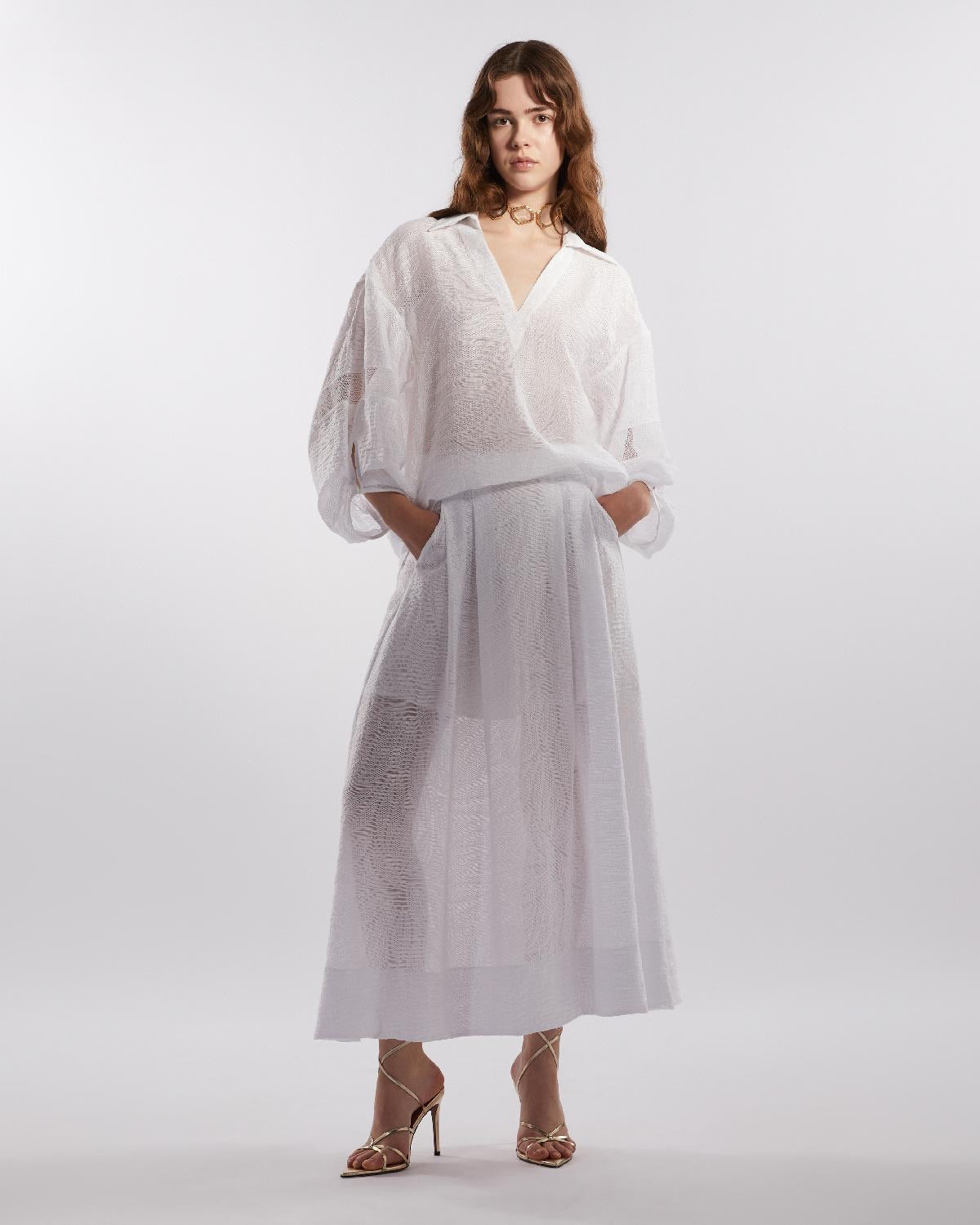 Delicada e leve como uma brisa de verão, esta blusa branca é confeccionada em tecido translúcido com textura orgânica, que confere sofisticação e um visual etéreo. Com modelagem ampla, mangas bufantes e decote em V, a peça proporciona fluidez e elegância minimalista.