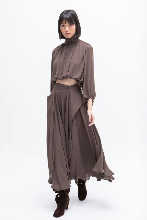Blusa castanho escuro com gola alta drapeada, criando um efeito envolvente. As mangas são compridas, com um volume suave que começa nos ombros e cai fluidamente até aos punhos, onde se franzem num acabamento justo com efeito balão. O corpo da blusa é solto, desde o decote até à bainha, com pregas pronunciadas que acrescentam textura e caimento. A bainha afunila e expande-se, abraçando o corpo com um formato ligeiramente saliente, semelhante a um efeito balão.