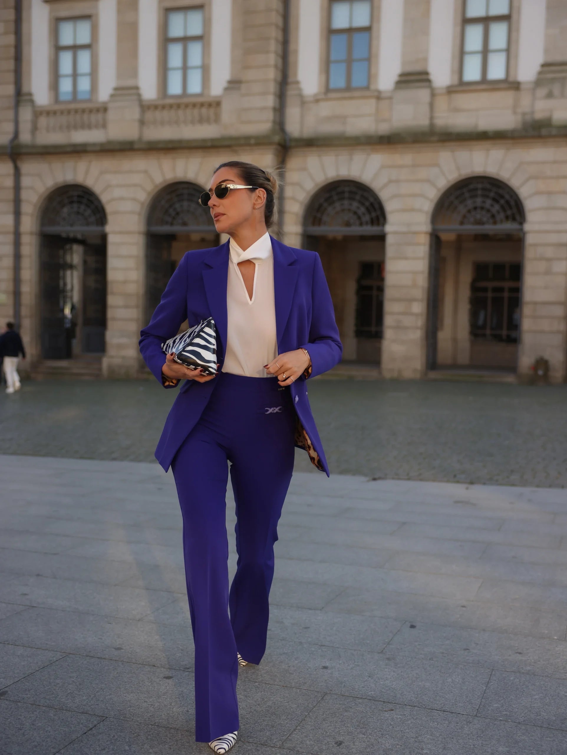 Plain blouse with an opening at the neckline and twist detail on the collar. Collar fastens with buttons at the back. Long sleeves and cuffs at the ends fasten with buttons. The fitting of the piece is fluid.