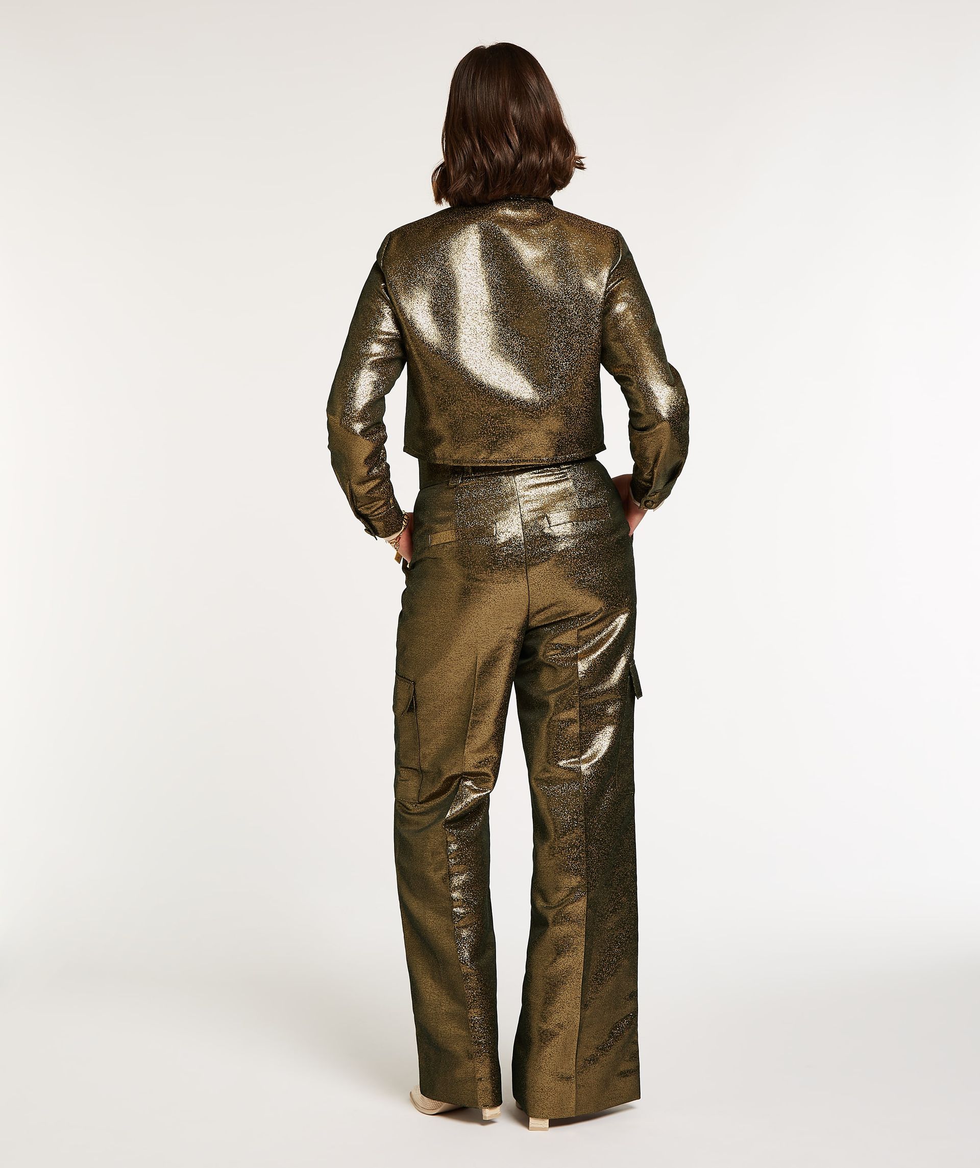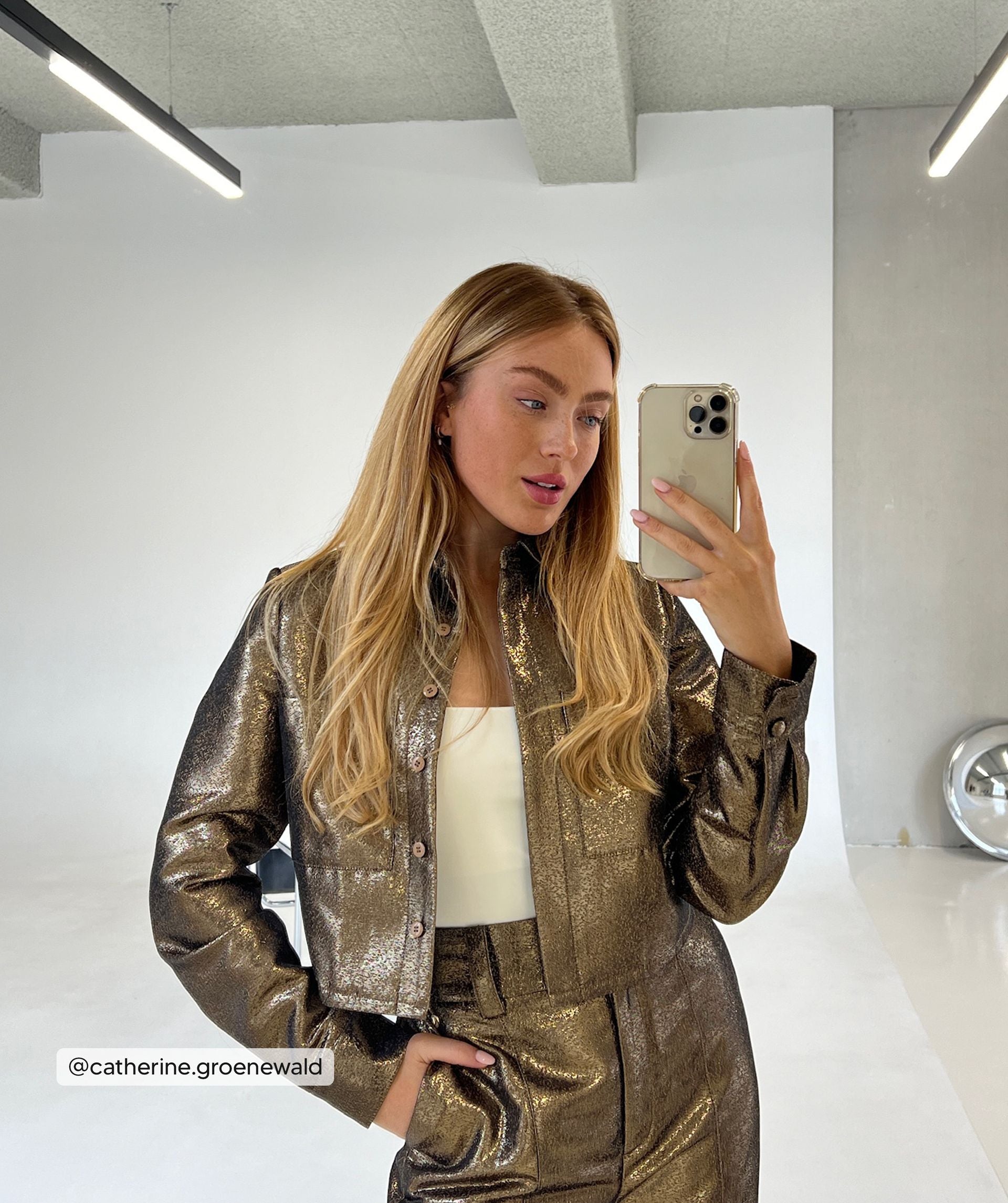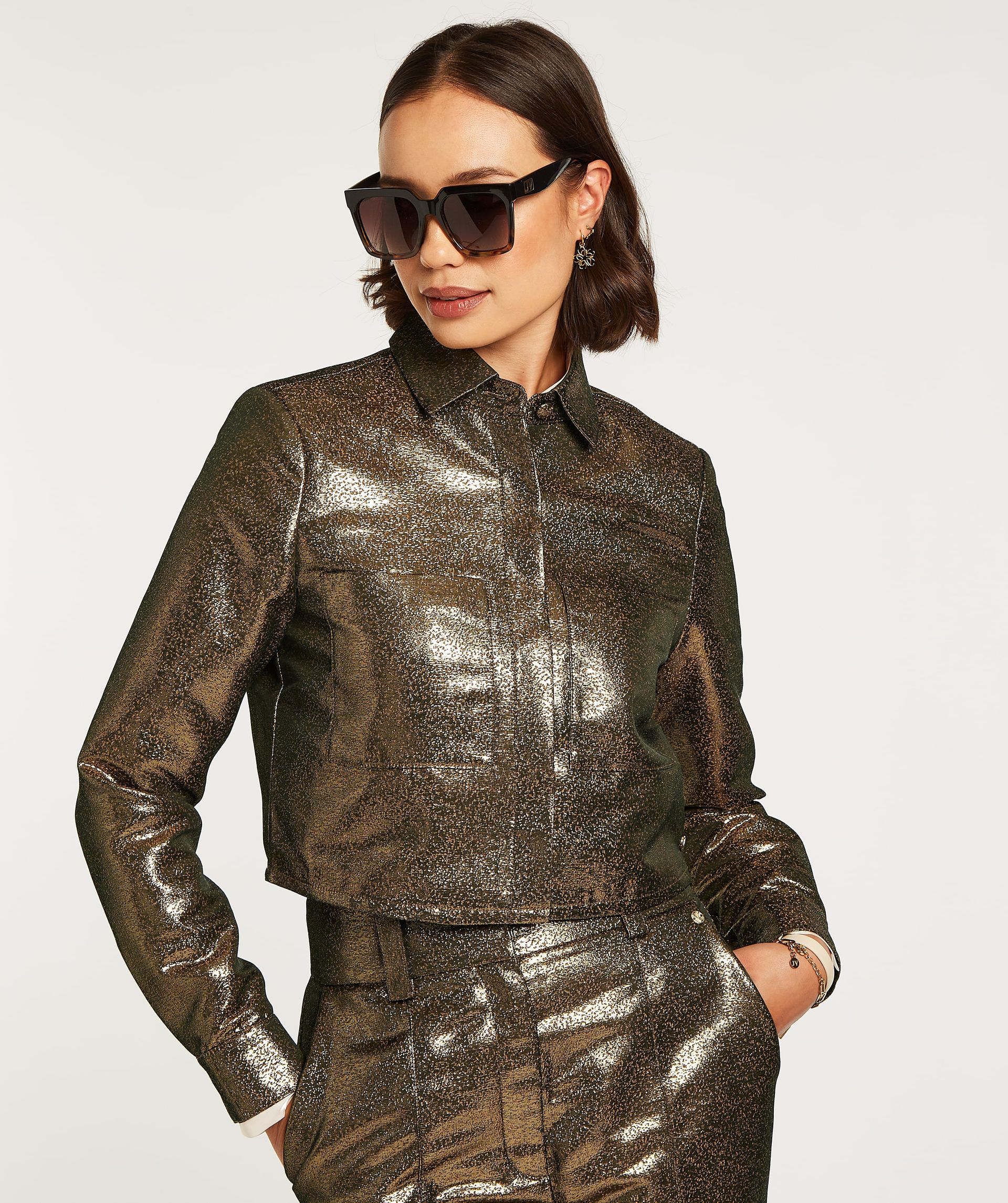 The JOSH V Davis Women's Blouse in Antique Gold is part of a complete ensemble. Pair the blouse with matching Ali trousers for a complete outfit, or wear the metallic blouse that pairs perfectly with black trousers or a skirt. The blouse is made of metallic quality with recycled polyester. Additionally, the gold cropped blouse is equipped with chest pockets.