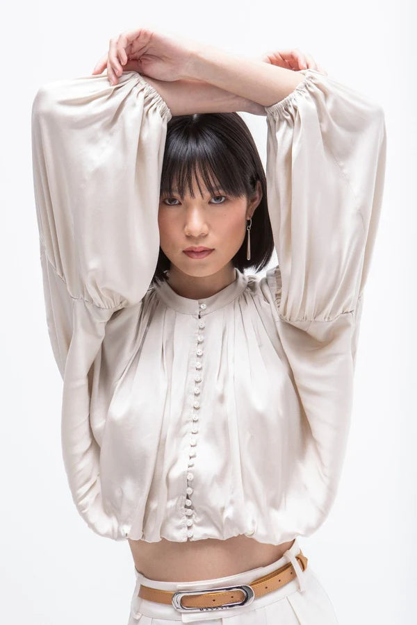 Blusa fluída confecionada em cetim bege suave com um delicado brilho natural que realça o caimento do tecido. O design apresenta pregas na parte superior do decote que geram volume e movimento, criando uma silhueta romântica e descontraída. A blusa apresenta mangas compridas, largas e ligeiramente abalonadas, rematadas com punhos elásticos suaves para conforto sem comprometer a elegância. No centro da frente, uma fileira de pequenos botões acrescenta um detalhe subtil e delicado, enquanto a bainha elástica ajuda a ajustar a peça na cintura, realçando a silhueta sem apertar.
