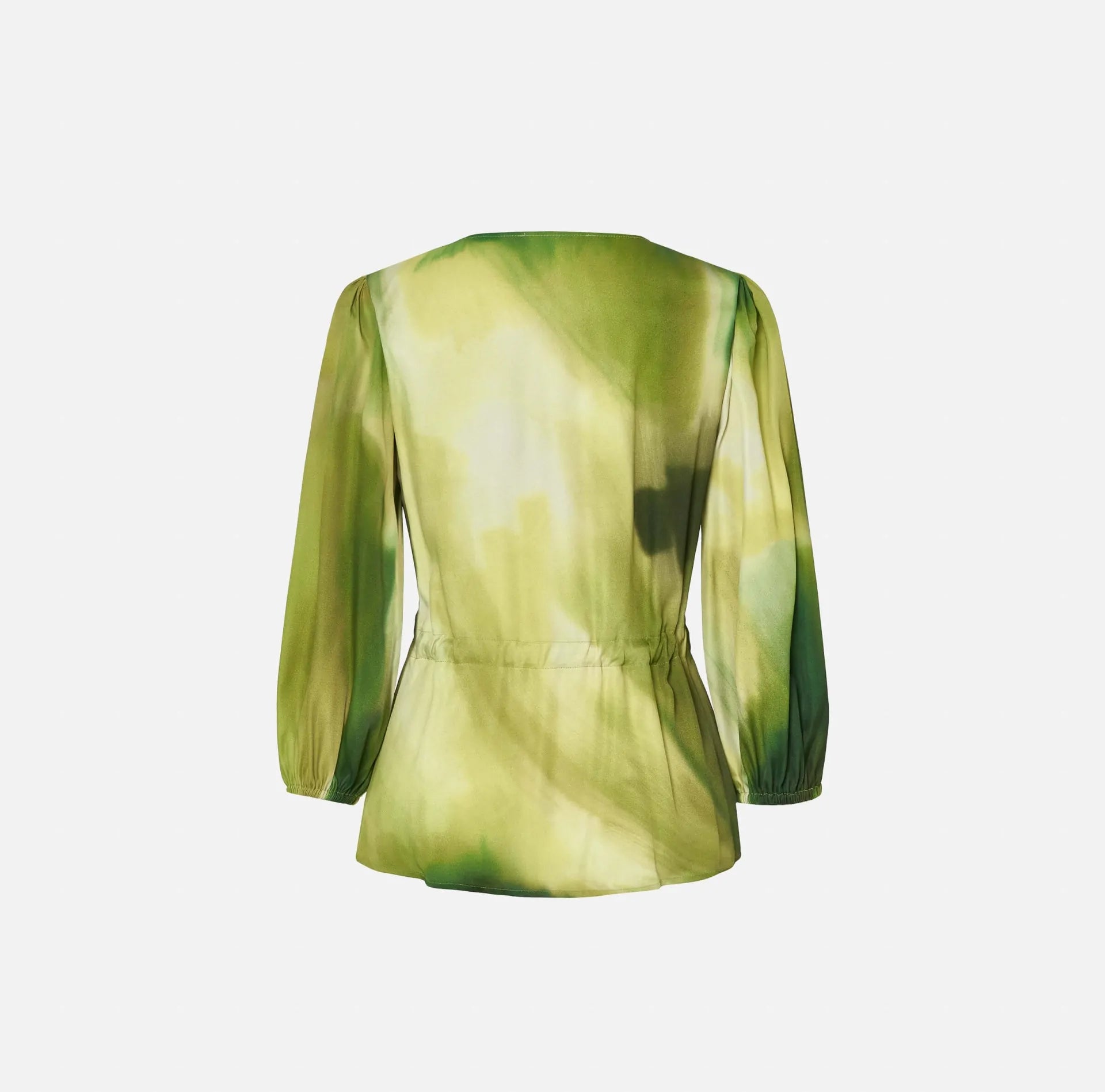 Plain blouse with V-neckline. Wide 3/4 sleeves with elastic at the bottom. Gathered detail on the shoulder. Fastens with matching buttons and has a tunnel to adjust the piece in the waist area. The fitting of the piece is loose. Fits large.