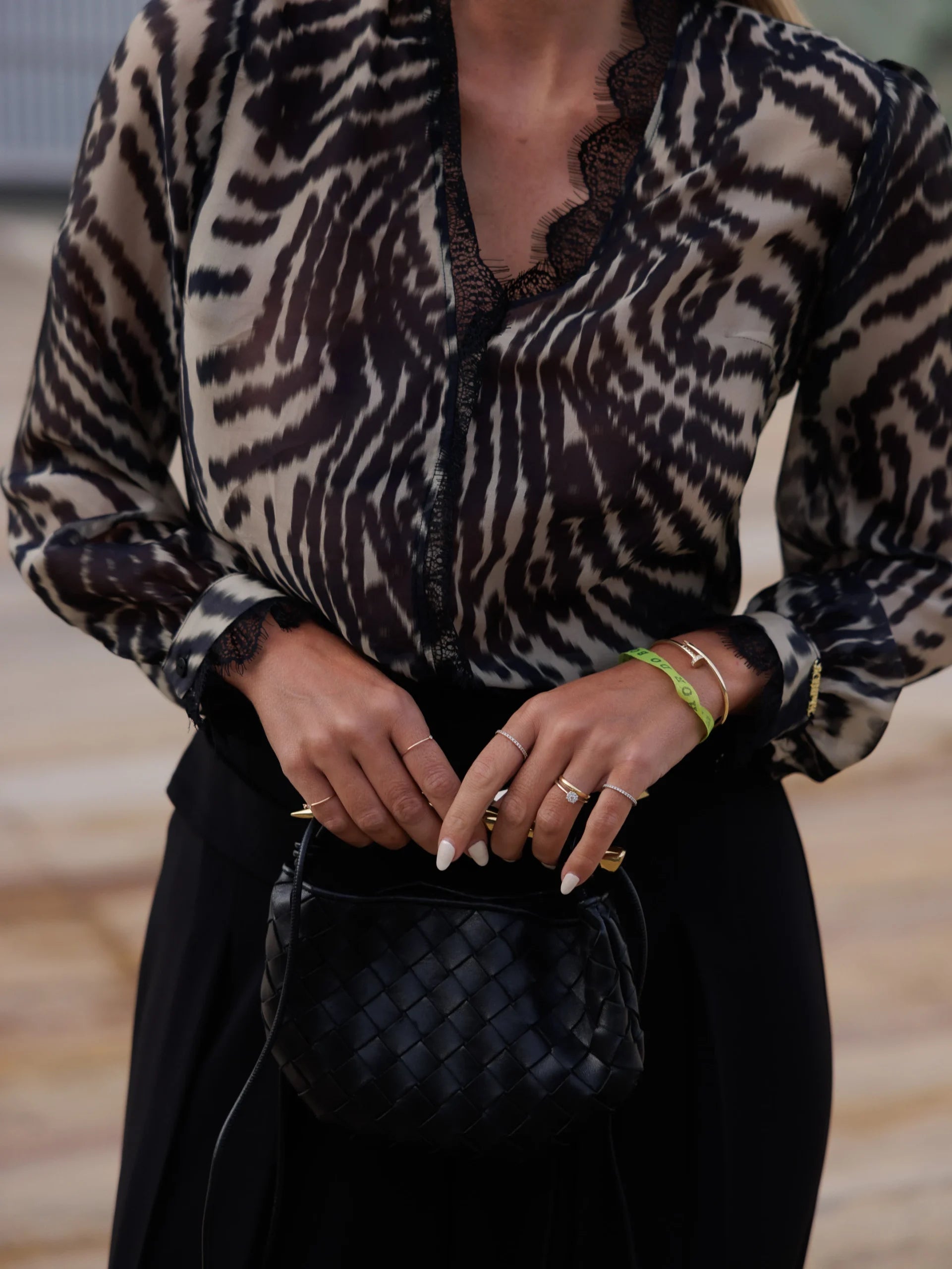 Printed blouse with V-neckline and lace detail. Long puff sleeves with lace detail at the ends, button fastening. The fitting of the piece is fluid.