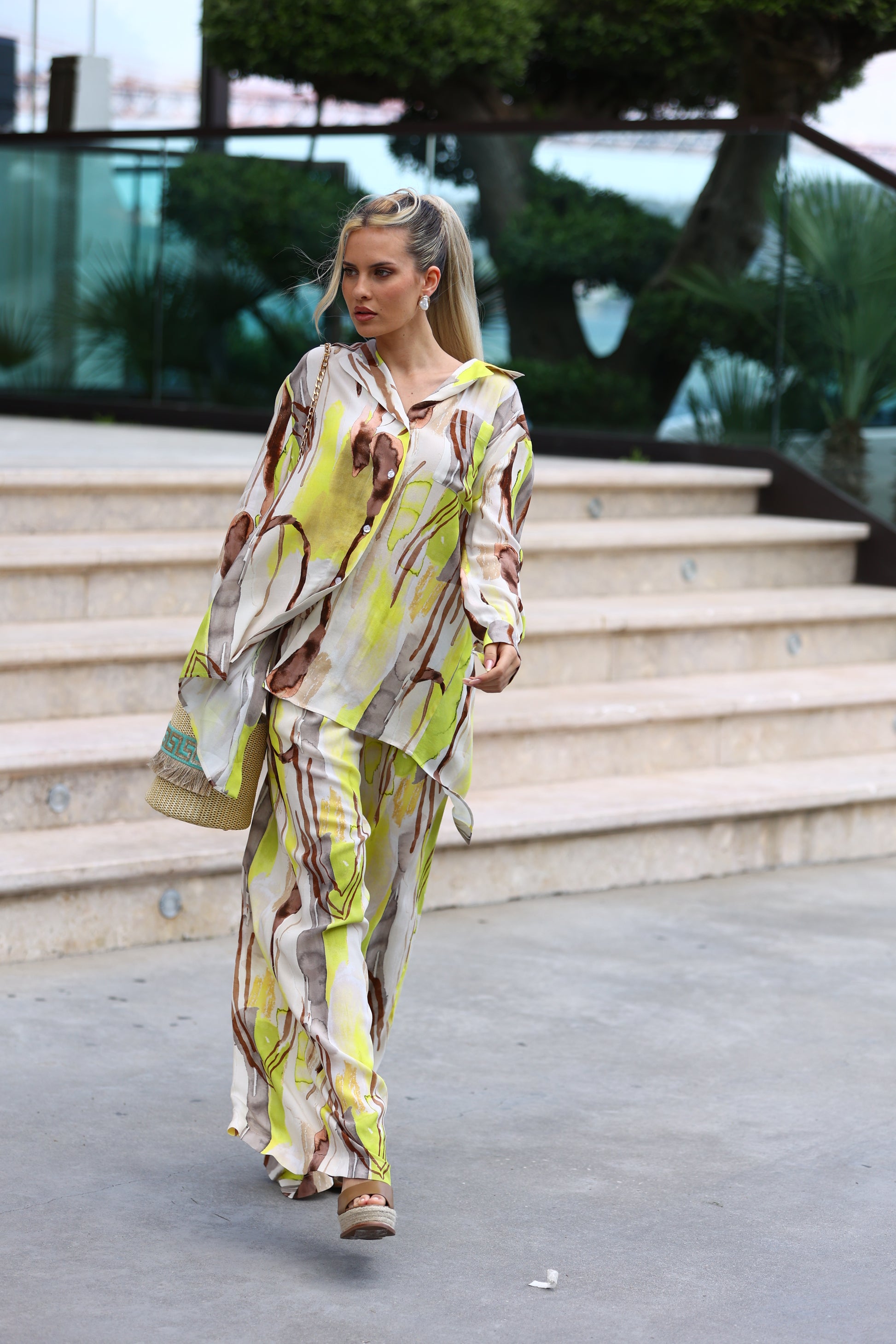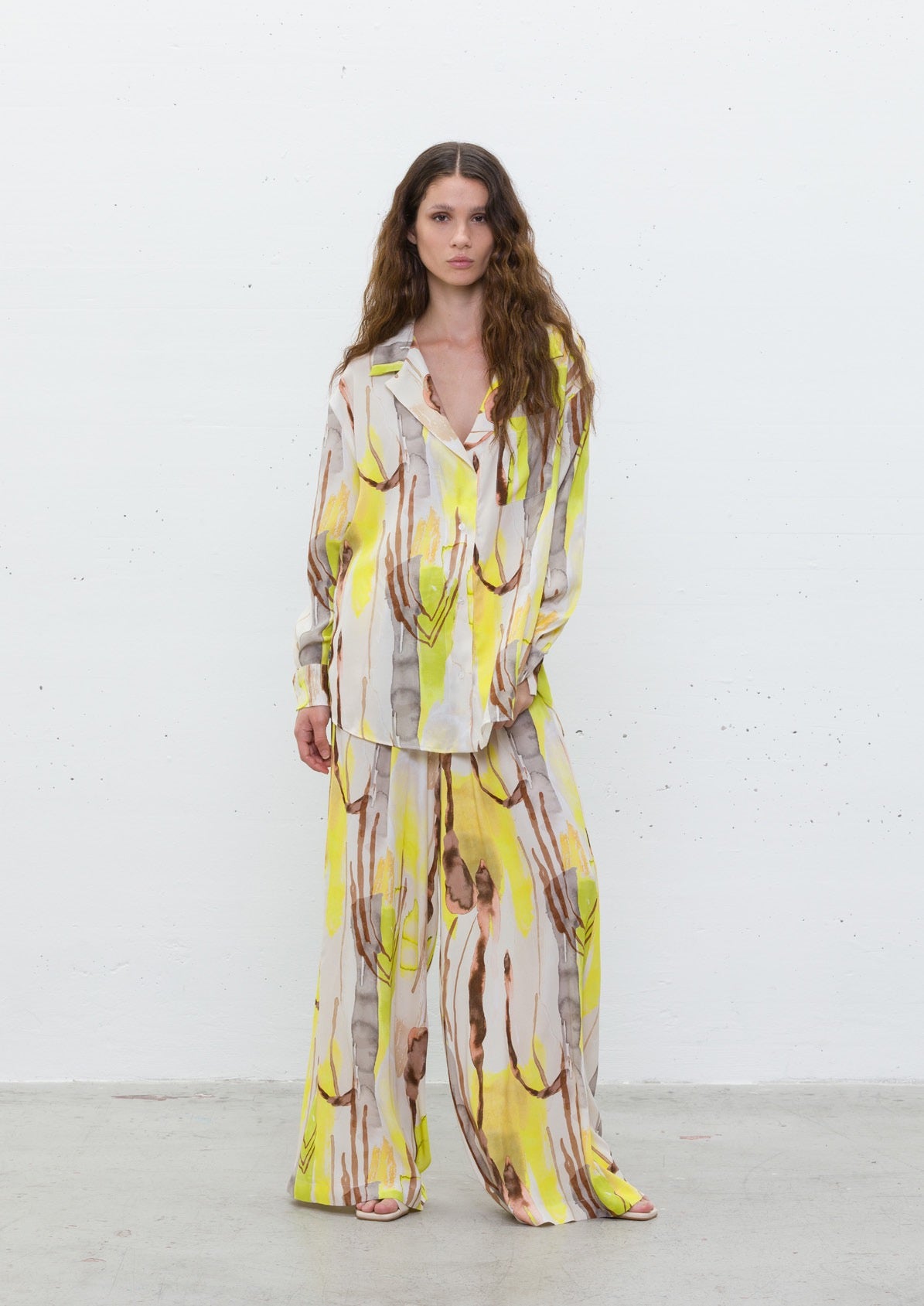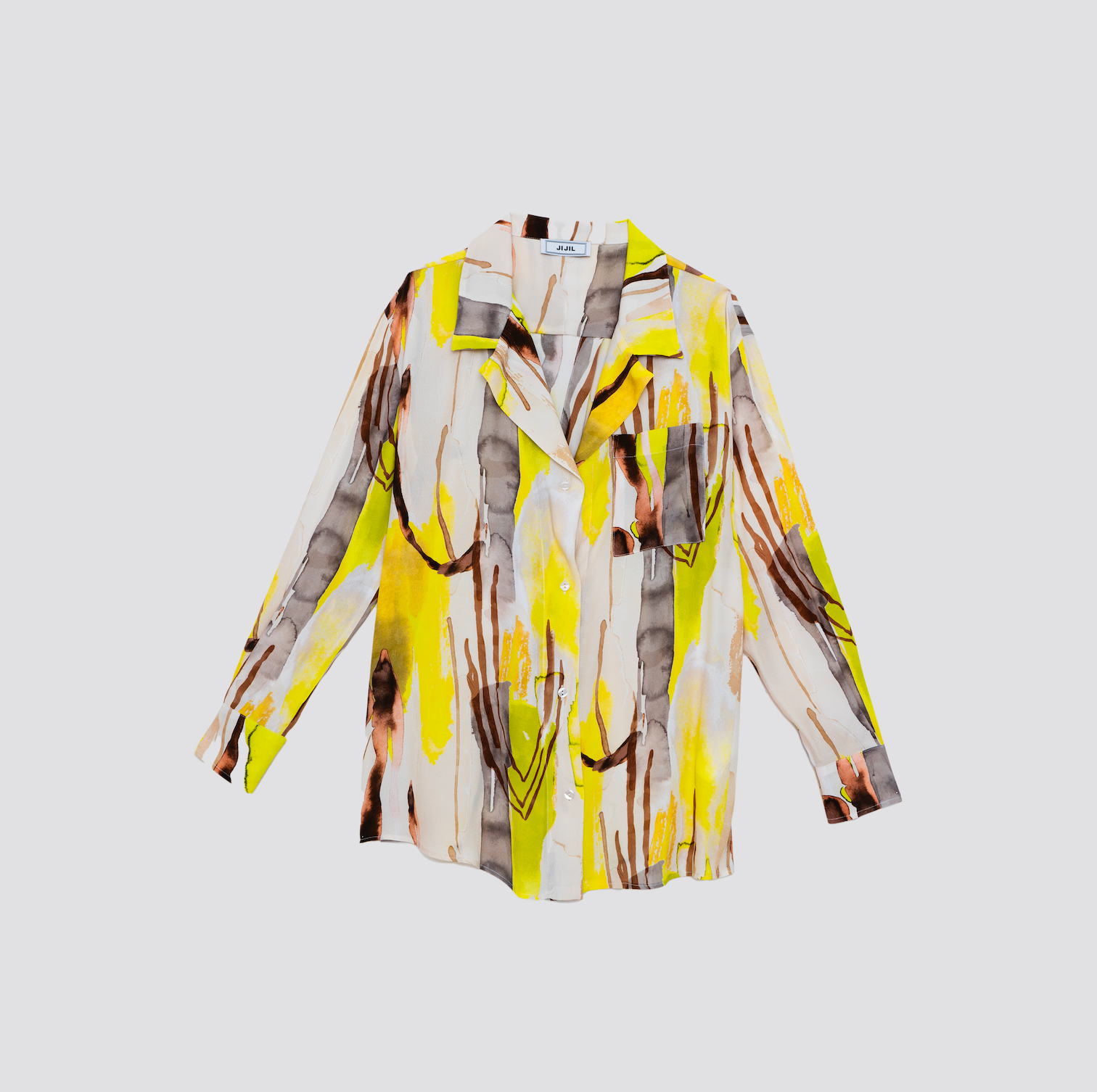 Camisa de manga comprida com estampa artística em tons vivos de amarelo, castanho e branco, confeccionada em tecido leve com toque acetinado. Possui gola clássica, fecho frontal por botões e bolso decorativo no peito. O caimento fluido aliado à estampa expressiva transforma esta peça numa escolha perfeita para dar cor e personalidade ao guarda-roupa.