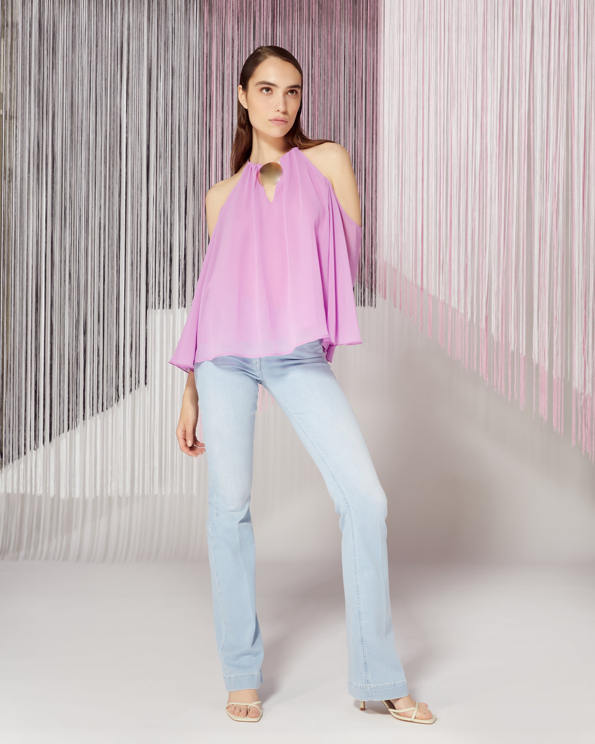 Blouse with wide, flowing sleeves, exposed shoulder detail and a gold necklace with clasp at the neck.