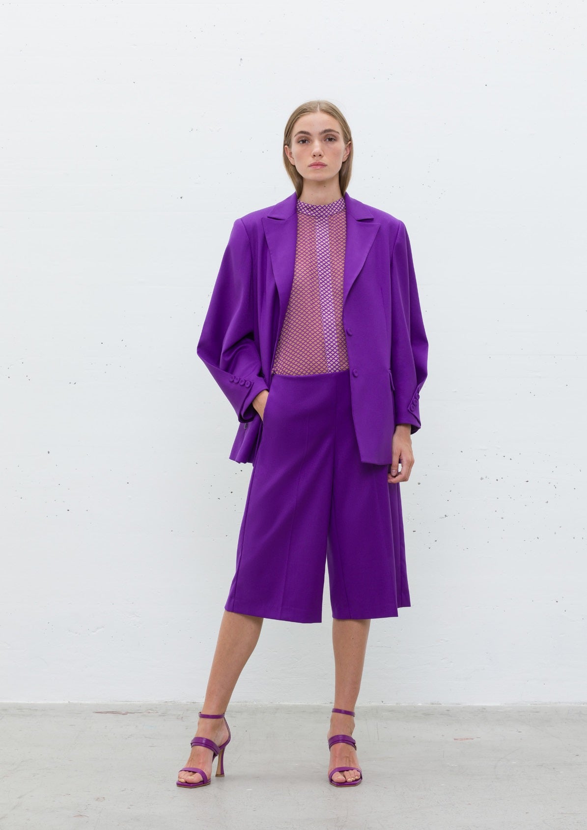 Blusa sem mangas em tecido leve e translúcido, com estampa gráfica em tons de roxo e rosa. A peça apresenta gola subida com detalhe de fechamento frontal oculto, criando um visual moderno e sofisticado. A modelagem reta proporciona conforto, enquanto a transparência discreta adiciona um toque sensual e contemporâneo.