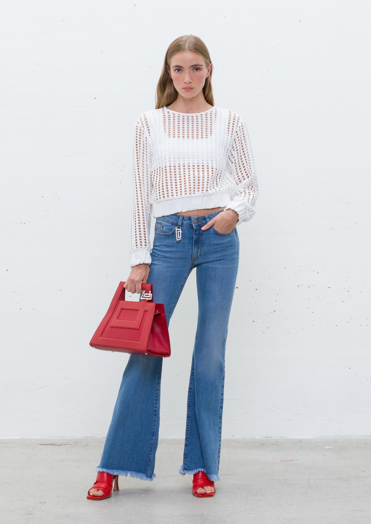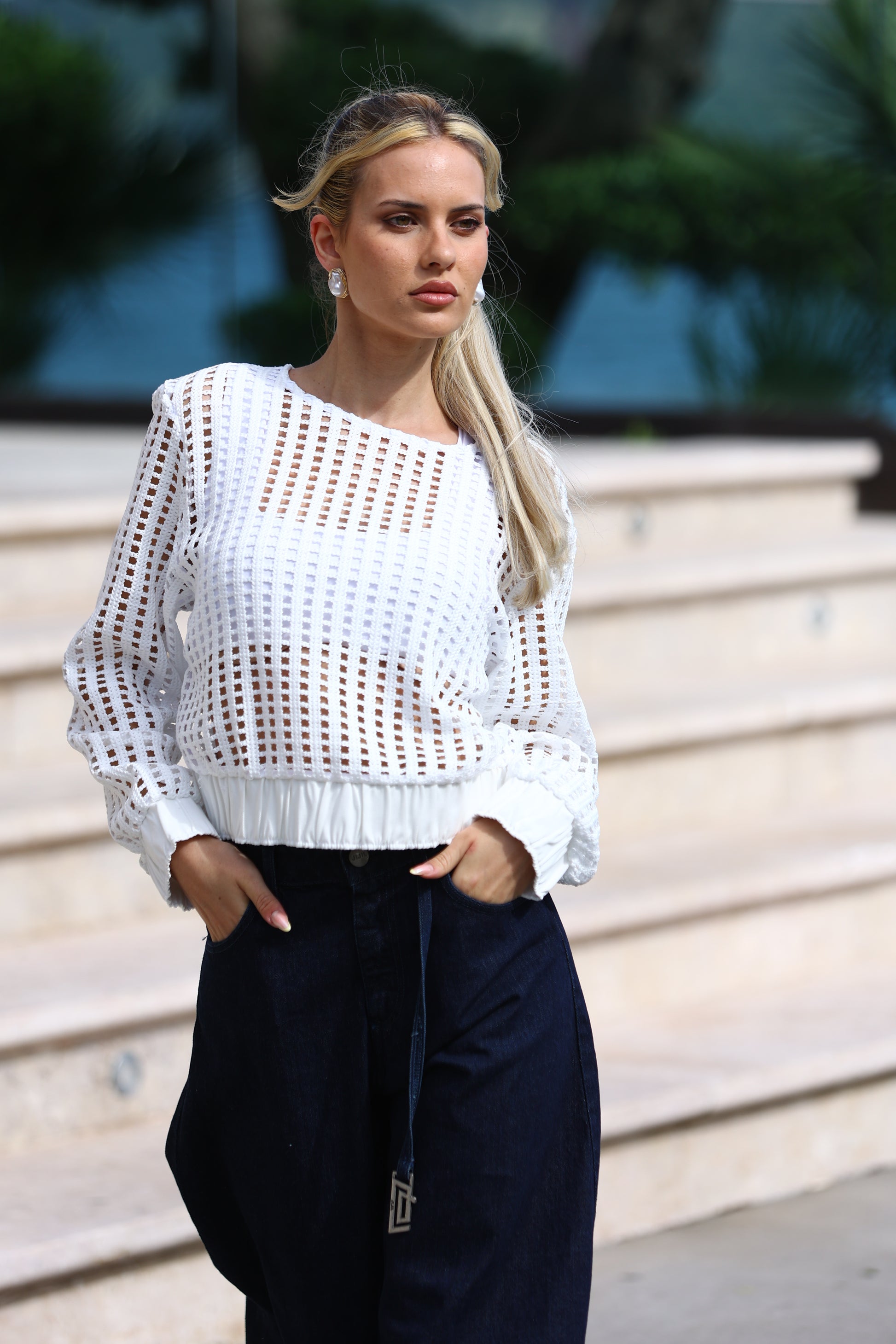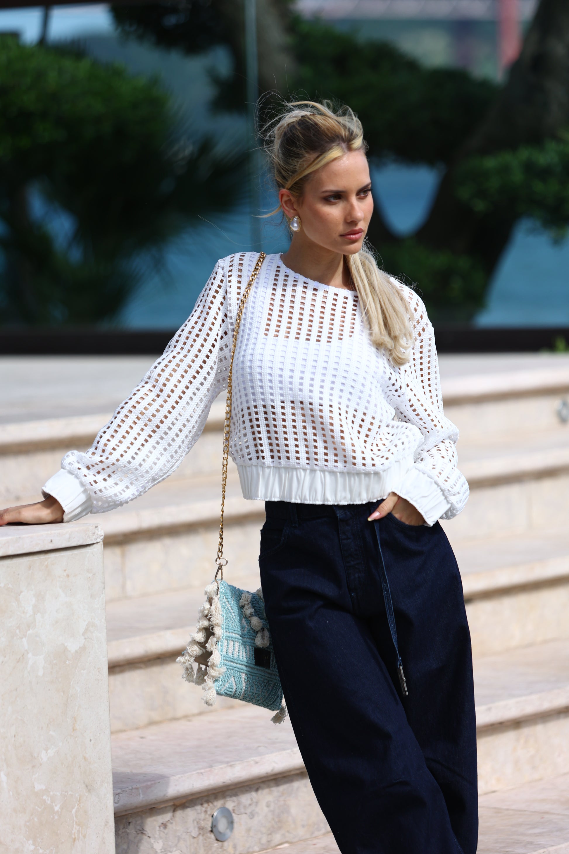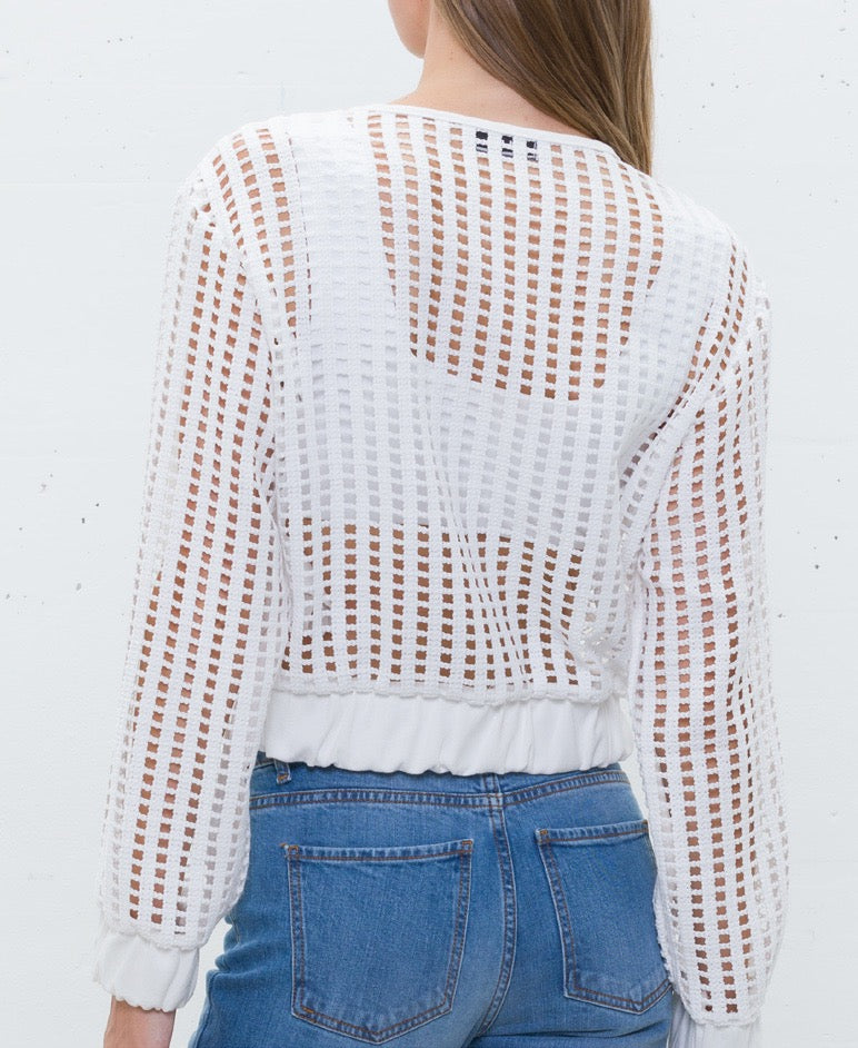 Blusa de manga comprida com textura vazada em padrão geométrico, ideal para looks de meia-estação. Possui elástico nas extremidades das mangas e na barra, criando um efeito levemente balonê que adiciona volume e modernidade à silhueta. Top interior vendido em separado