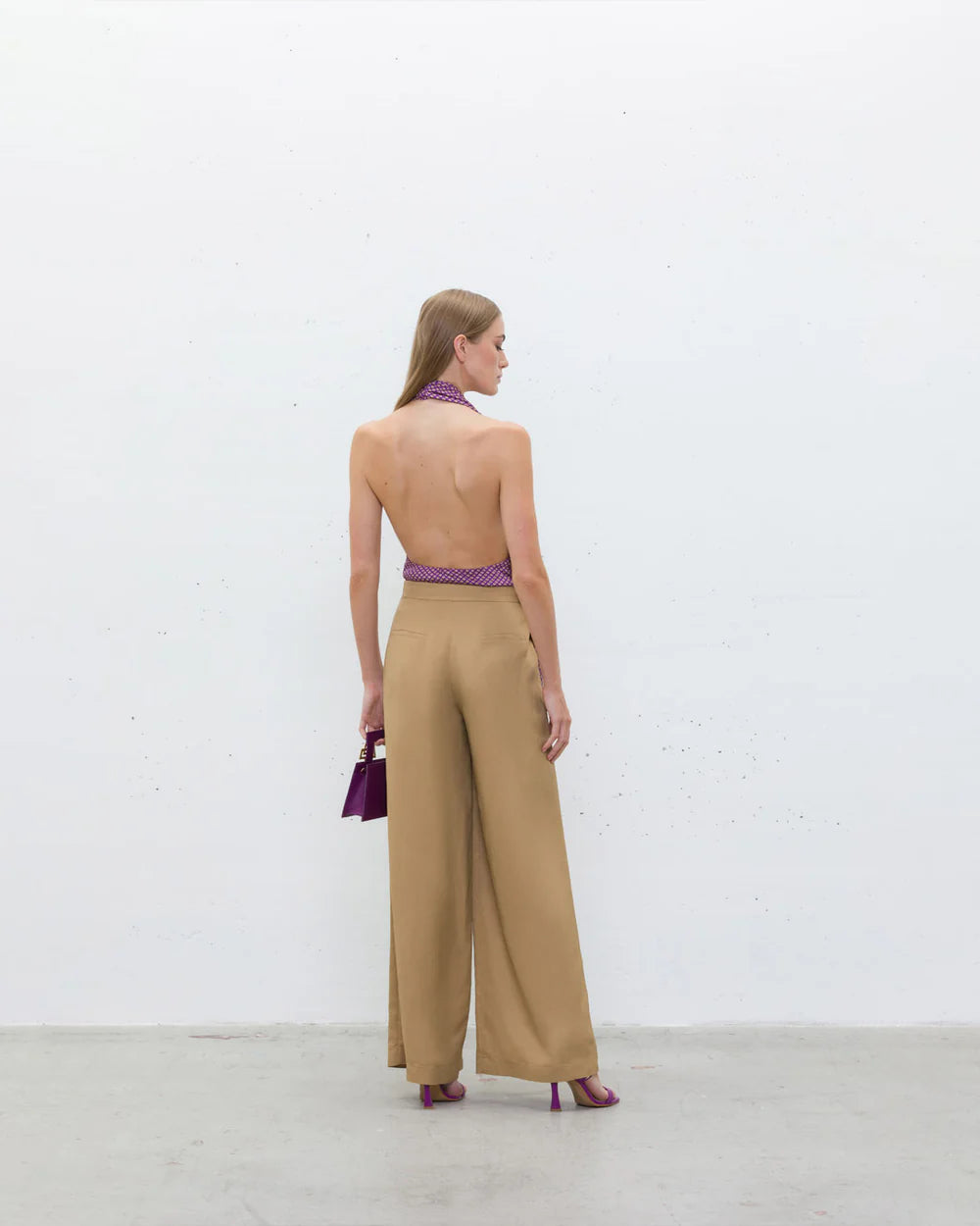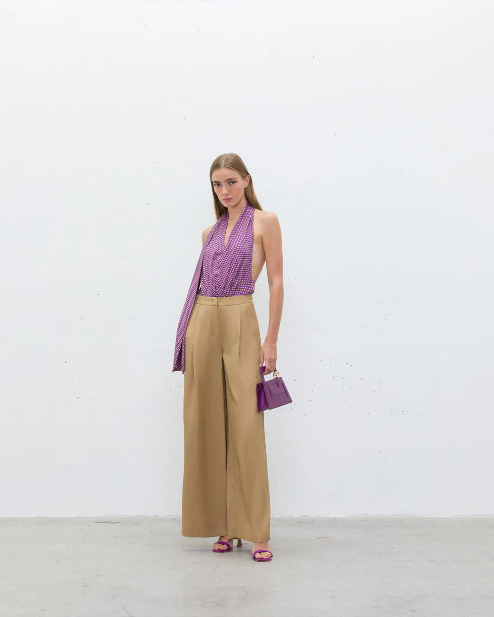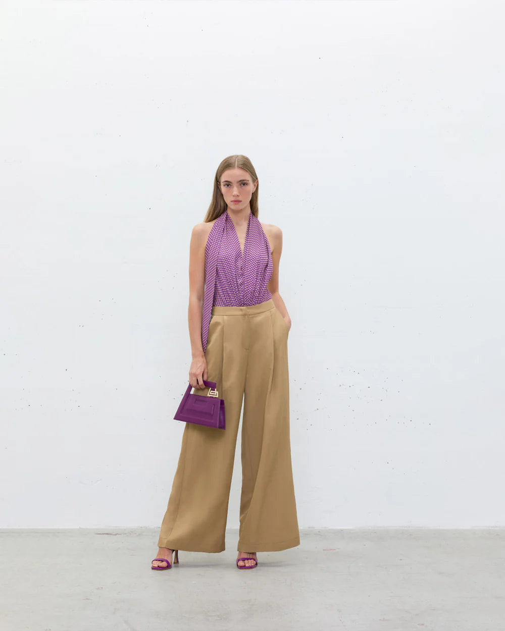 Body elegante com estampa gráfica em tons de roxo e rosa, confeccionado em tecido leve e fluido. Possui modelagem assimétrica com uma manga longa e decote profundo em V, trazendo um toque ousado e sofisticado. O cós elástico ajusta-se à cintura, valorizando a silhueta, enquanto a parte inferior em tom nude garante conforto e praticidade com fecho de botão de pressão.