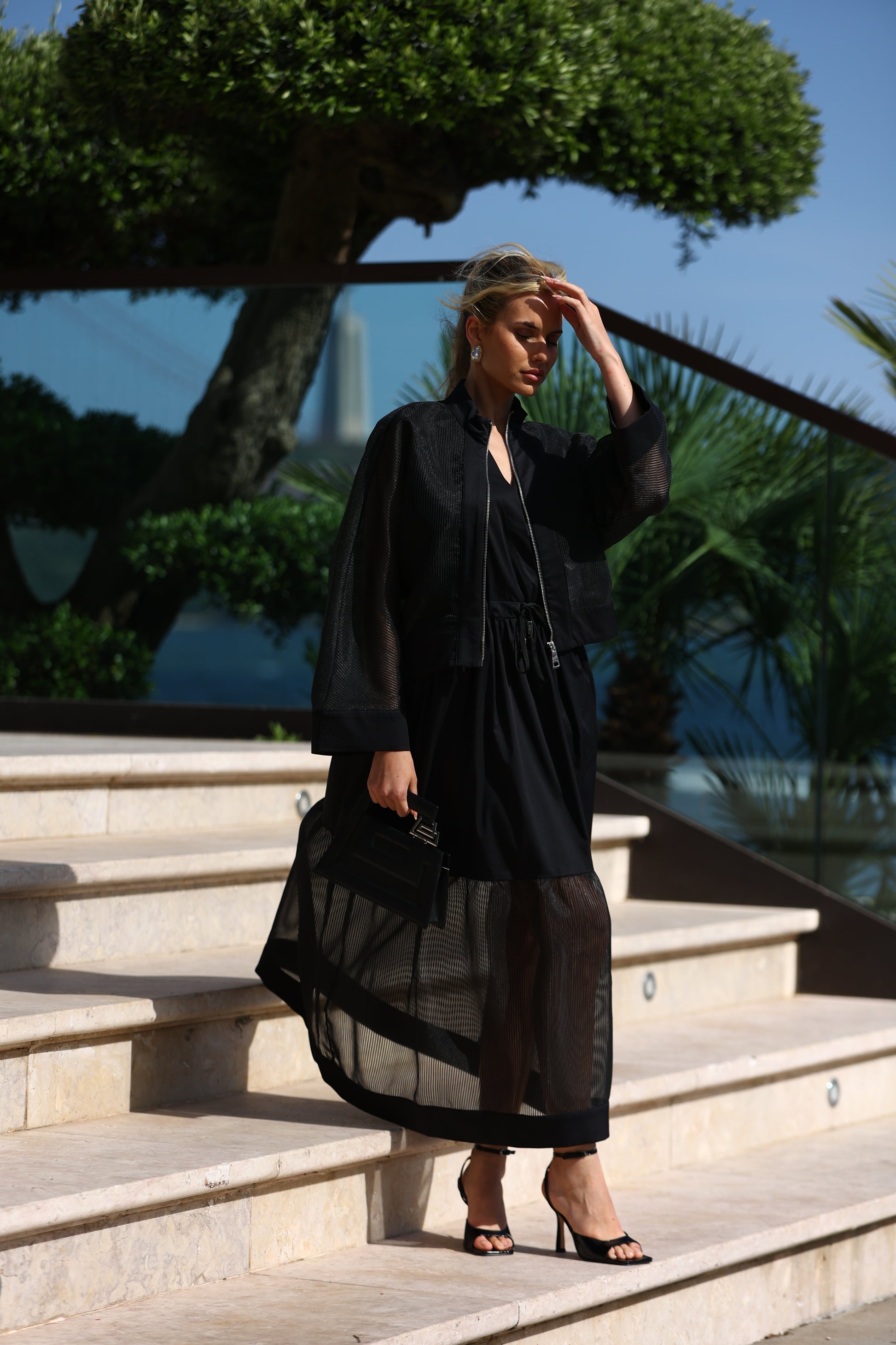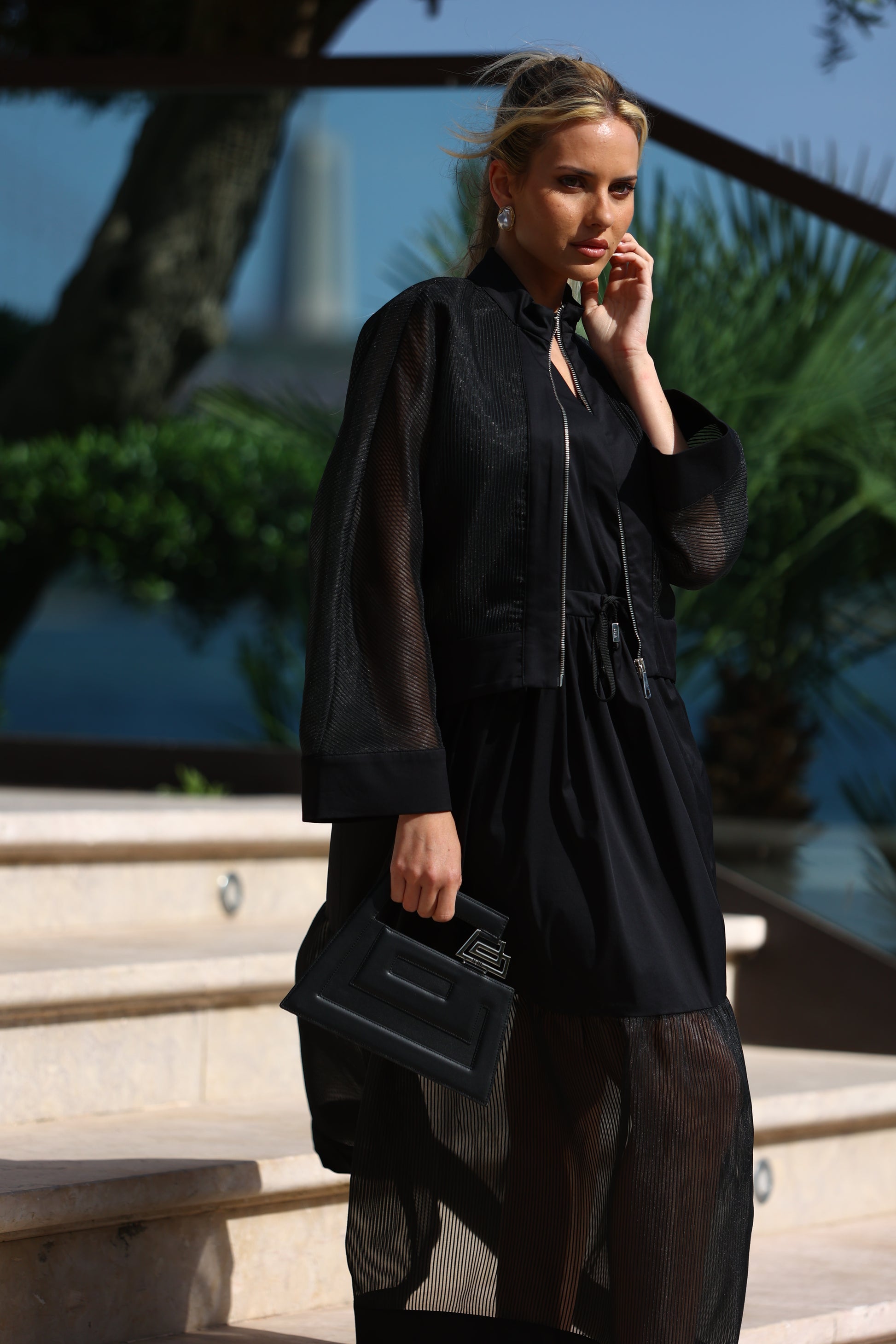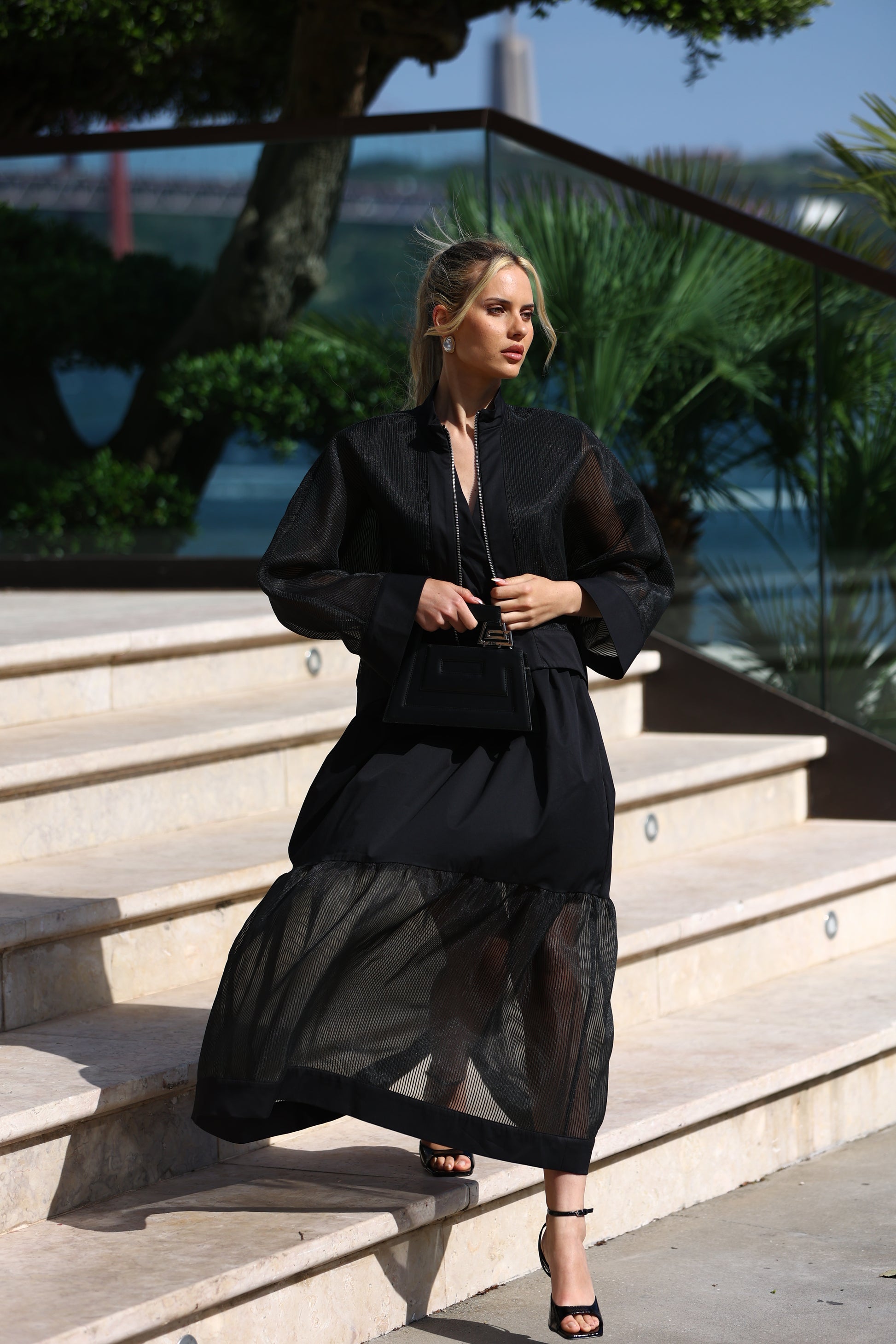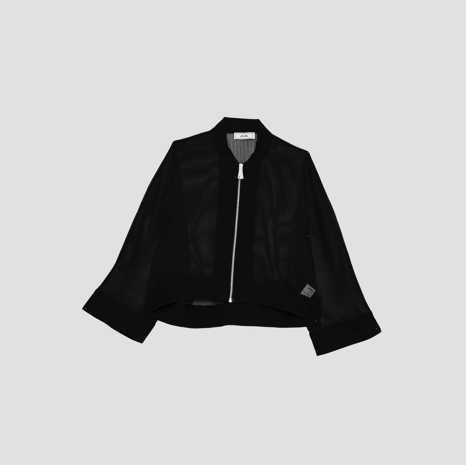 Jaqueta bomber de tecido leve com transparência sutil e fecho frontal em zíper. Com gola estilo esporte e punhos amplos, a peça combina uma estética urbana com um toque elegante e feminino. O caimento fluido e moderno a torna perfeita para sobreposições em dias amenos.