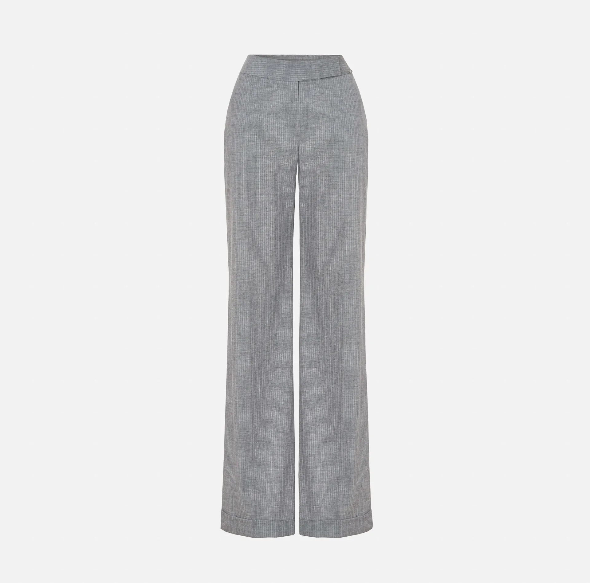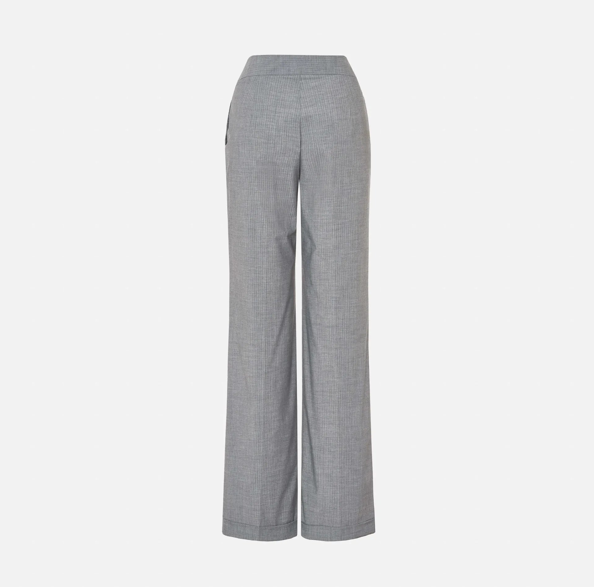 Long trousers in striped fabric with straight fit and high waist. Fastens with metal hooks and a front zip that provides a more precise fit to the waist. Has slash pockets.