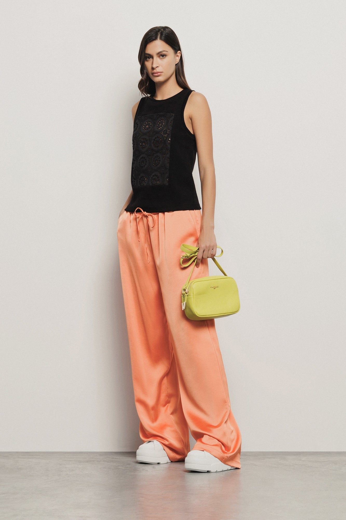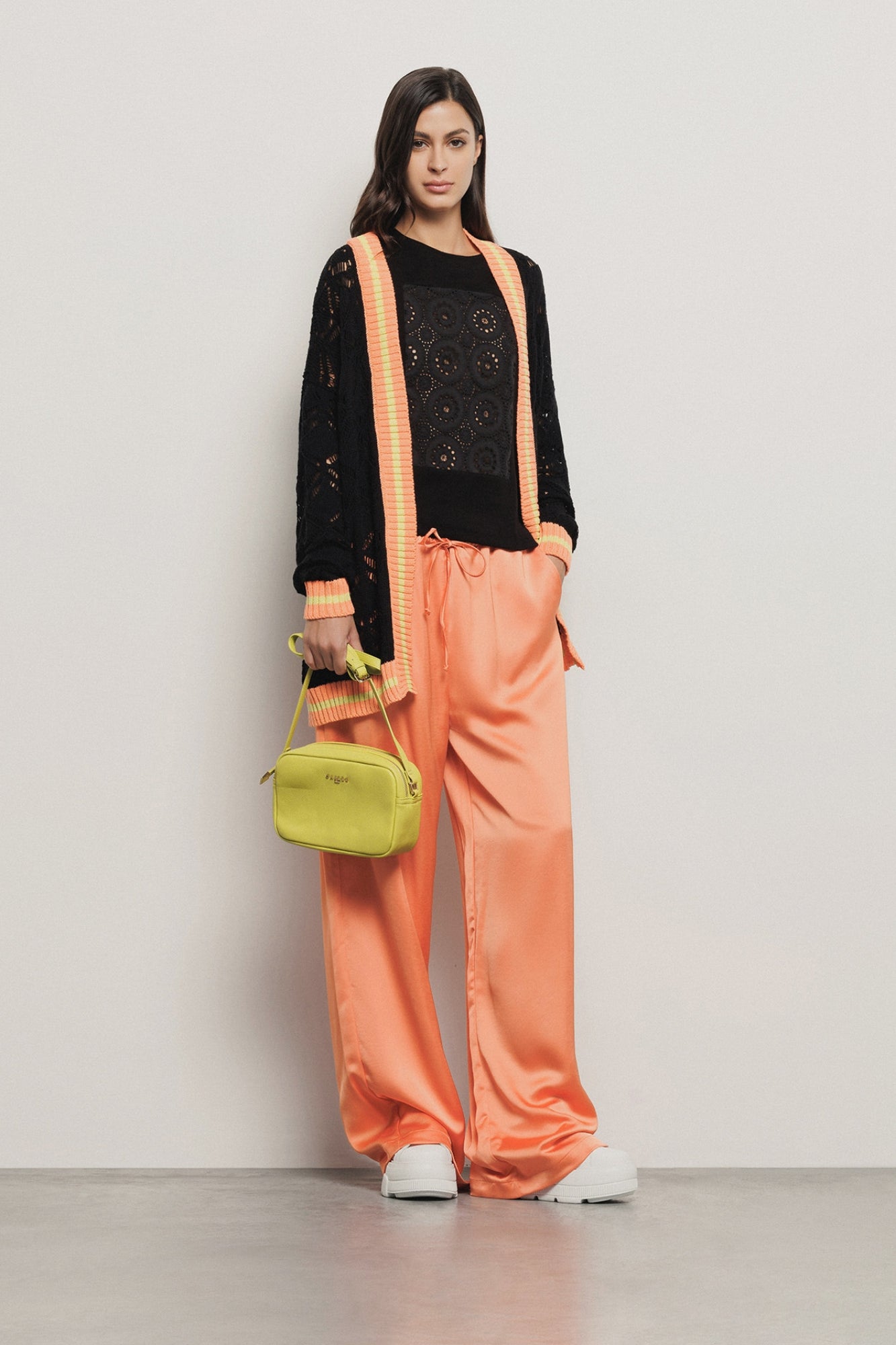 Straight-cut palazzo pants in satin, available in Melon Orange and Black.
