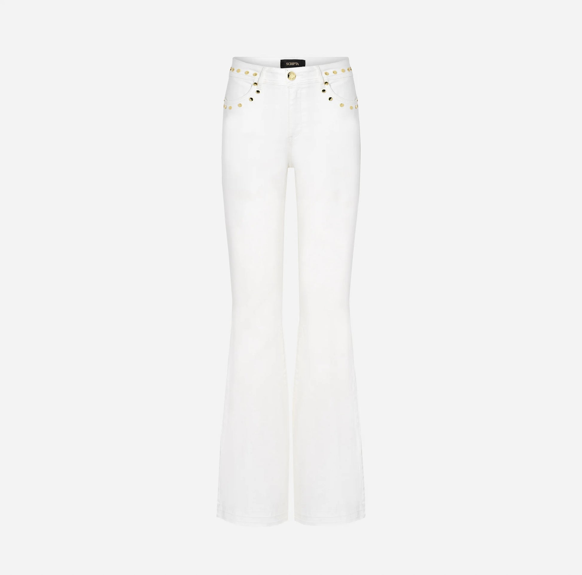 White high-waisted bell-cut jeans. Custom rivet detail on the pocket outline. The pants fasten with a front zip.