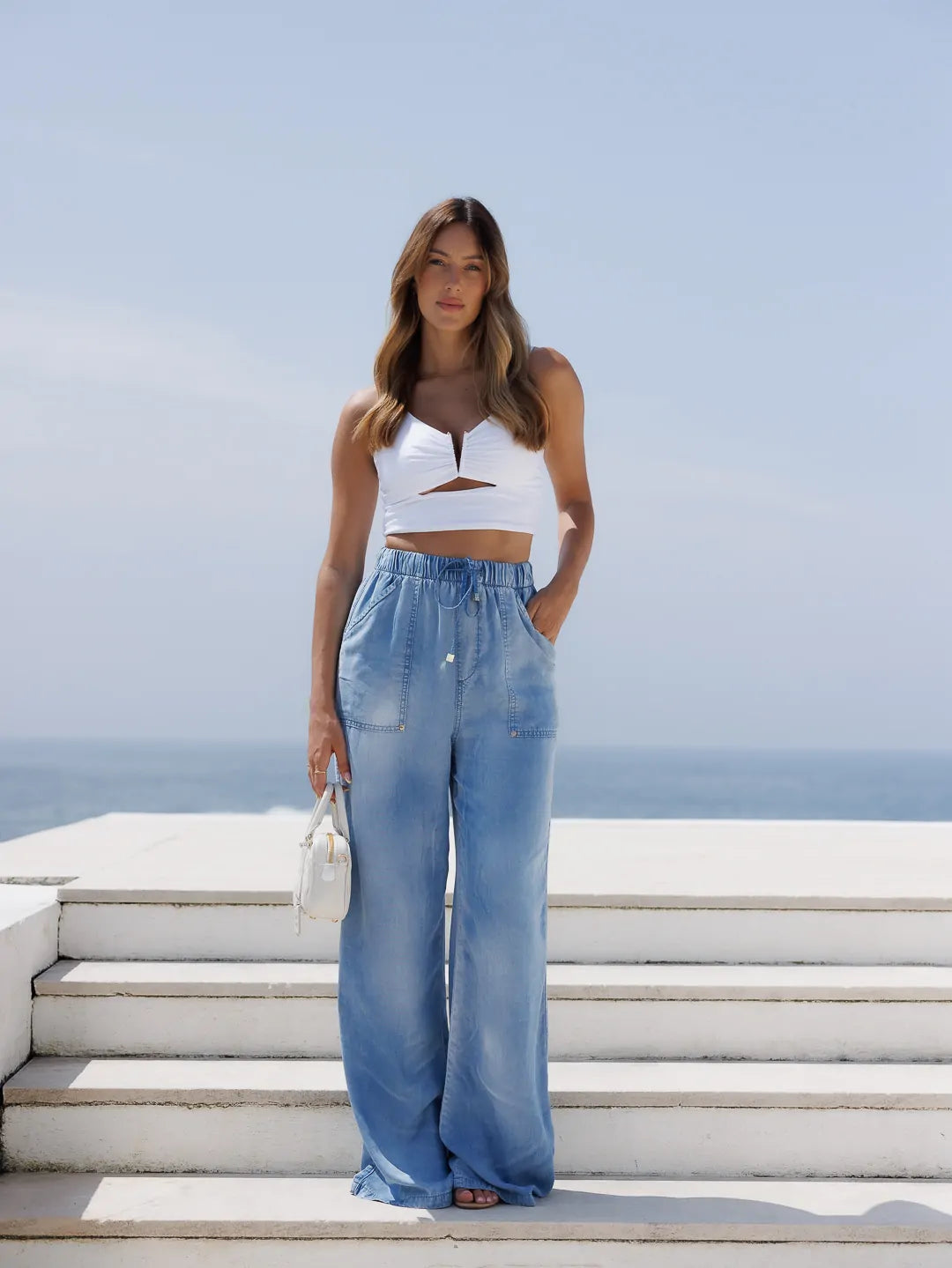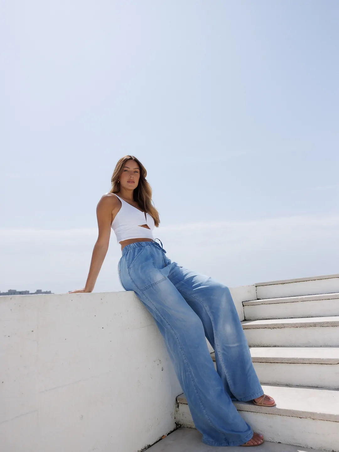 Calça de ganga azul efeito tensão com cintura subida e corte largo. Aperta na cinta com um cordão e terminais metálicos personalizados. Detalhe de bolsos frontais com rebites personalizados.