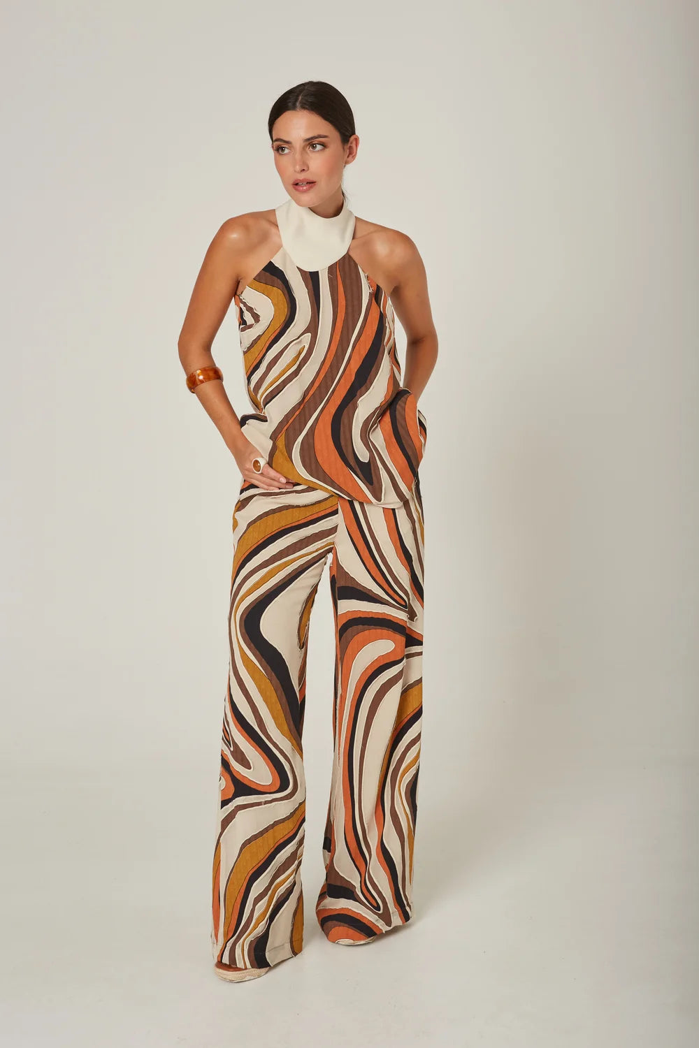 Orange dexter long flowing trousers with ruffle detail at the back. They have an incredible drape. Perfect to combine with the matching blouse from the collection and create a totally on-trend look.