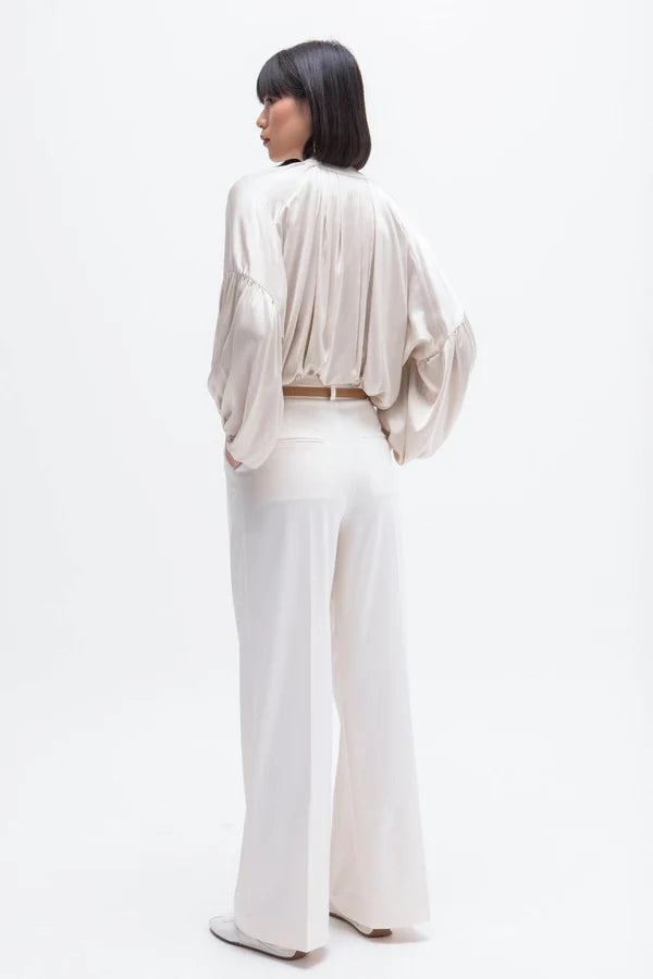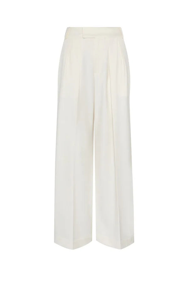 Calça pantalona bege claro. Apresenta um design estruturado, de cintura subida, com um cós largo e direito que emoldura a parte superior da peça. As pregas emergem da cintura na frente, acrescentando volume e movimento às pernas. A calça tem uma silhueta ampla e fluida da anca à bainha, com um comprimento total até ao chão. A parte frontal possui um fecho de carcela invisível. As linhas do design são limpas, com costuras discretas que reforçam o seu aspeto elegante e polido.
