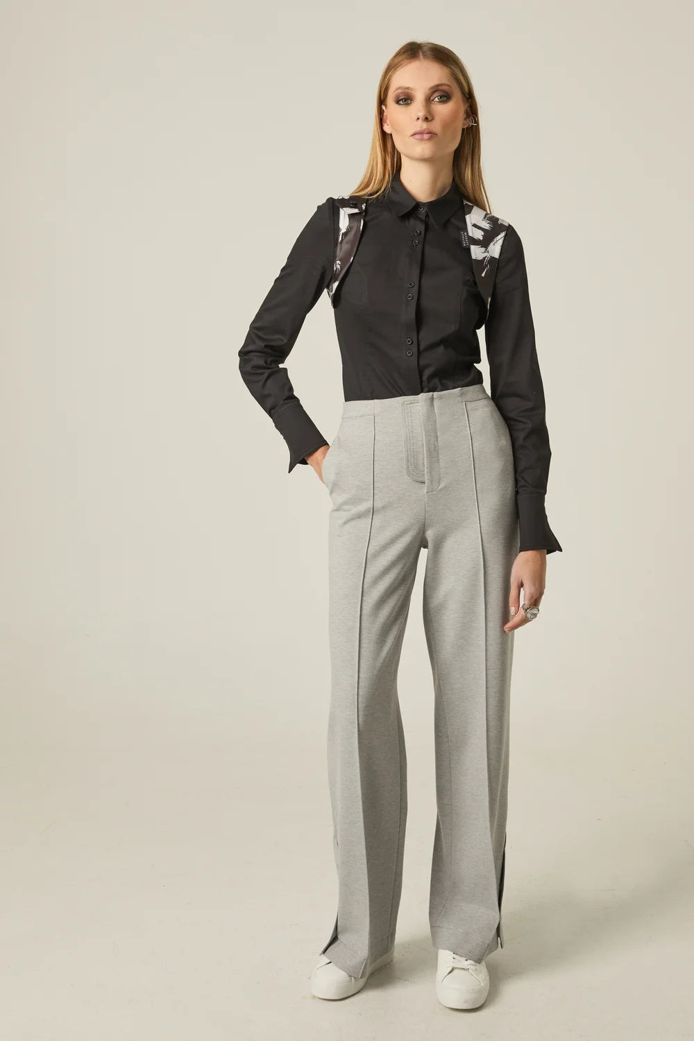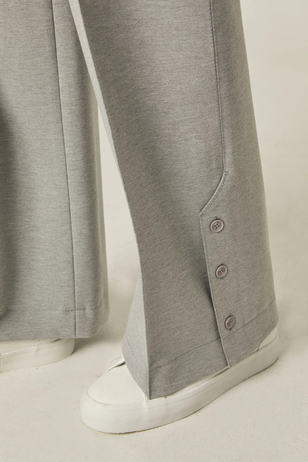Straight-cut, high-waisted gray pants that fit at the waist, helping to accentuate the silhouette. They stand out for their slit hem and buttons on the side. These pants are a perfect example of a wardrobe staple. Their timeless design and neutral color make them easy to mix and match.