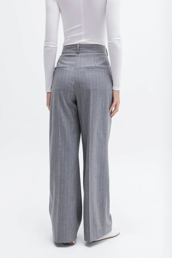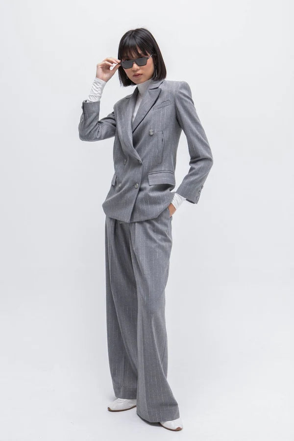 Esta calça faz parte do blazer risca de giz da coleção. Confecionada com o mesmo tecido risca de giz cinza claro, apresenta um corte amplo e fluído, com uma silhueta que cai a direito da cintura até à base. O design incorpora pinças frontais macias que estruturam a parte superior do corpo e geram movimento ao caminhar. Possui cintura subida com presilhas funcionais e fecho frontal oculto. O tecido, suave ao toque e com um bom caimento, mantém o formato sem rigidez, ideal para criar looks discretos ou combinações mais criativas com peças casuais. O seu design intemporal e o seu caimento solto tornam esta peça tão confortável quanto sofisticada.