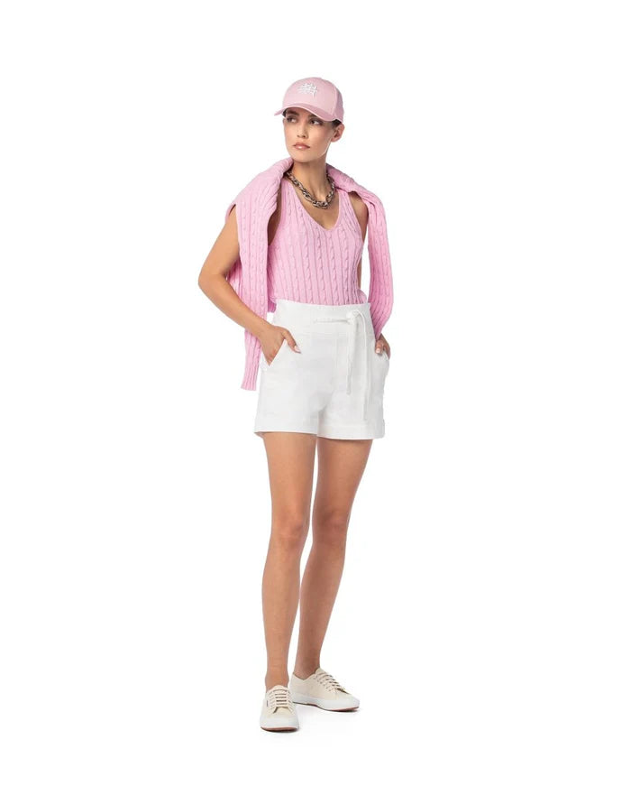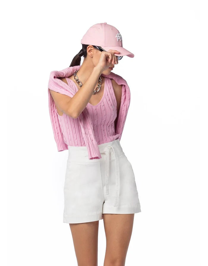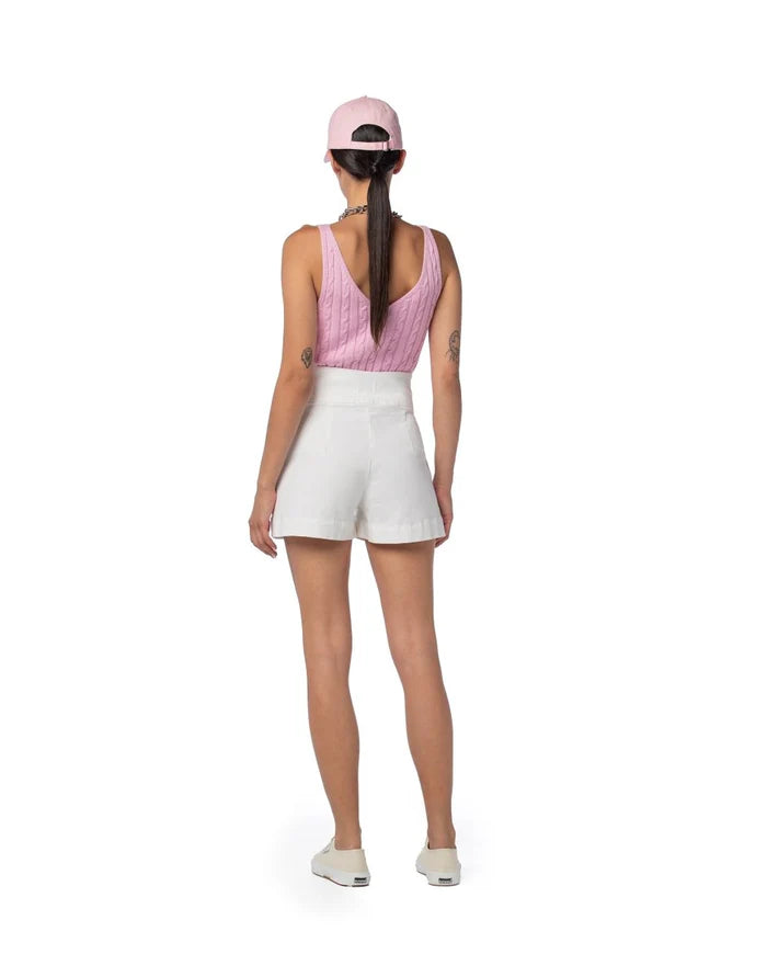 High-waisted bull shorts with internal drawstrings and hidden side zipper. Flared design with front pockets and high waistband.