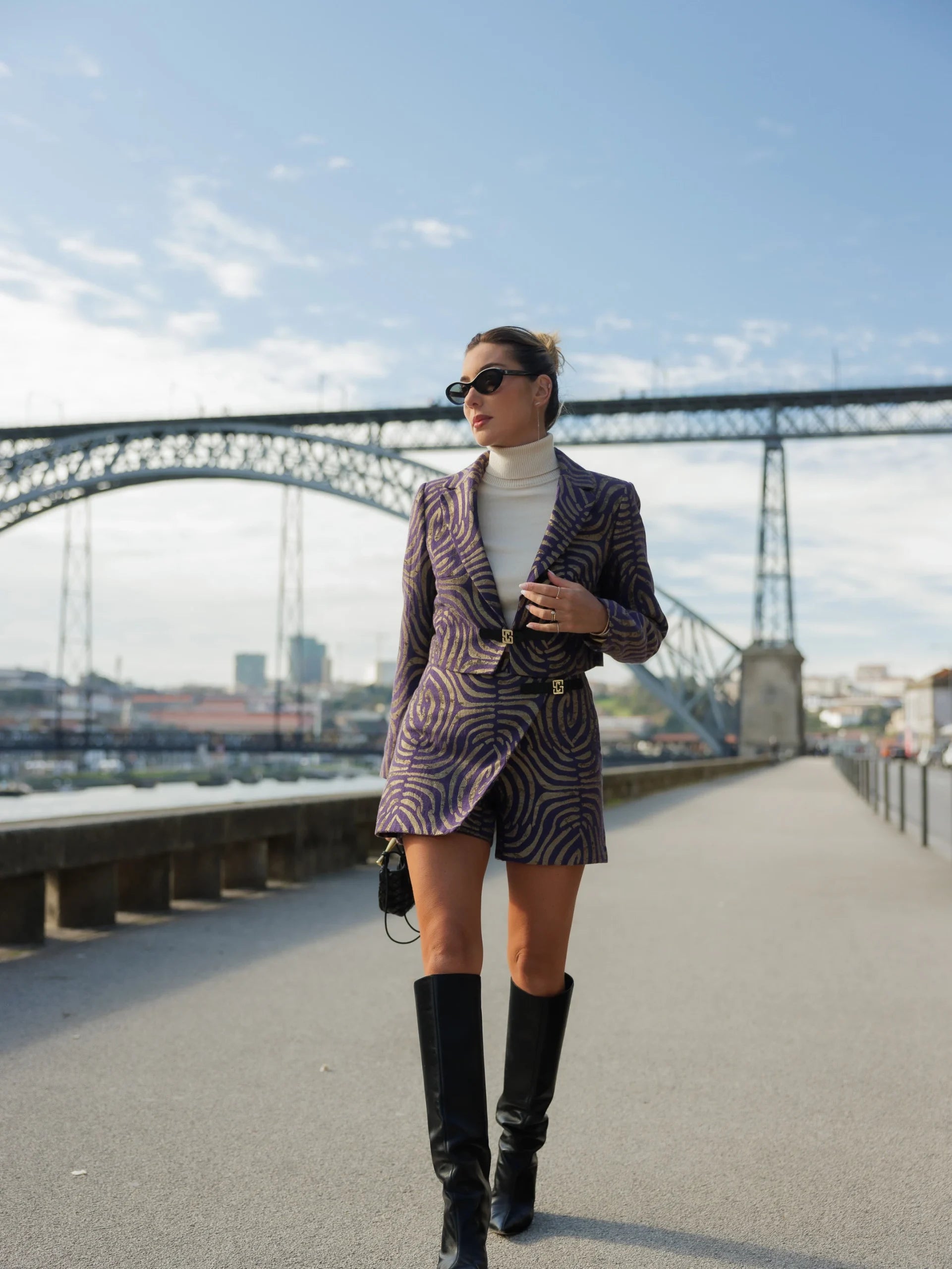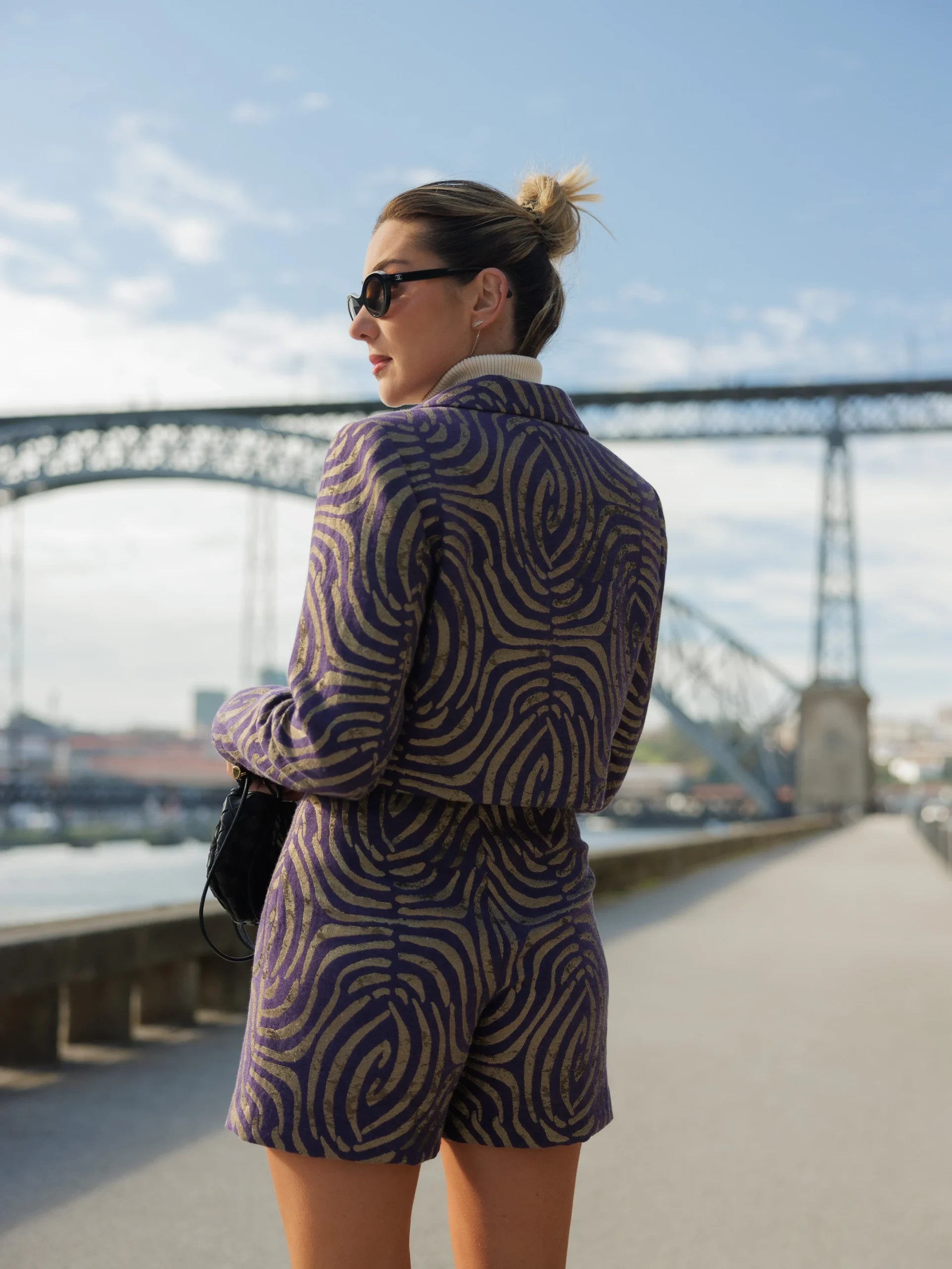 Short jacquard shorts with overlapping insert fixed by personalized alarm. Fastens with invisible zipper on the side. The fitting of the piece is adjusted.