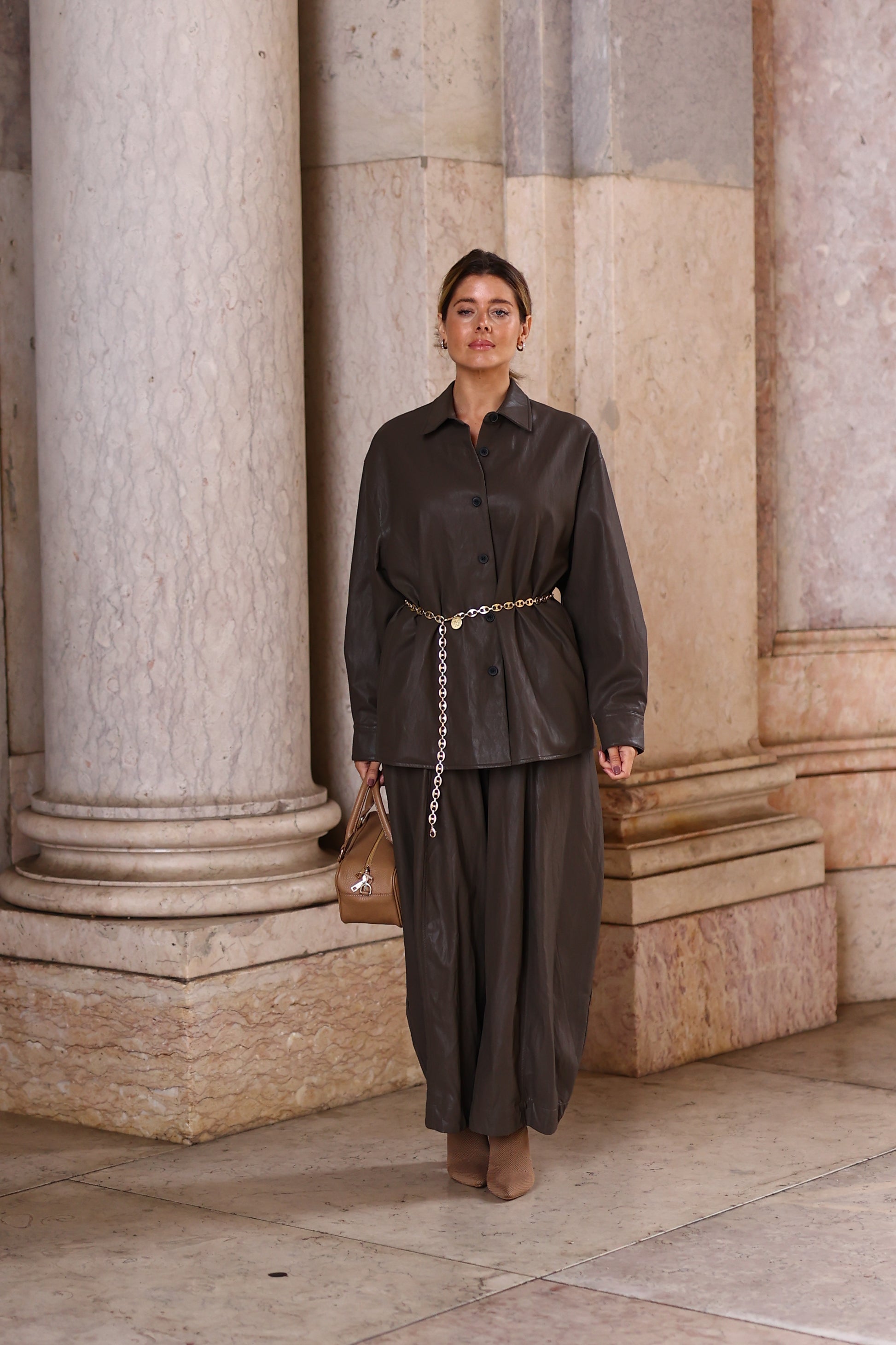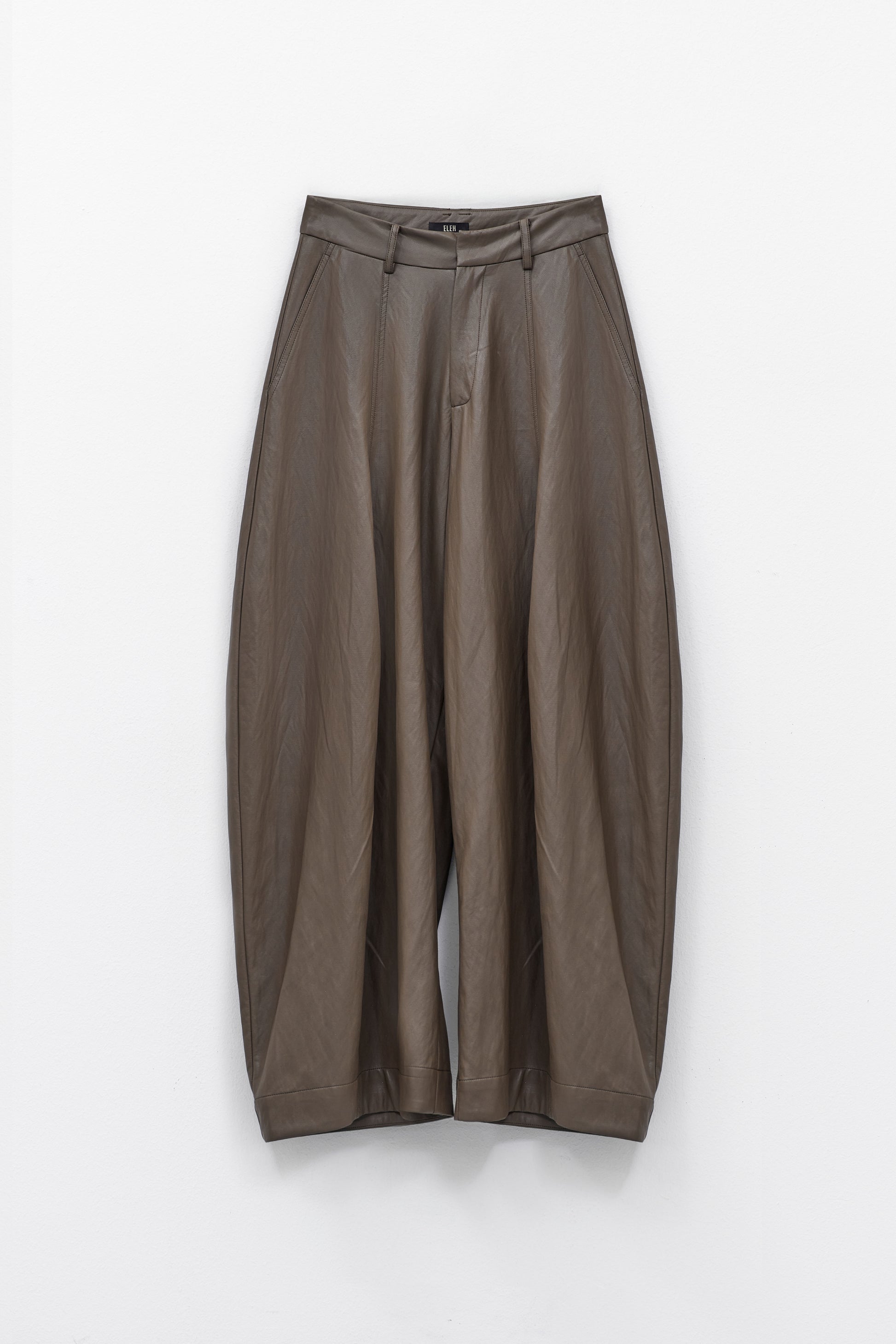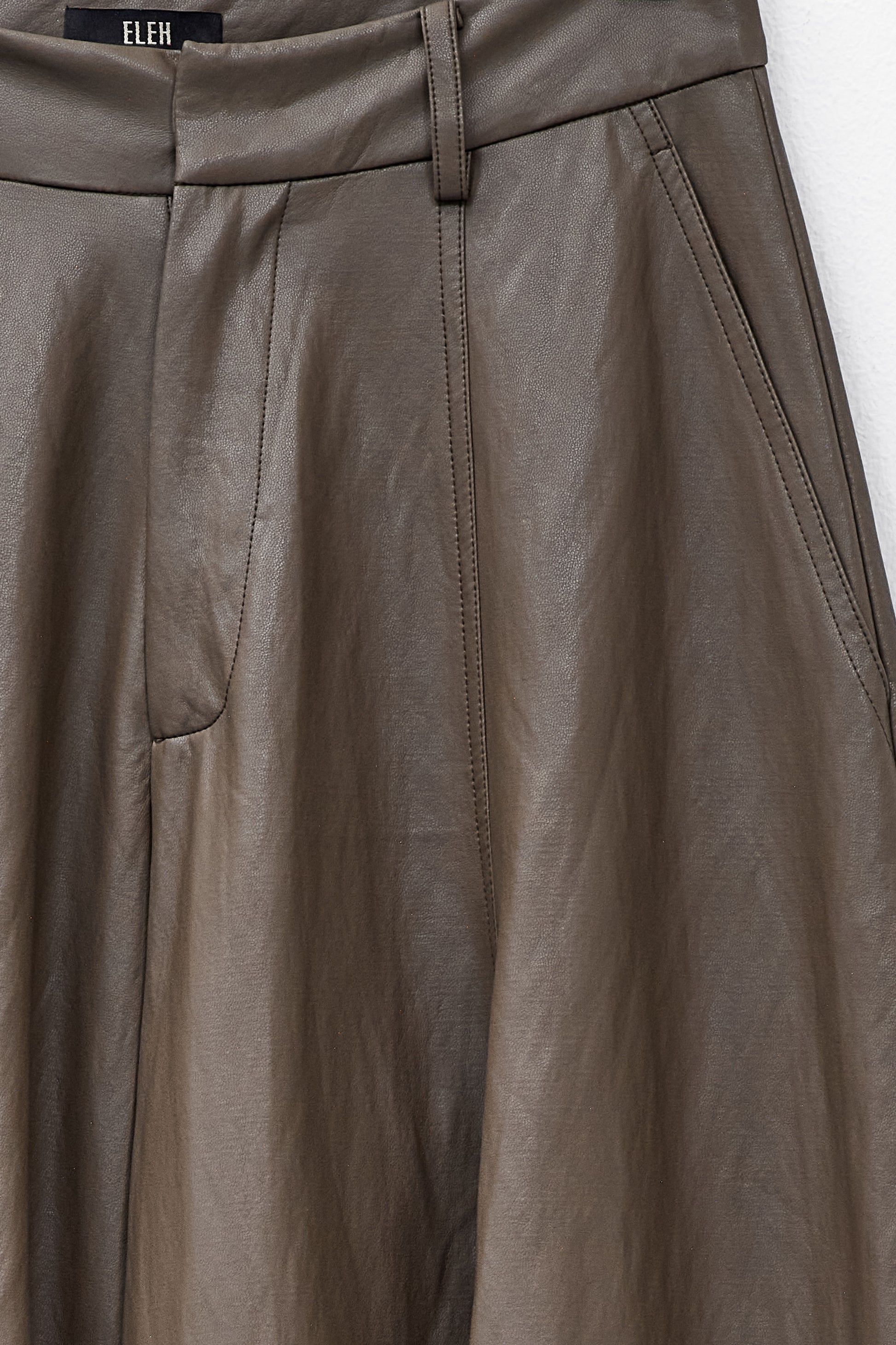 Calças em ecopele ELEH com corte baggy e cintura média, perfeitas para um look contemporâneo e cheio de estilo. A perna arredondada e o acabamento suave conferem conforto e um visual moderno, ideal para coordenar com malhas, camisas ou tops mais justos.