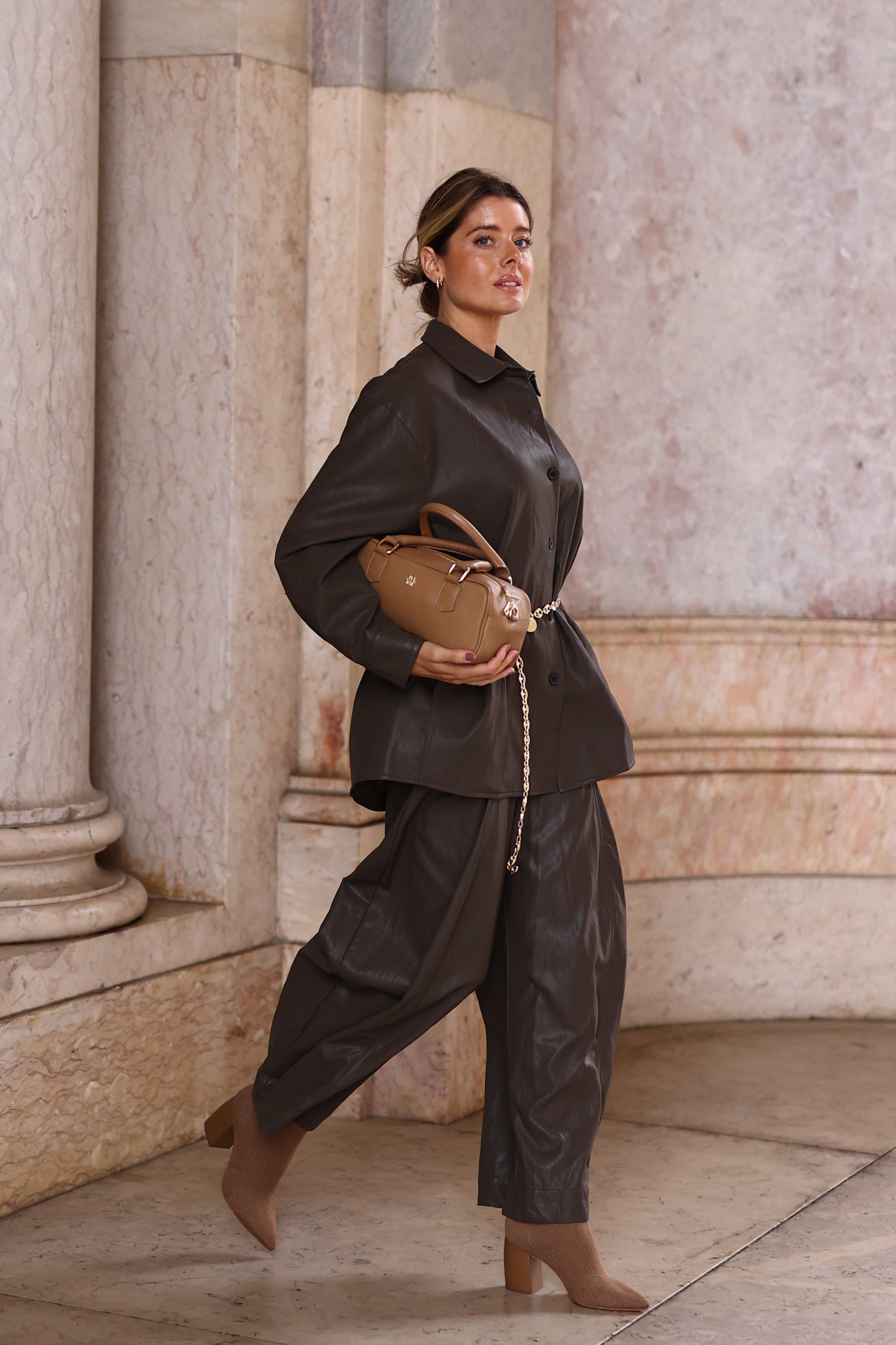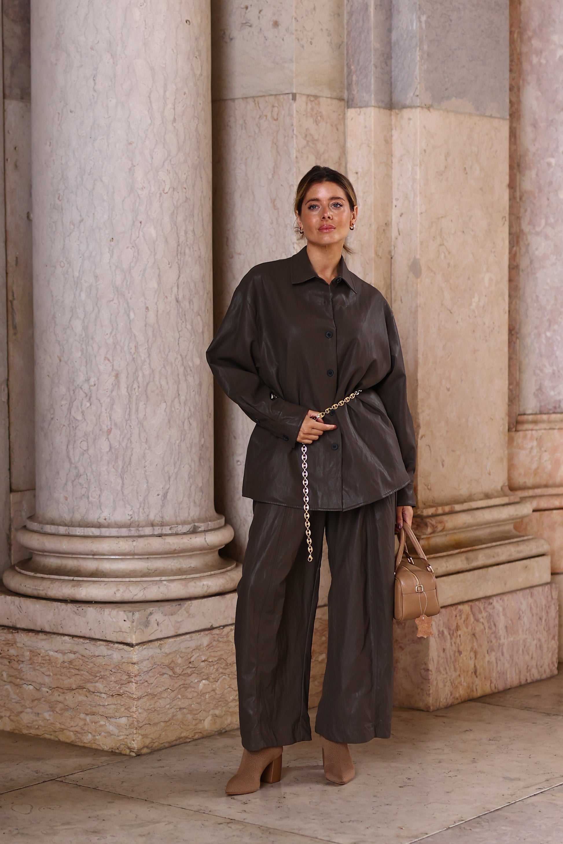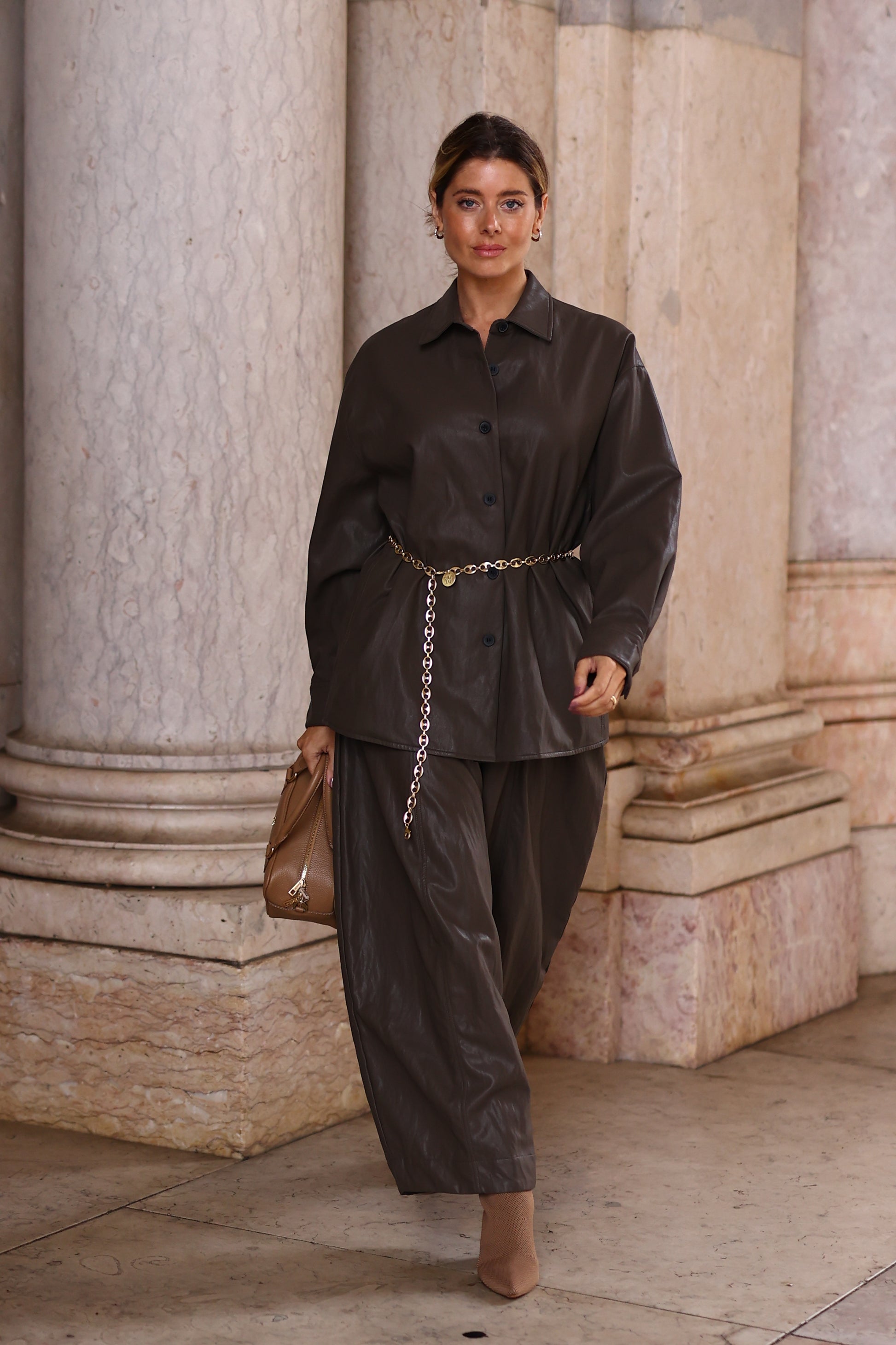 Calças em ecopele ELEH com corte baggy e cintura média, perfeitas para um look contemporâneo e cheio de estilo. A perna arredondada e o acabamento suave conferem conforto e um visual moderno, ideal para coordenar com malhas, camisas ou tops mais justos.