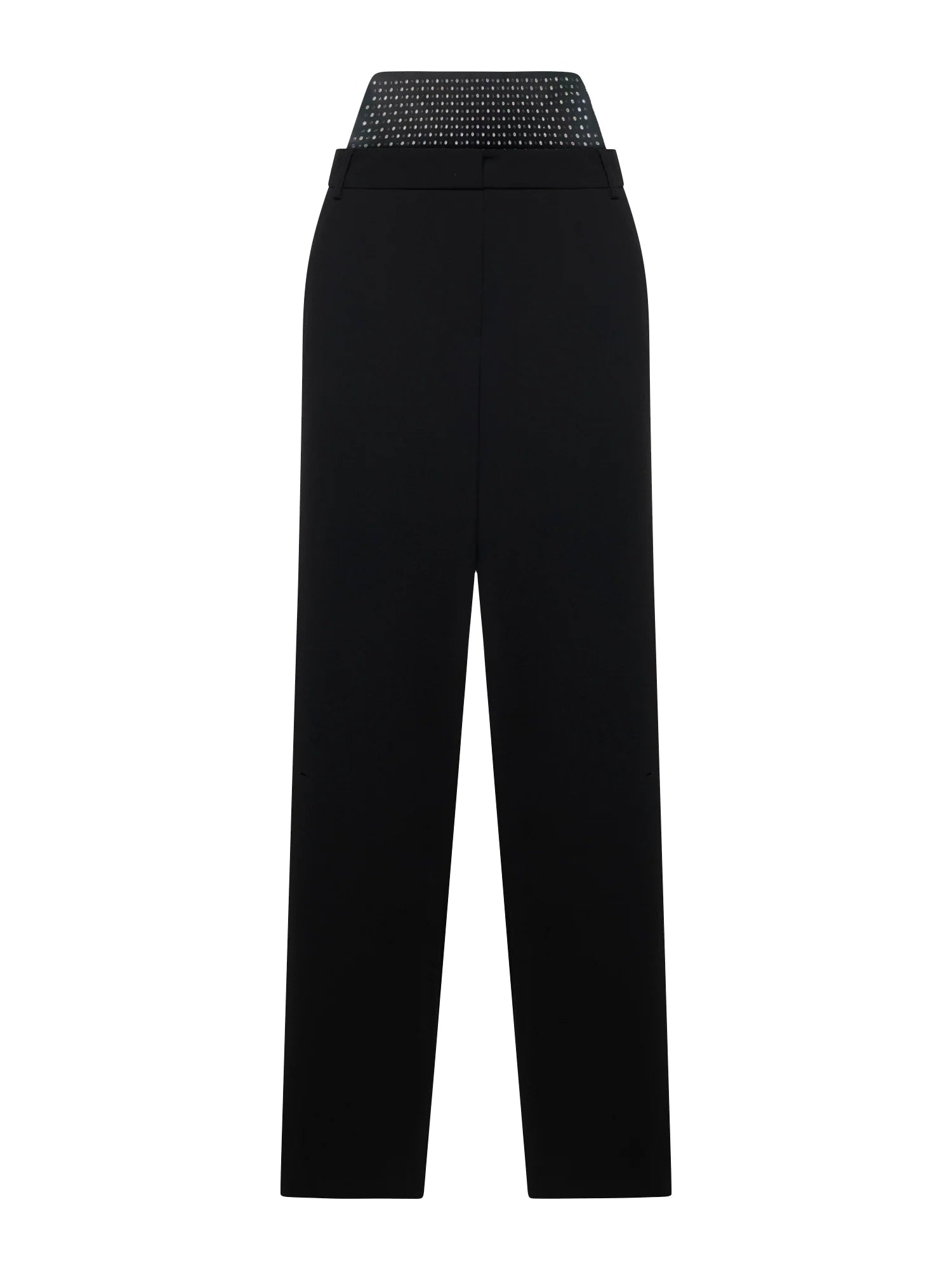 Com uma silhueta reta e fluida, destacam-se pela cintura tipo corset adornada com aplicações de strass, que acrescenta brilho e estrutura ao look.