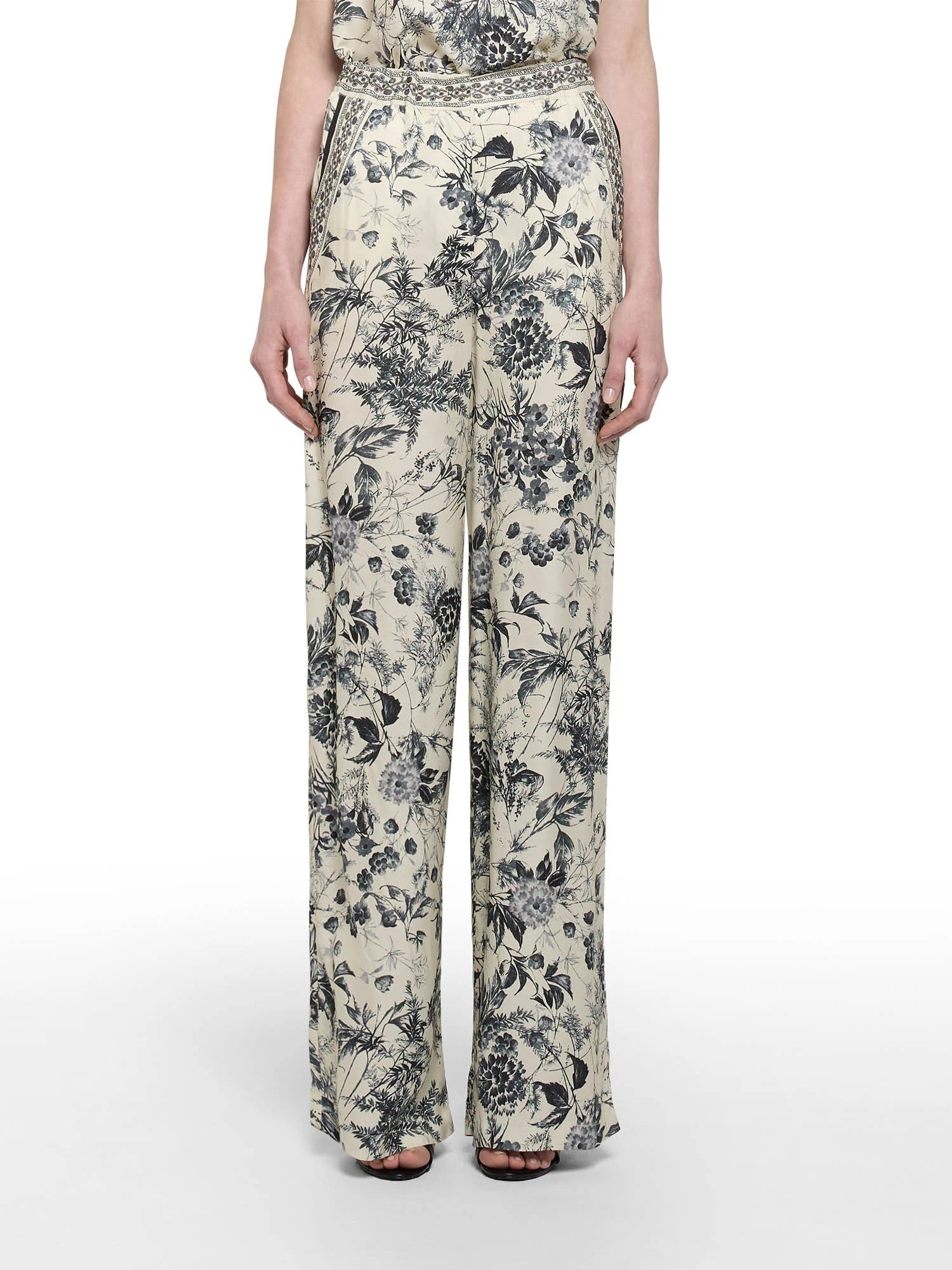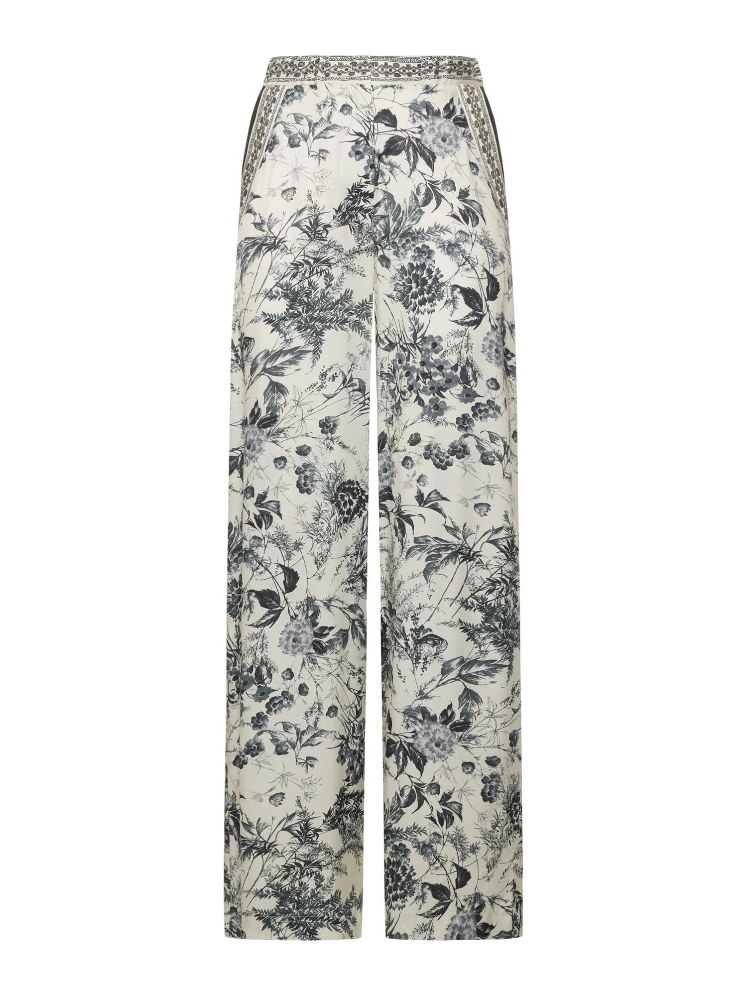 Com design fluido e estampa botânica elegante, esta calça é a escolha perfeita para um visual leve e sofisticado. O modelo possui cintura média com detalhe bordado na pala e caimento reto, oferecendo conforto e estilo na medida certa. A padronagem floral em preto e off-white garante charme atemporal.