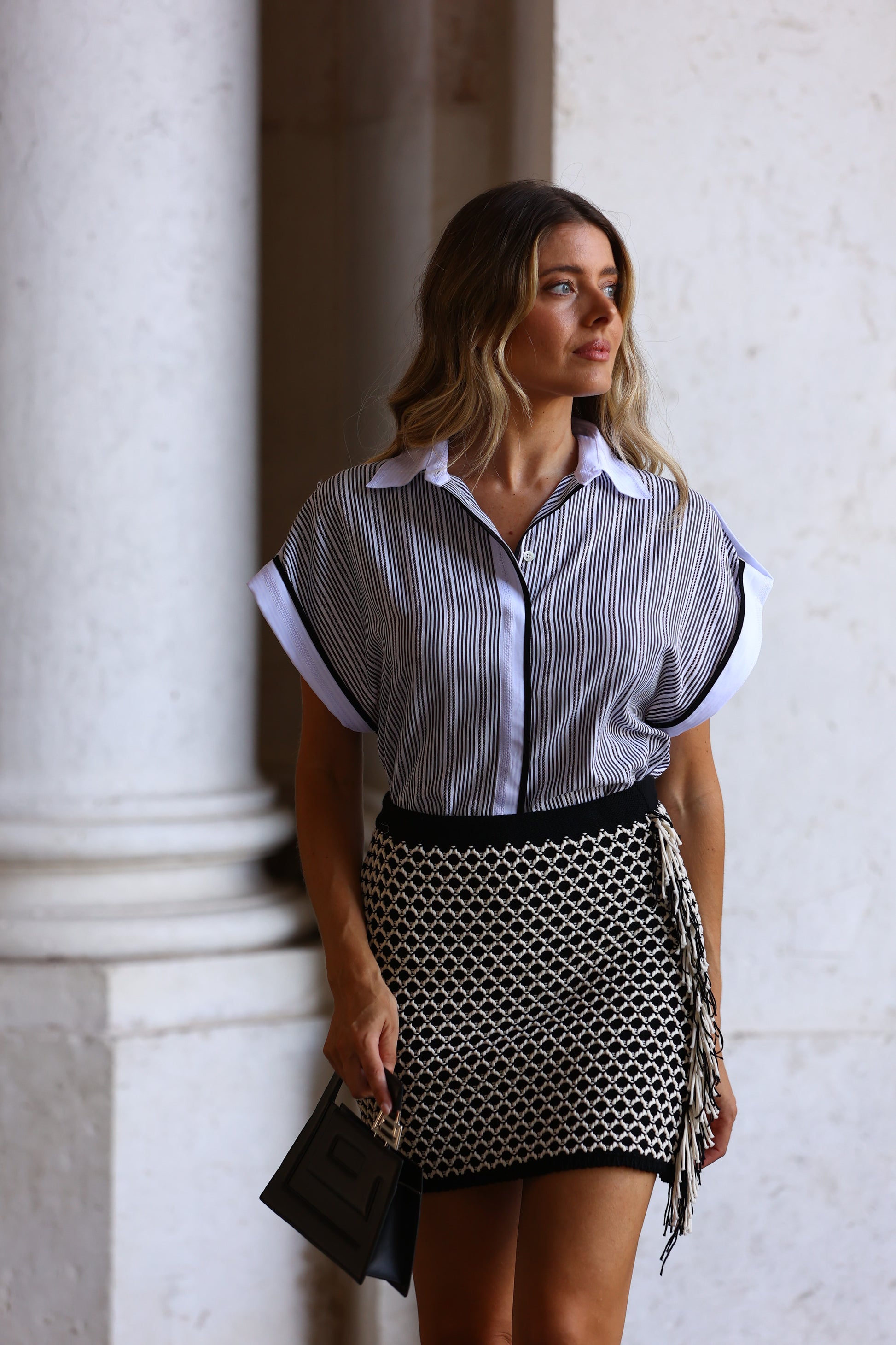 Elegante e cheia de personalidade, esta camisa apresenta uma composição sofisticada de riscas assimétricas em preto sobre fundo branco. O design brinca com a direção das listras, criando contraste entre o centro, mangas e laterais, o que valoriza a silhueta e traz um toque contemporâneo à peça clássica.