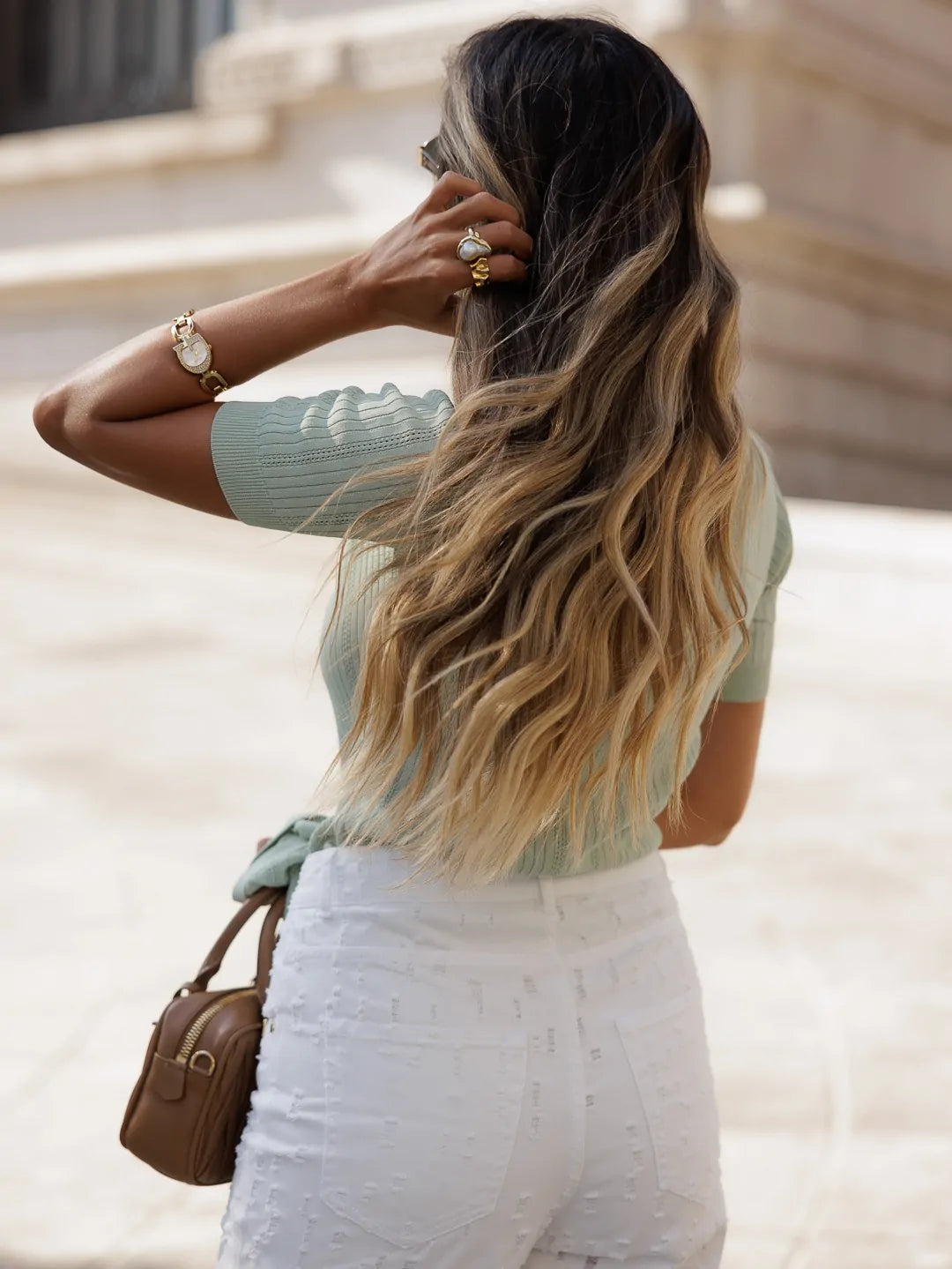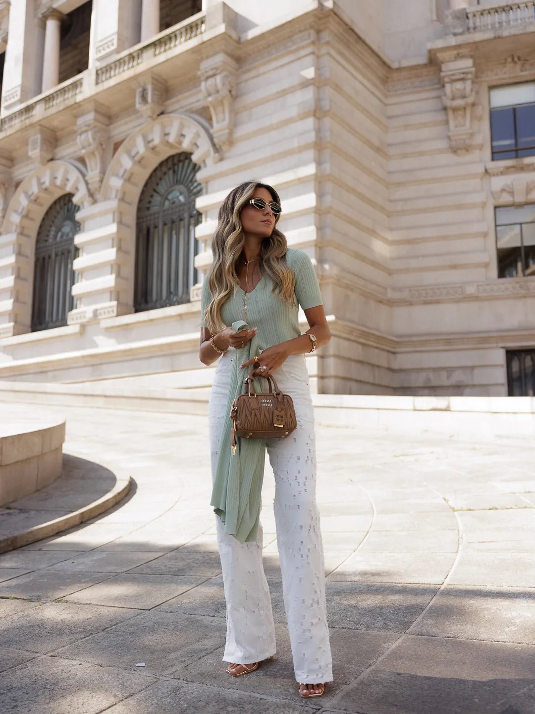 V-neck sweater with short sleeves. Custom thread appliqué detail. The fitting of the piece is adjusted