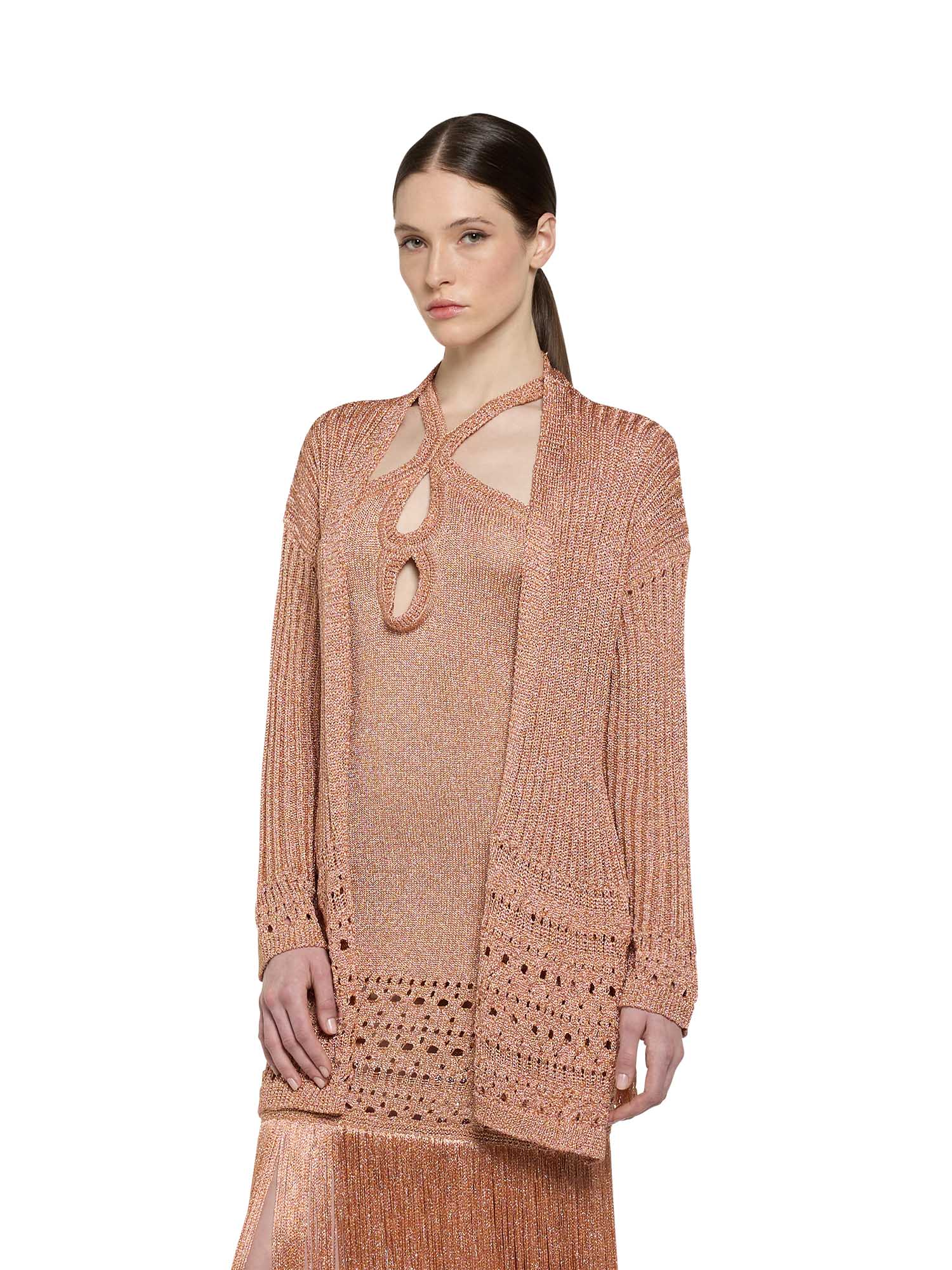 Este cardigan em malha metalizada é a definição de sofisticação com um toque boho chic. Com textura canelada e acabamento brilhante, a peça apresenta franjas na parte frontal, bolsos trabalhados com ponto rendado e detalhes vazados nas mangas e barra.
