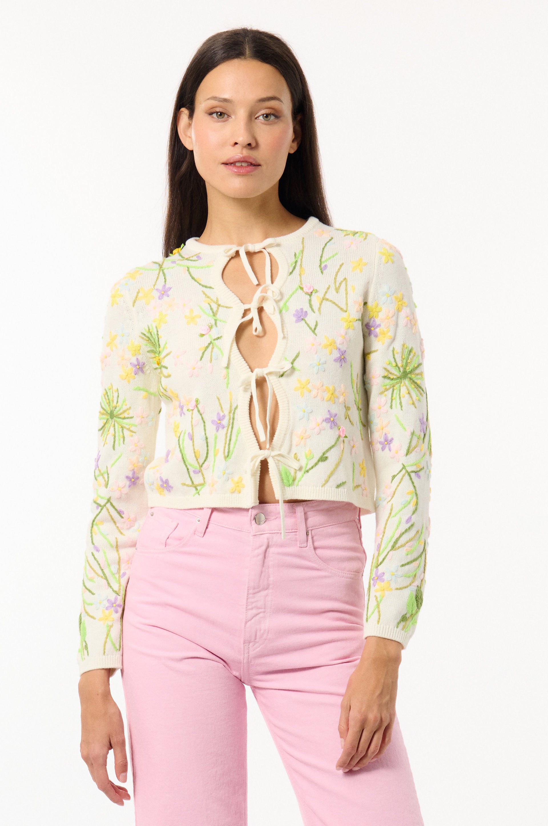 This cardigan, woven with colorful flowers and with bows at the front, combines sensuality and romance. It creates an allure that is both feminine and seductive.