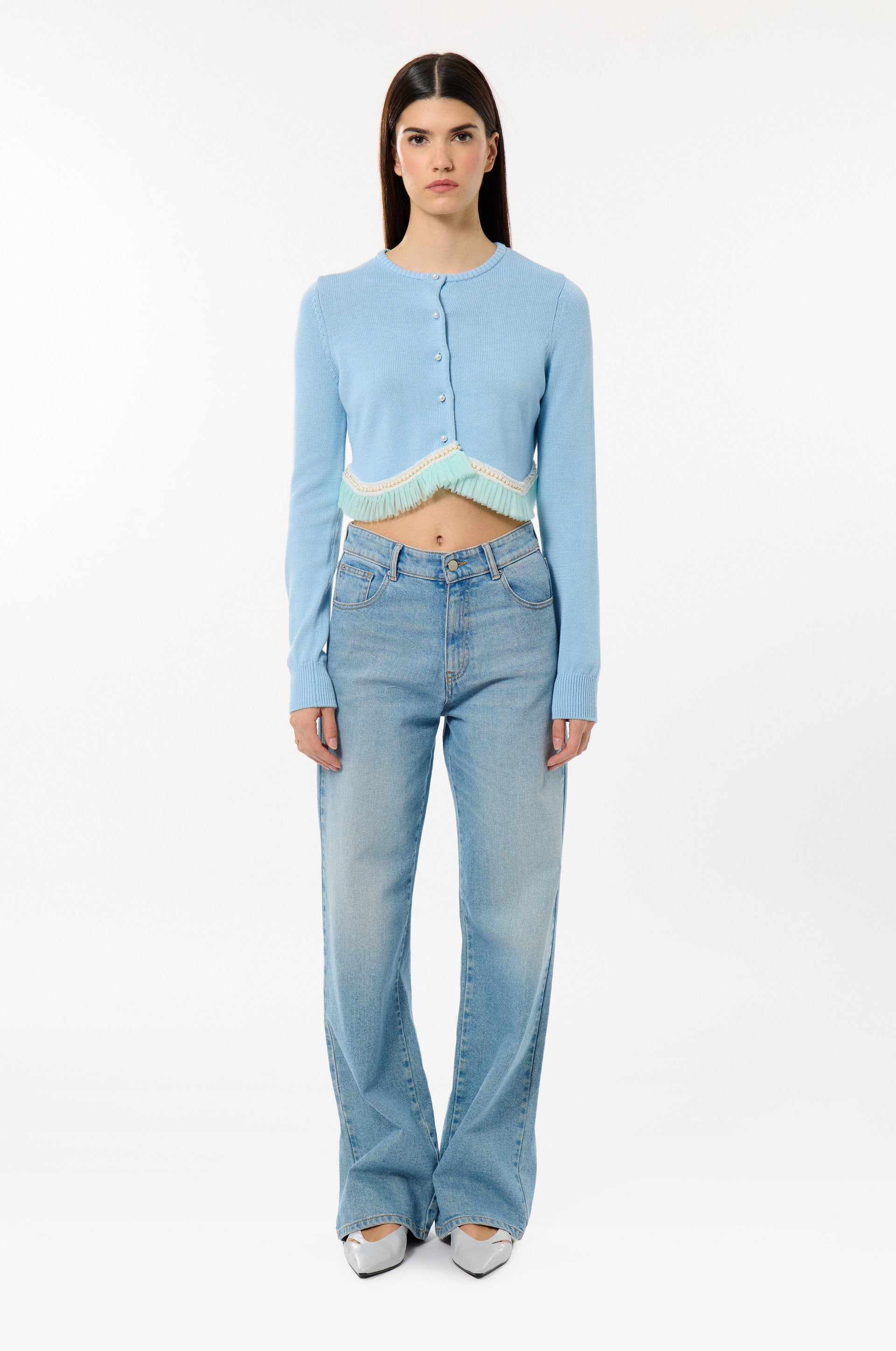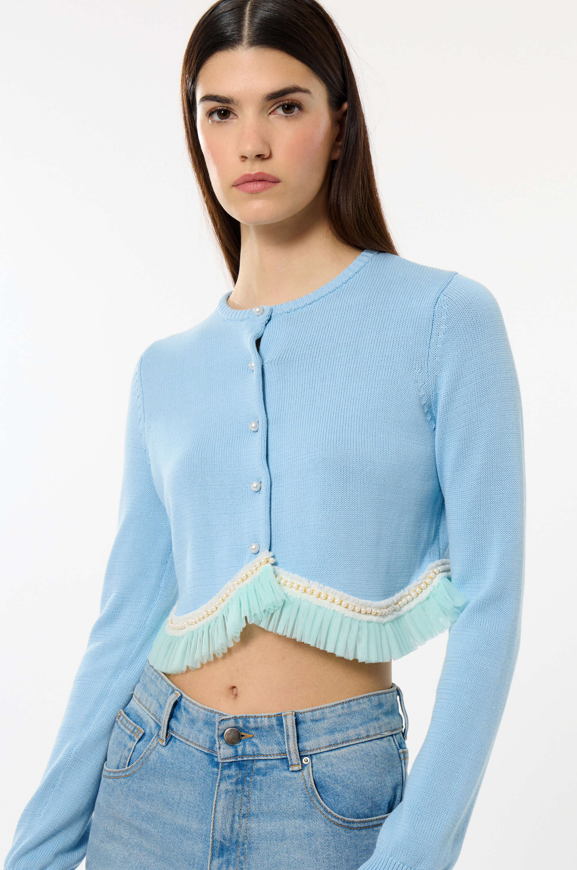 This pastel blue cardigan, delicately adorned with pearl buttons, features tulle ruffles at the bottom, adding a soft, feminine touch to its design.