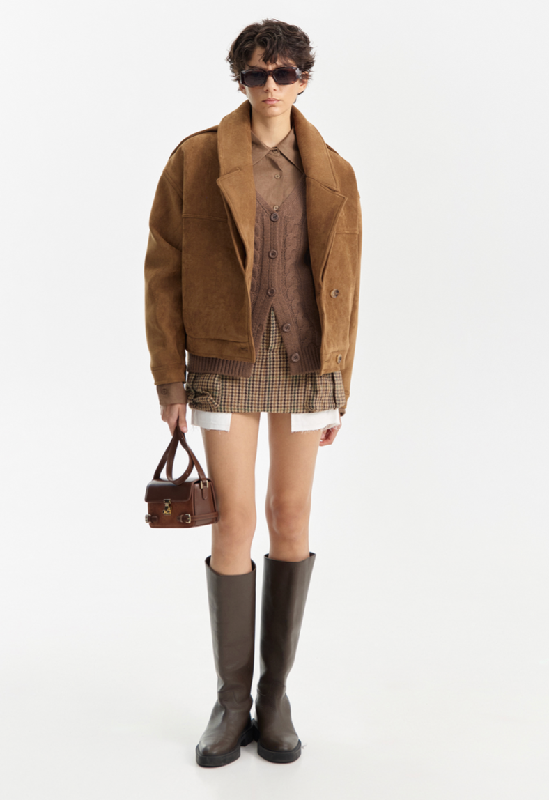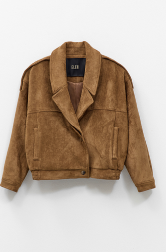 Casaco curto ELEH em tom camel, com design moderno e toque aveludado. O corte estruturado com gola ampla e ombros ligeiramente marcados confere um visual contemporâneo e sofisticado, ideal para coordenados de outono/inverno.