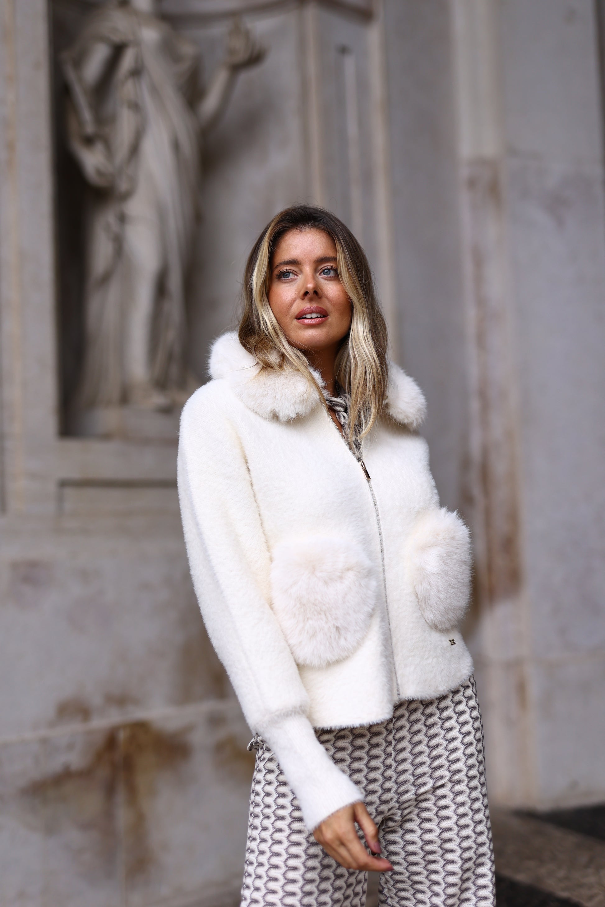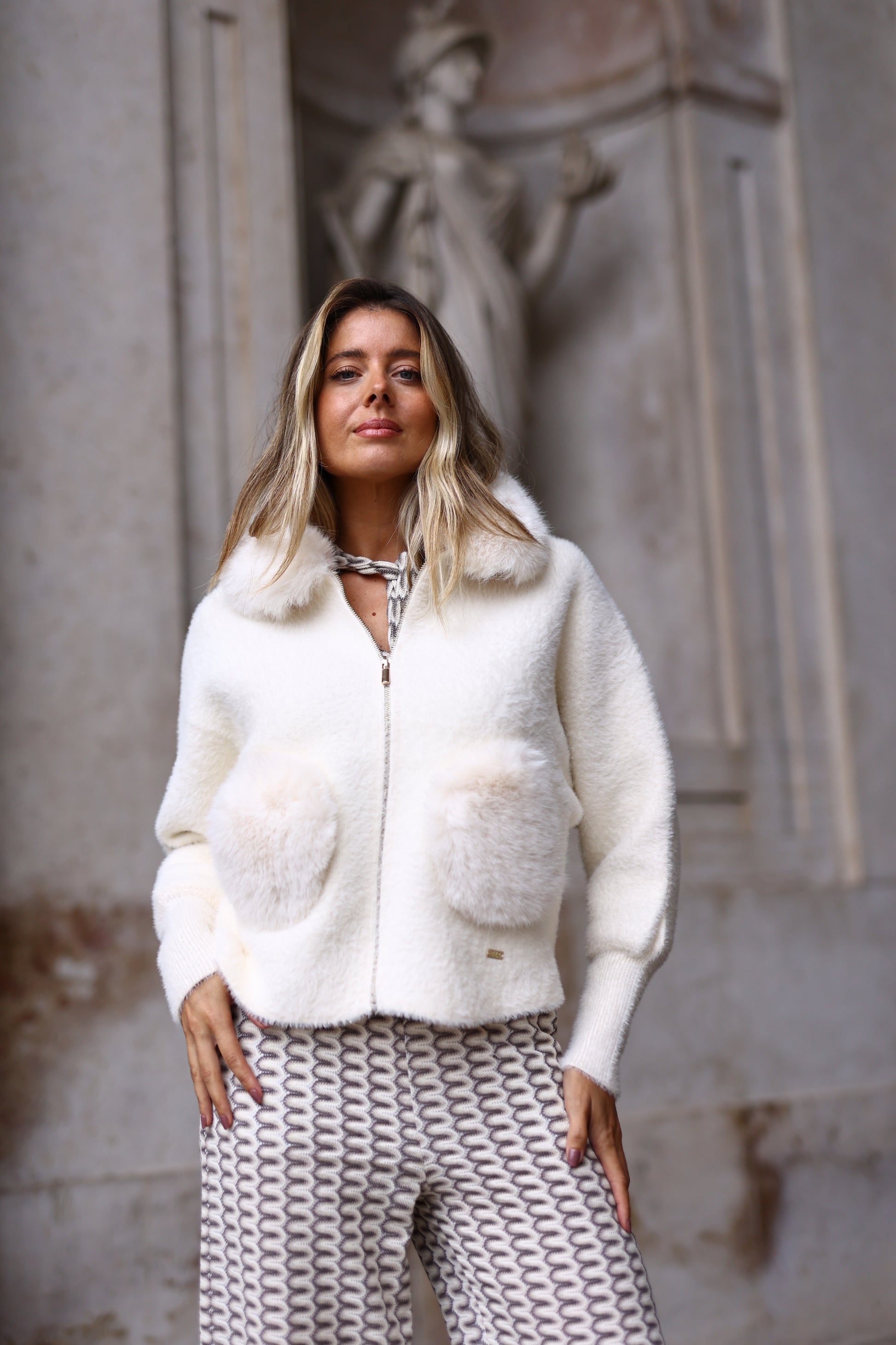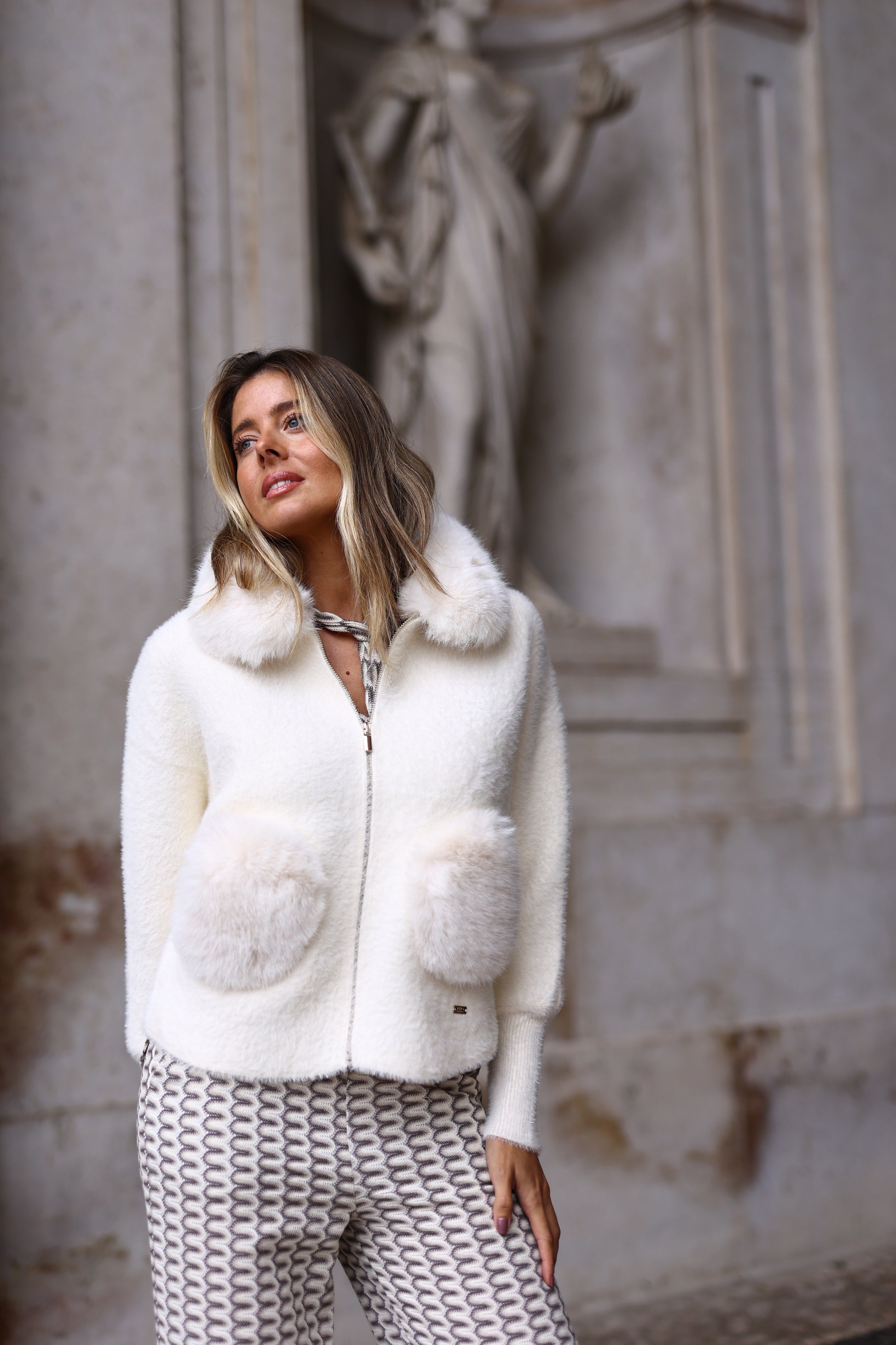 O fecho frontal com zíper e o corte ligeiramente solto tornam esta peça perfeita para looks de inverno elegantes e modernos, em tons neutros e luminosos.