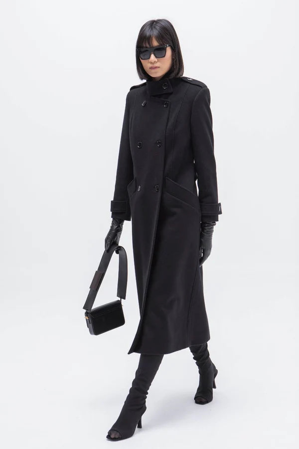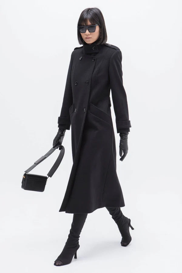Casaco comprido, de corte direito, 100% lã, de cor preta, com corte de alfaiataria de inspiração militar. Apresenta abotoamento duplo frontal com seis botões visíveis e carcela abotoada na gola alta, proporcionando estrutura e proteção. Inclui ombreiras abotoadas e trança decorativa, abas abotoadas nos punhos e dois bolsos laterais. A bainha é lisa e o comprimento cobre completamente as pernas, caindo abaixo do joelho. A sua silhueta discreta e o seu acabamento impecável conferem-lhe um aspeto clássico e elegante.