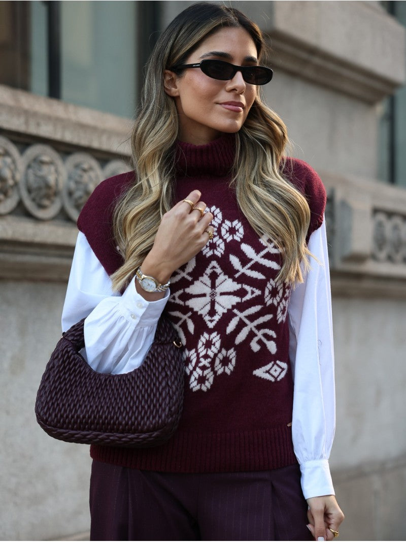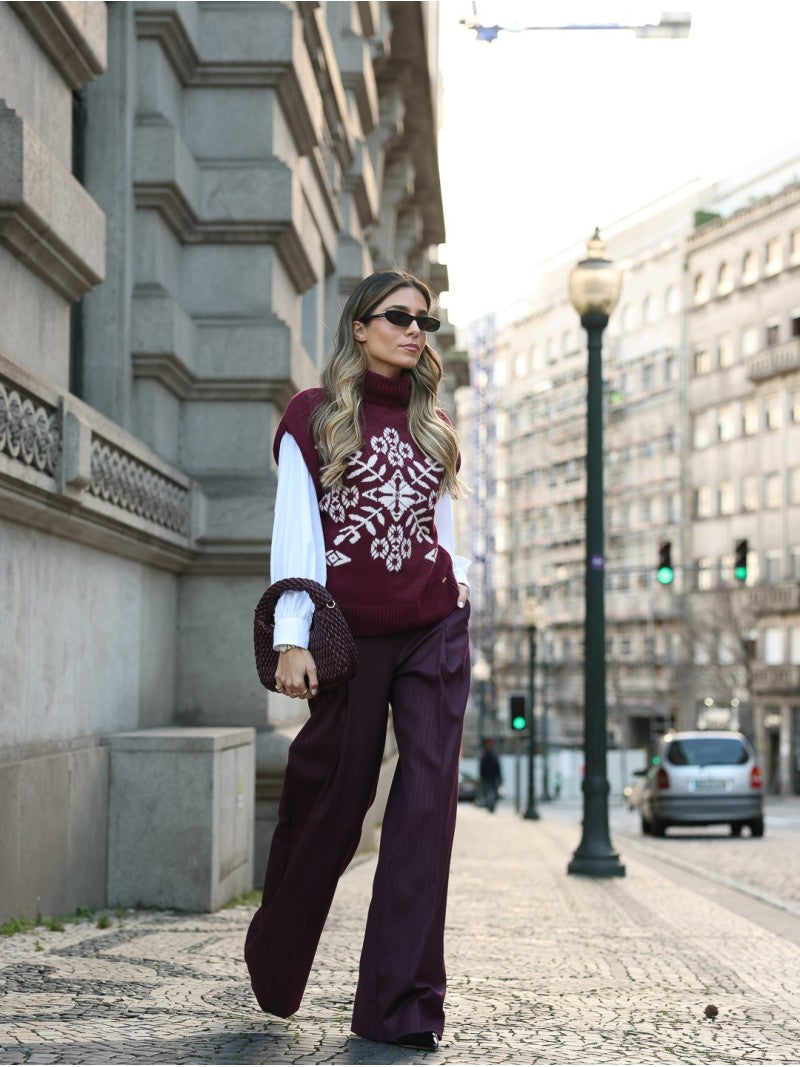Colete em malha Scripta, com gola alta e padrão jacquard inspirado em motivos invernais. A peça combina conforto e estilo, ideal para usar sobre camisas ou blusas, criando um visual sofisticado e moderno.