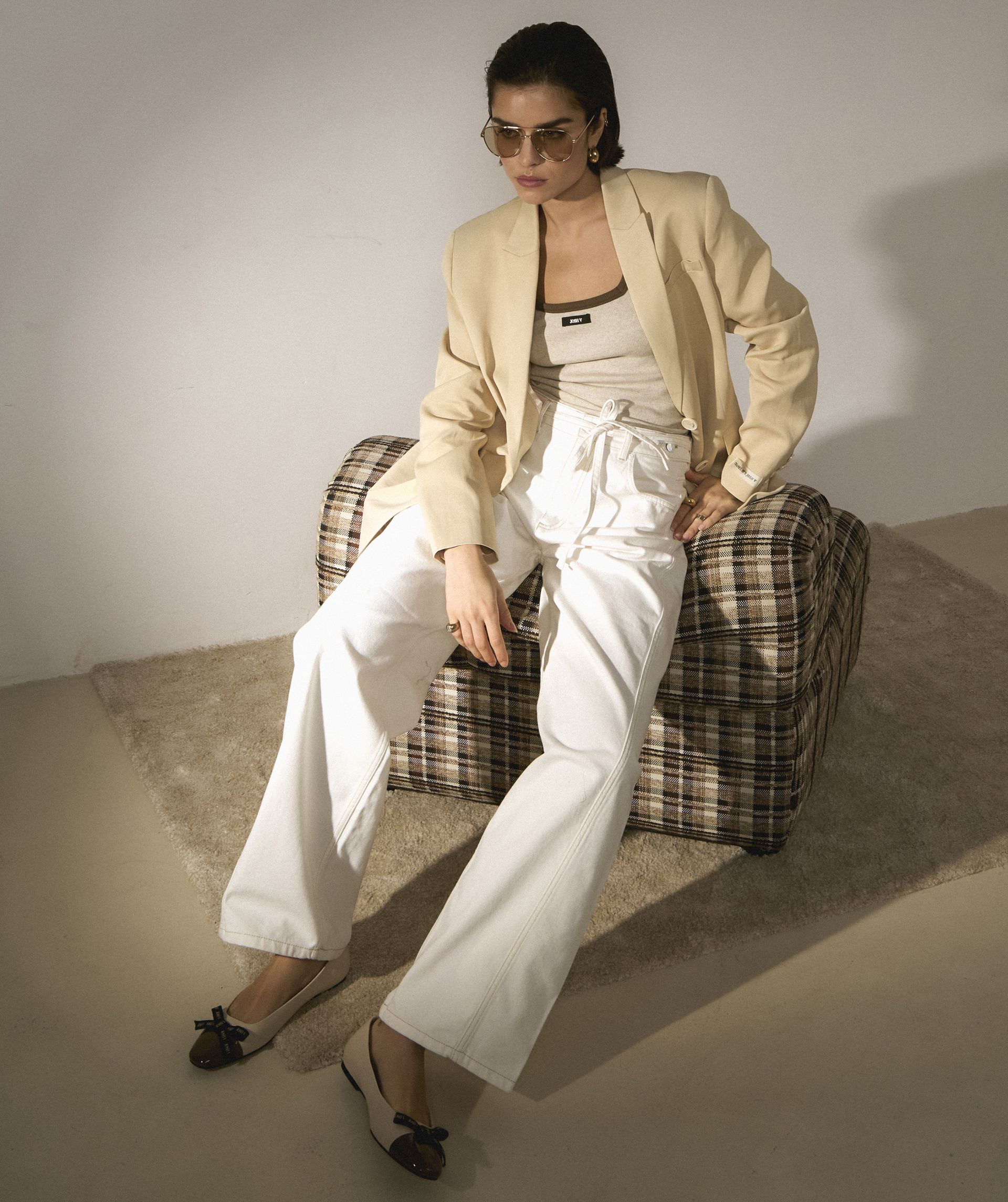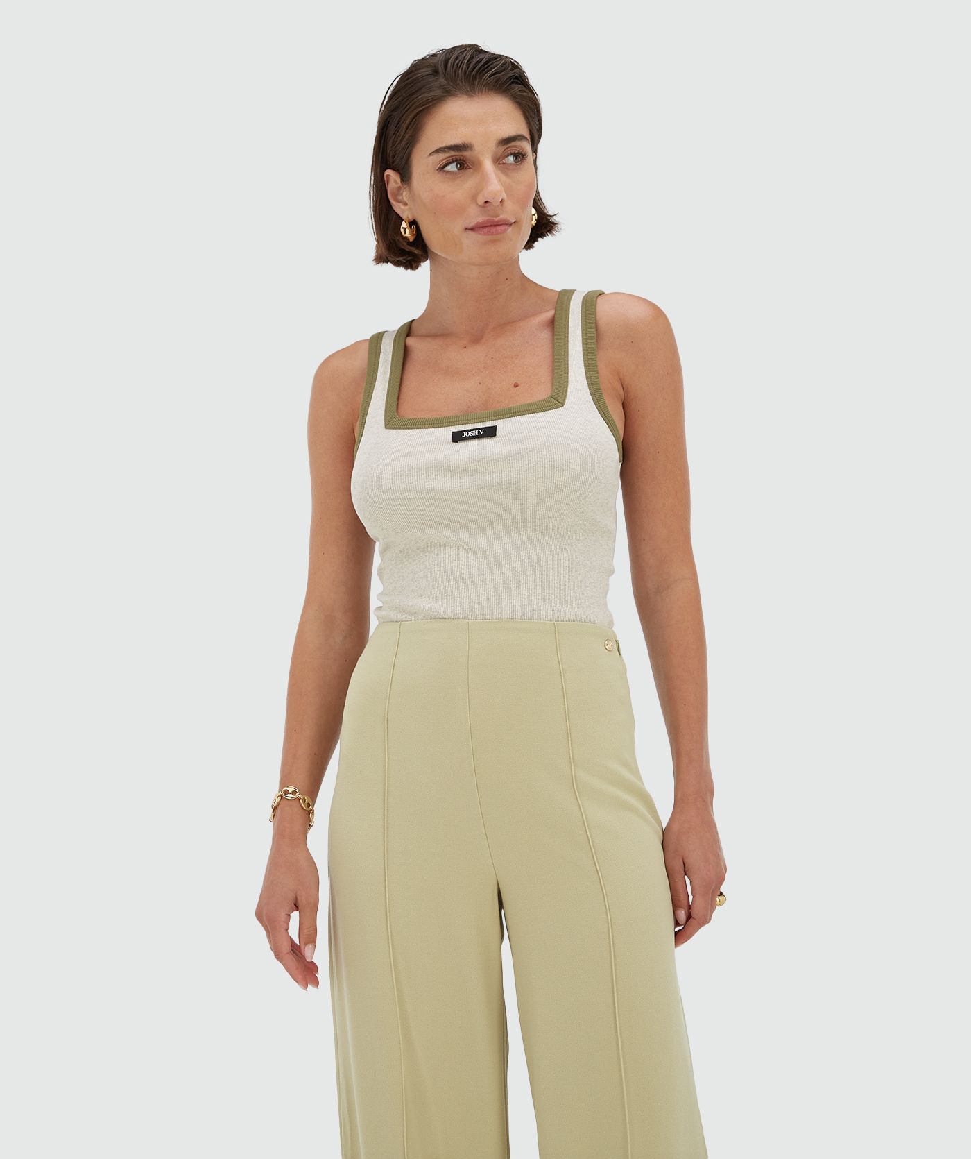 O top feminino JOSH V Dieda em Ecru Melange é um top justo com decote quadrado. Este top sem mangas é feito de algodão, proveniente da Better Cotton, com elastano. O tecido canelado e a etiqueta de lona JOSH V preta na frente conferem à peça um visual refinado. Use-o casualmente com jeans e tênis, ou combine-o com um agasalho esportivo ou terno feminino.