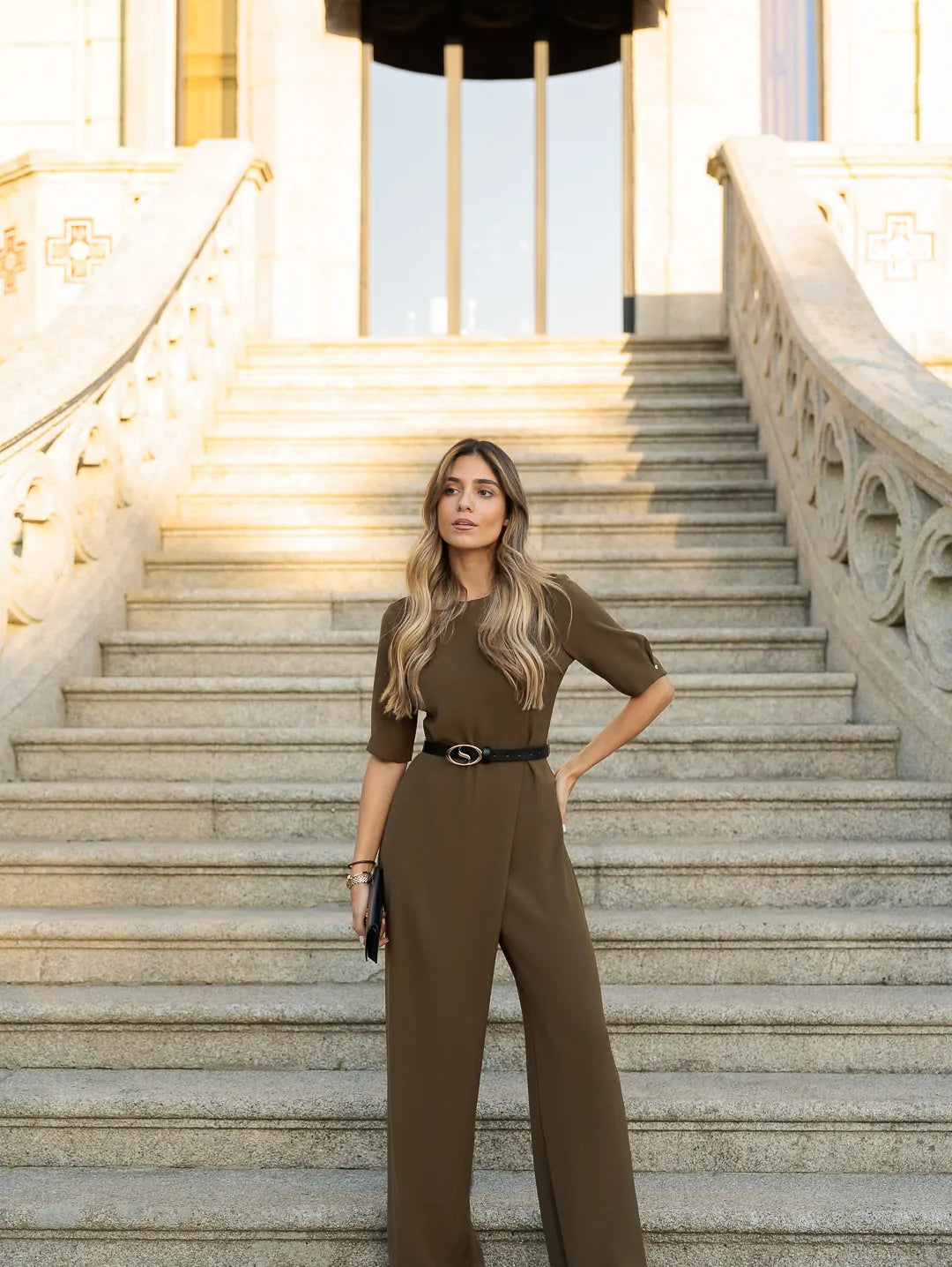 Minimalista e elegante, este macacão caqui é a definição de sofisticação contemporânea. Com corte fluido e cintura marcada por cinto preto com fivela dourada, alonga a silhueta e garante um caimento impecável. As mangas curtas com pequeno botão no detalhe adicionam um toque discreto e feminino, tornando-o perfeito tanto para o dia como para a noite.