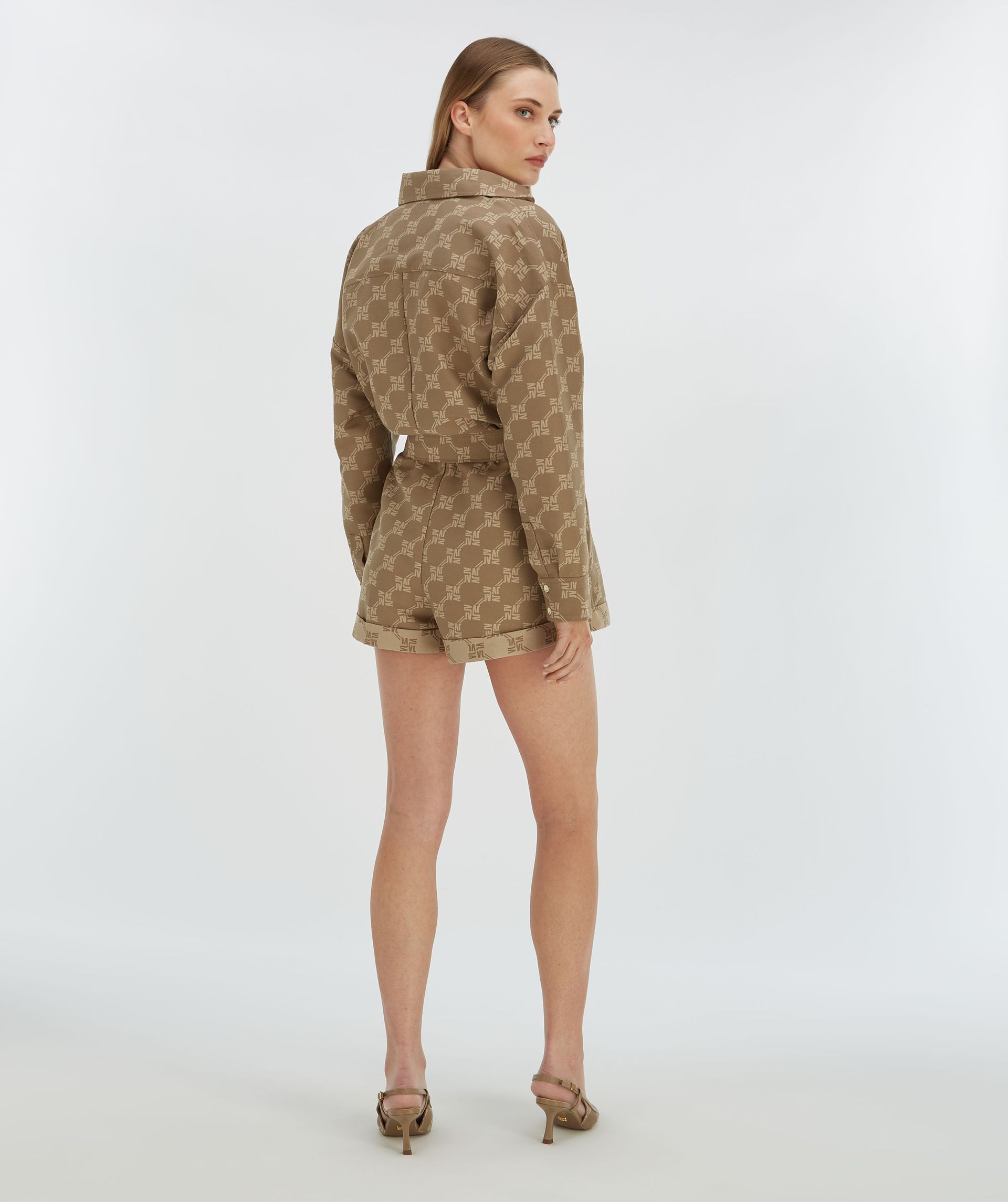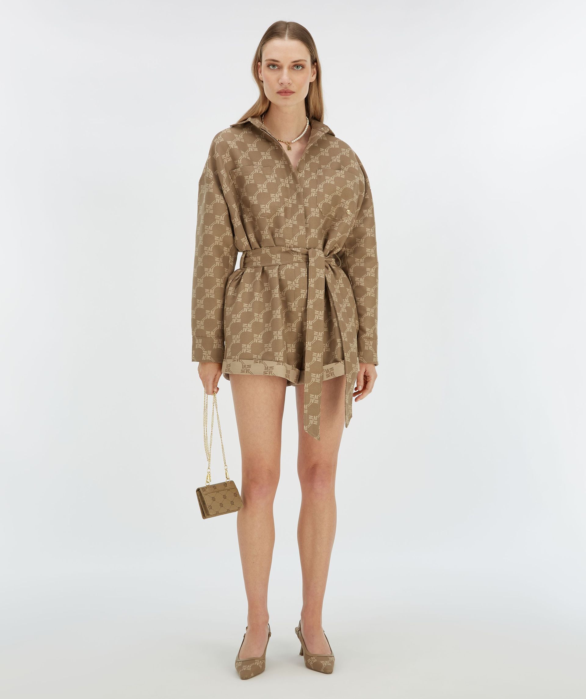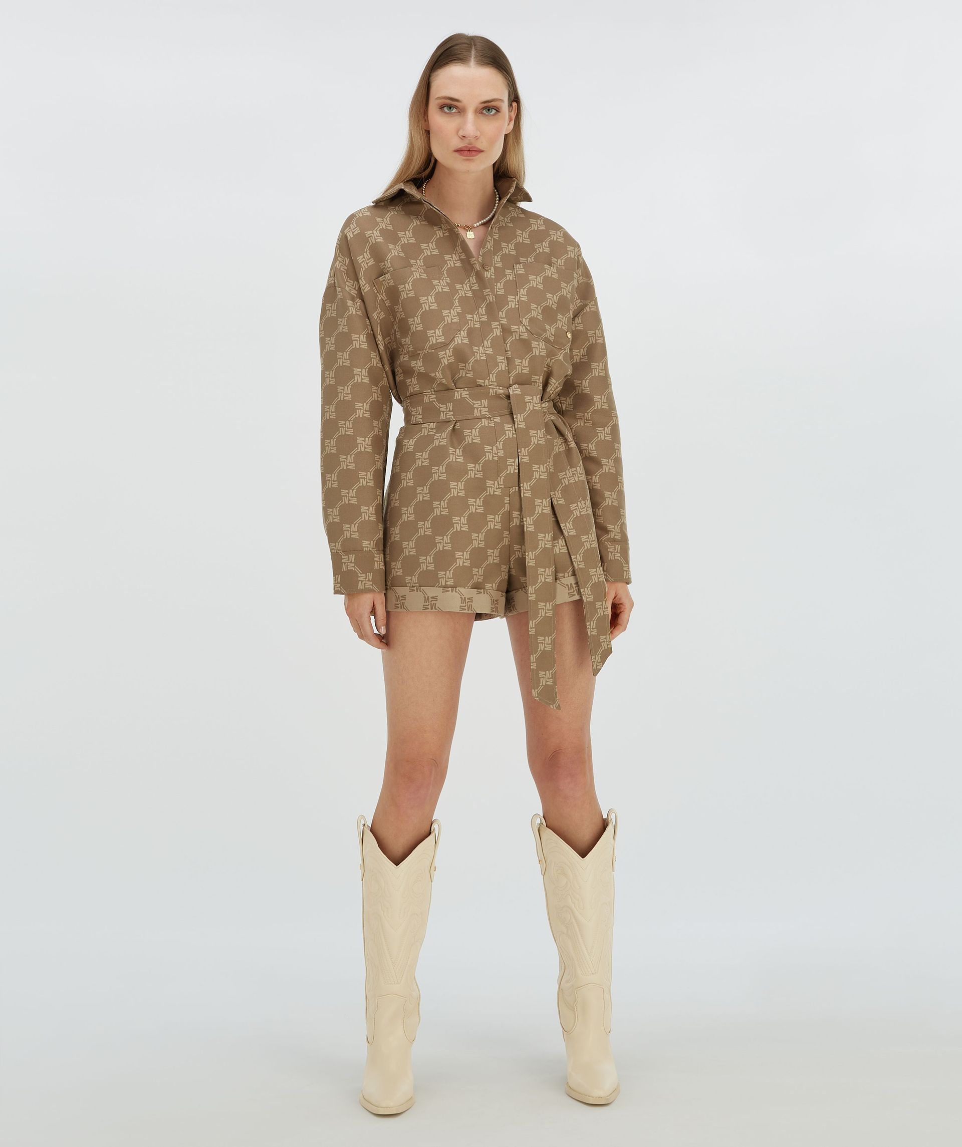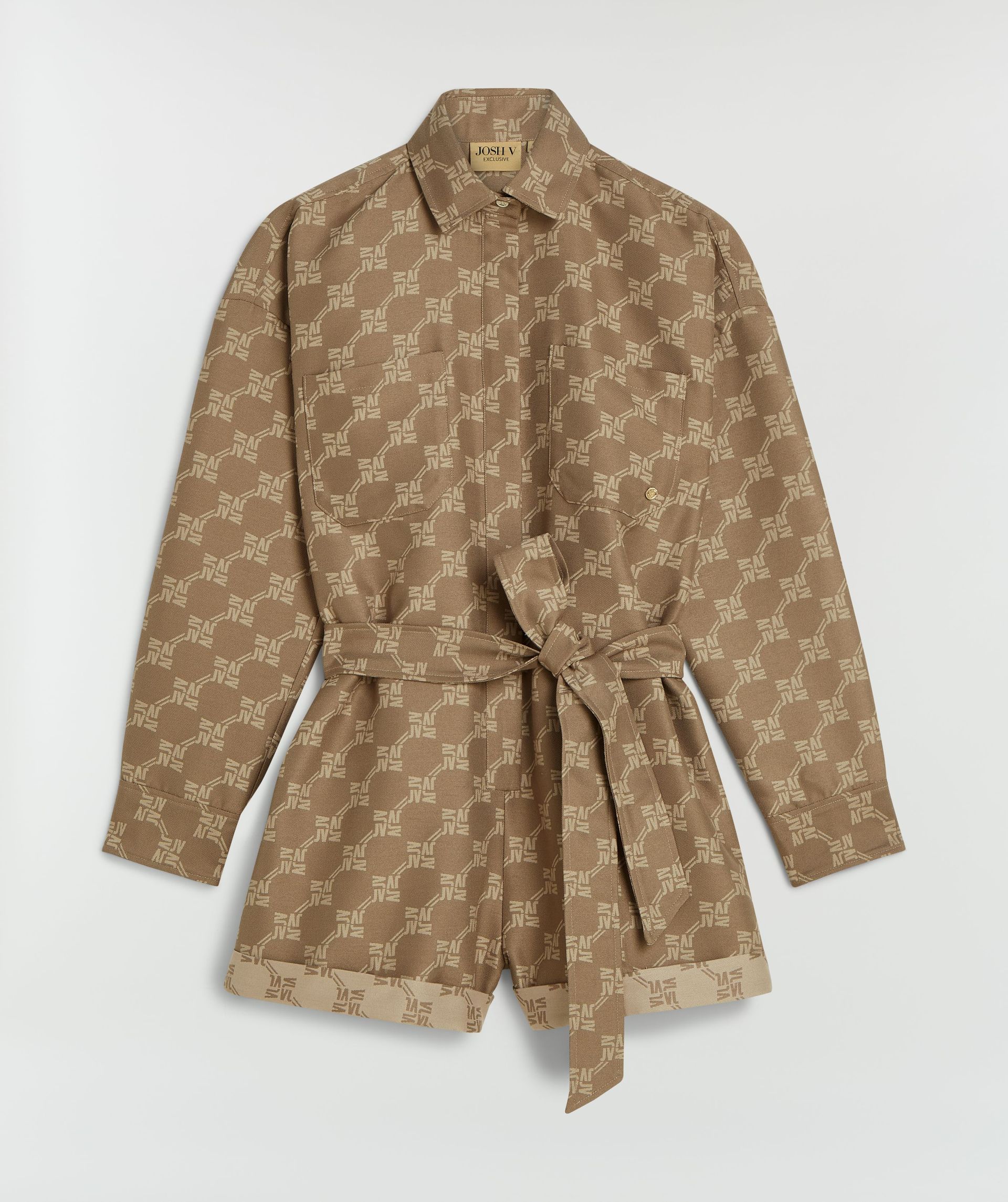 The JOSH V Pien women's jumpsuit in Mink is made from a high-quality fabric with an all-over jacquard logo pattern. The short jumpsuit has a regular fit and cinches at the waist with the included belt. It has a hidden button fastening and two non-functional chest pockets. The exclusive design and material make this jumpsuit part of the JOSH V Exclusive line. Style tip: pair the jumpsuit with boots or sneakers for an everyday look.