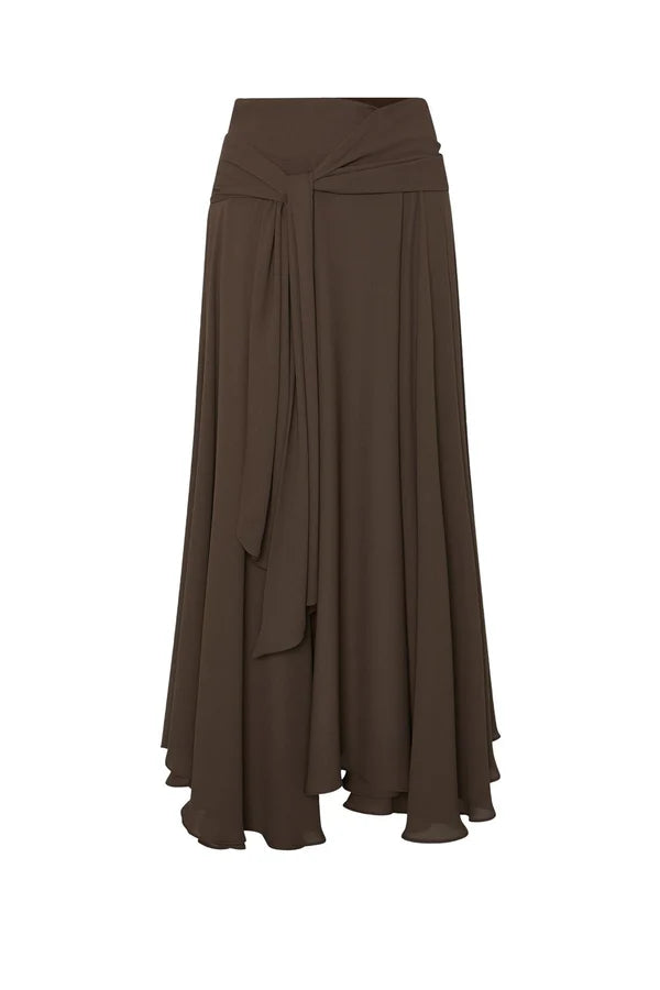 Saia midi castanho-escuro, confecionada em tecido leve e arejado, com um caimento fluído. O modelo apresenta um cós largo e cruzado na frente, com um laço integrado do mesmo tecido que pende decorativamente na lateral. O volume da saia é criado por painéis de tecido que geram movimento dinâmico ao caminhar. A bainha apresenta um acabamento irregular e assimétrico, com camadas suaves que terminam em ondas, conferindo leveza visual.