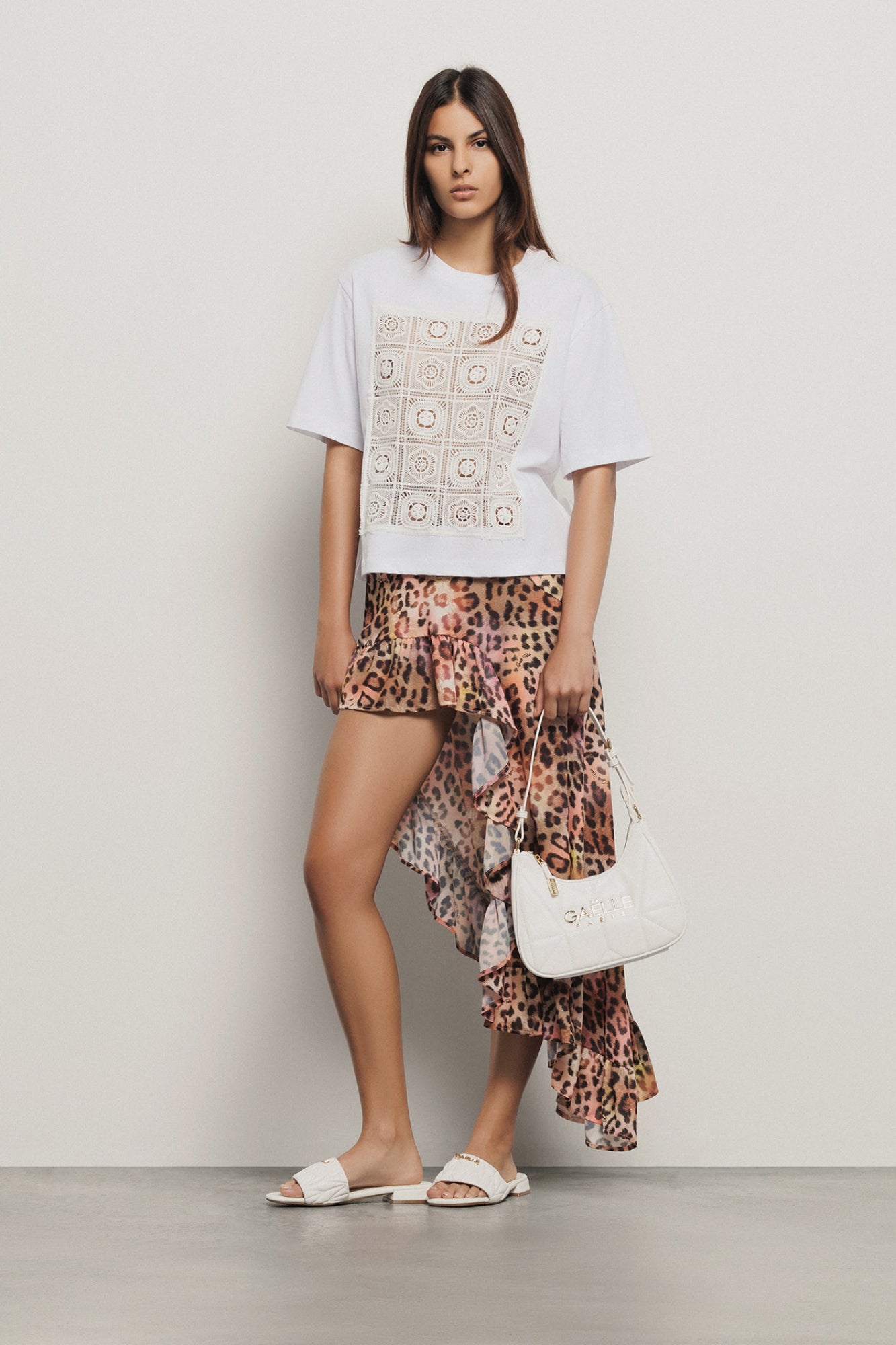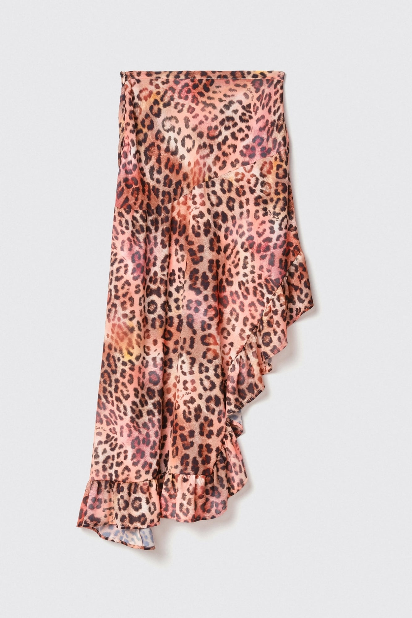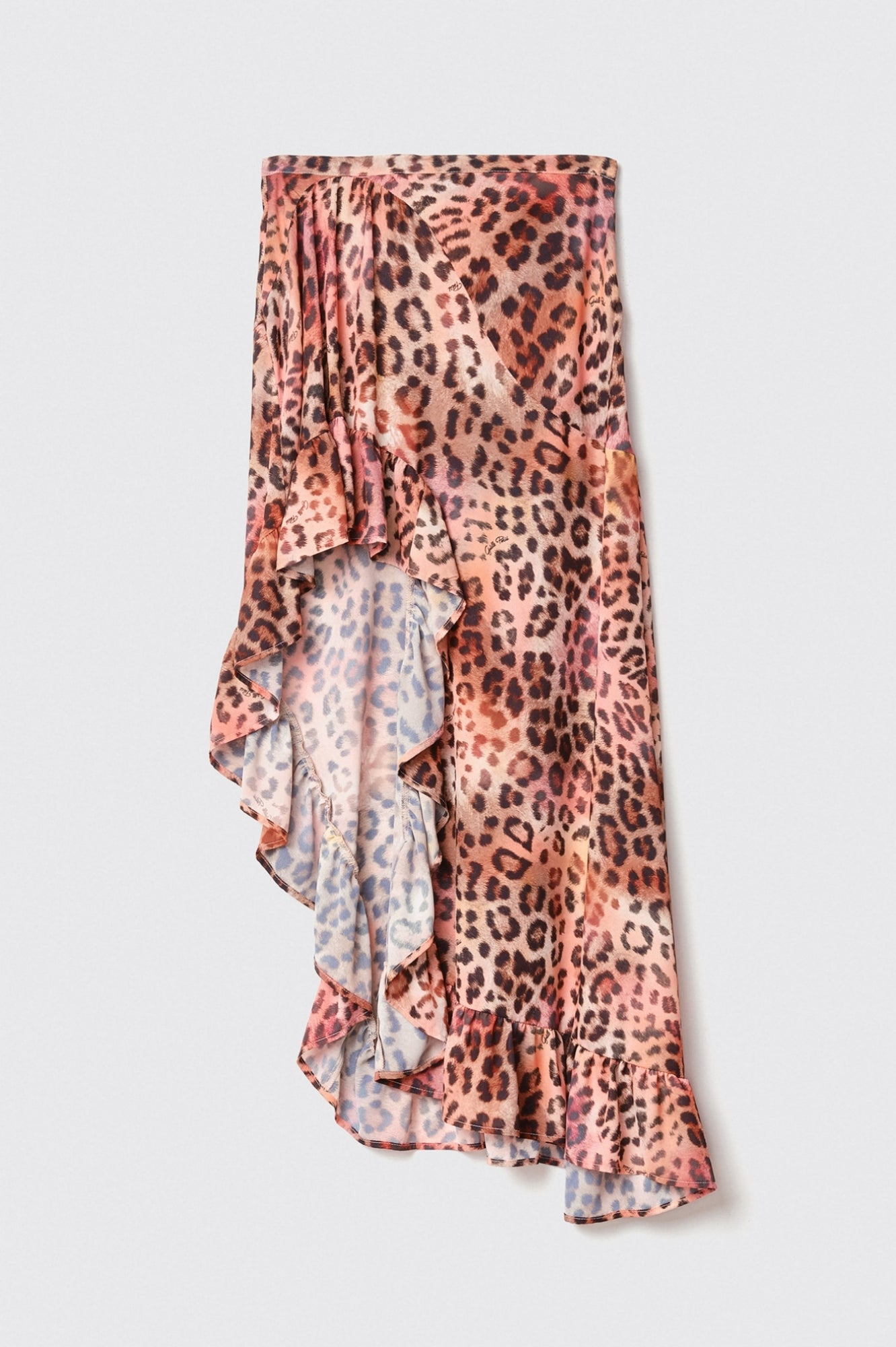Asymmetrical midi skirt with double georgette ruffles, animal print.