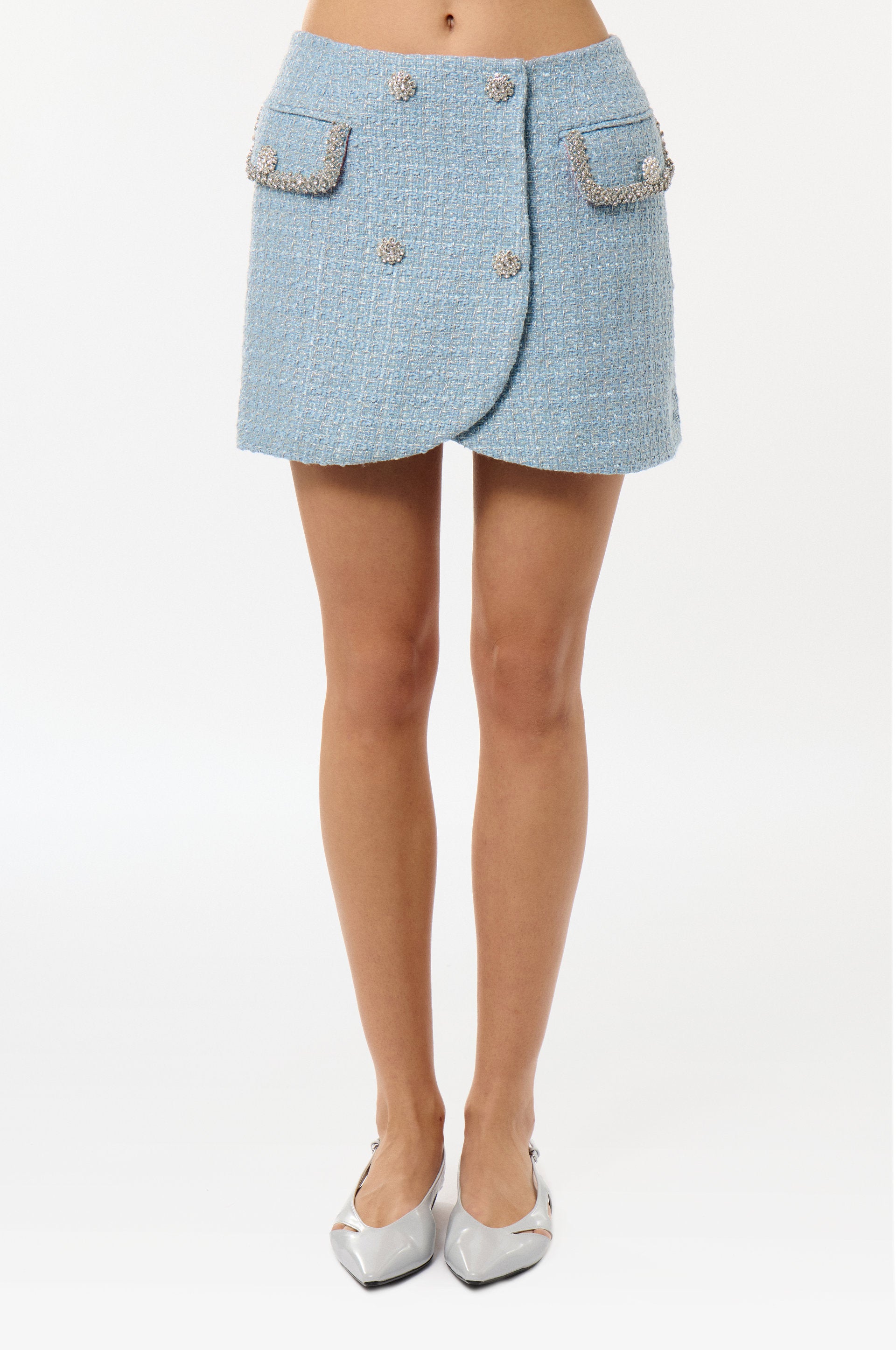 This tweed skirt combines elegance and shine thanks to its shiny metallic threads, jeweled buttons and numerous details adorned with pearls and rhinestones. Ideal for a chic and sophisticated look.