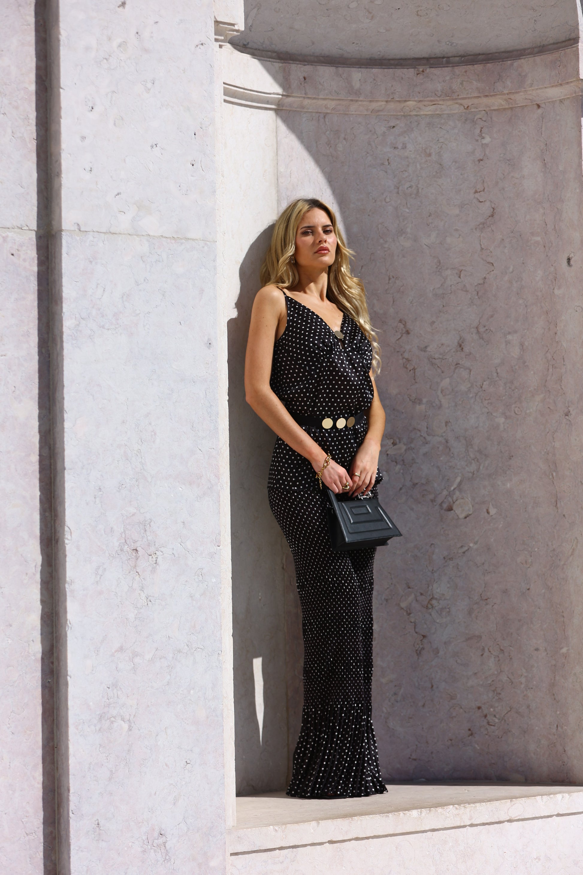 Elegante e atemporal, esta calça pantalona preta com estampado de poás brancos alonga a silhueta e traz movimento com leveza. Cintura média e caimento fluido, perfeita para compor looks sofisticados ou descontraídos.