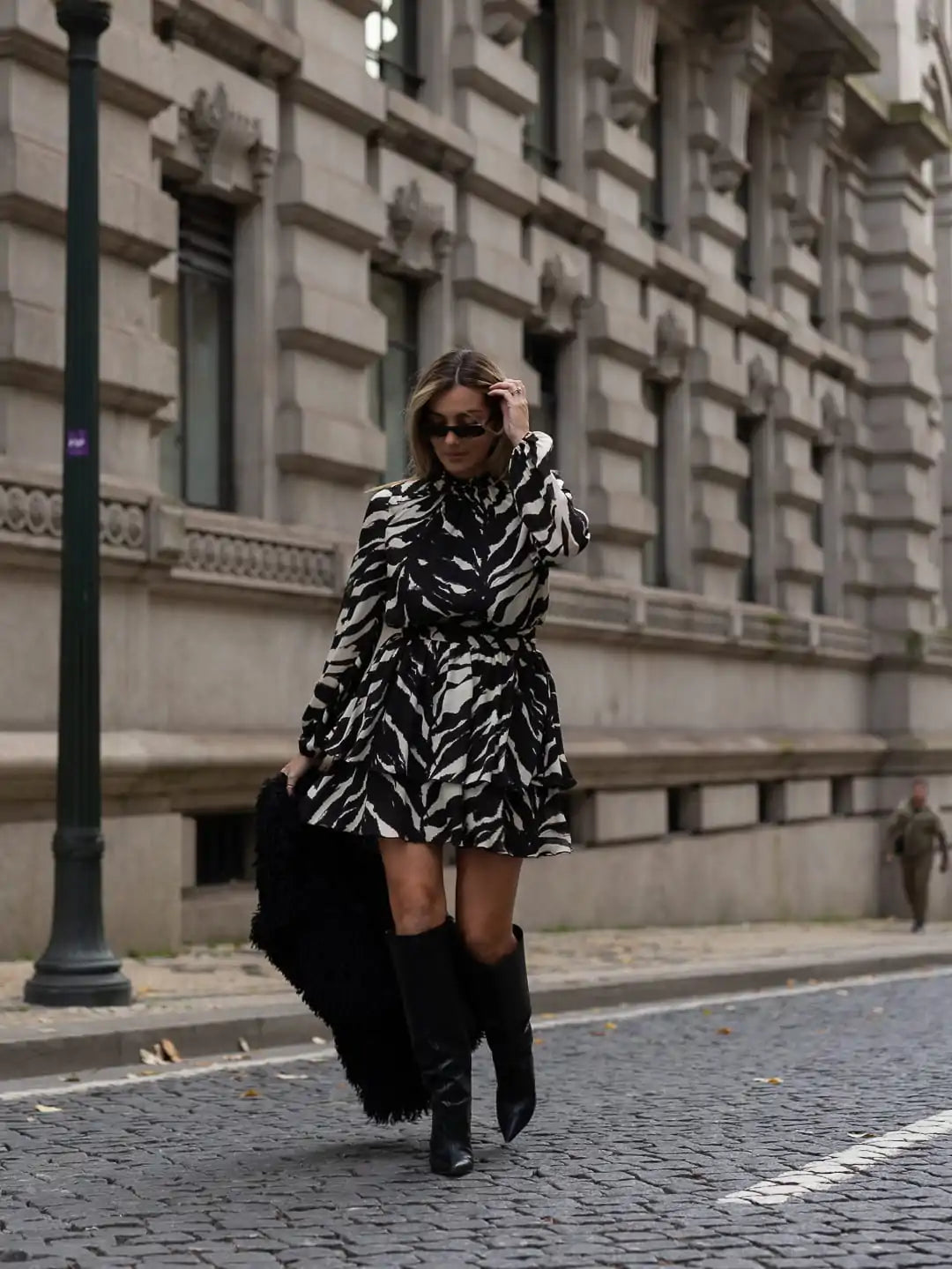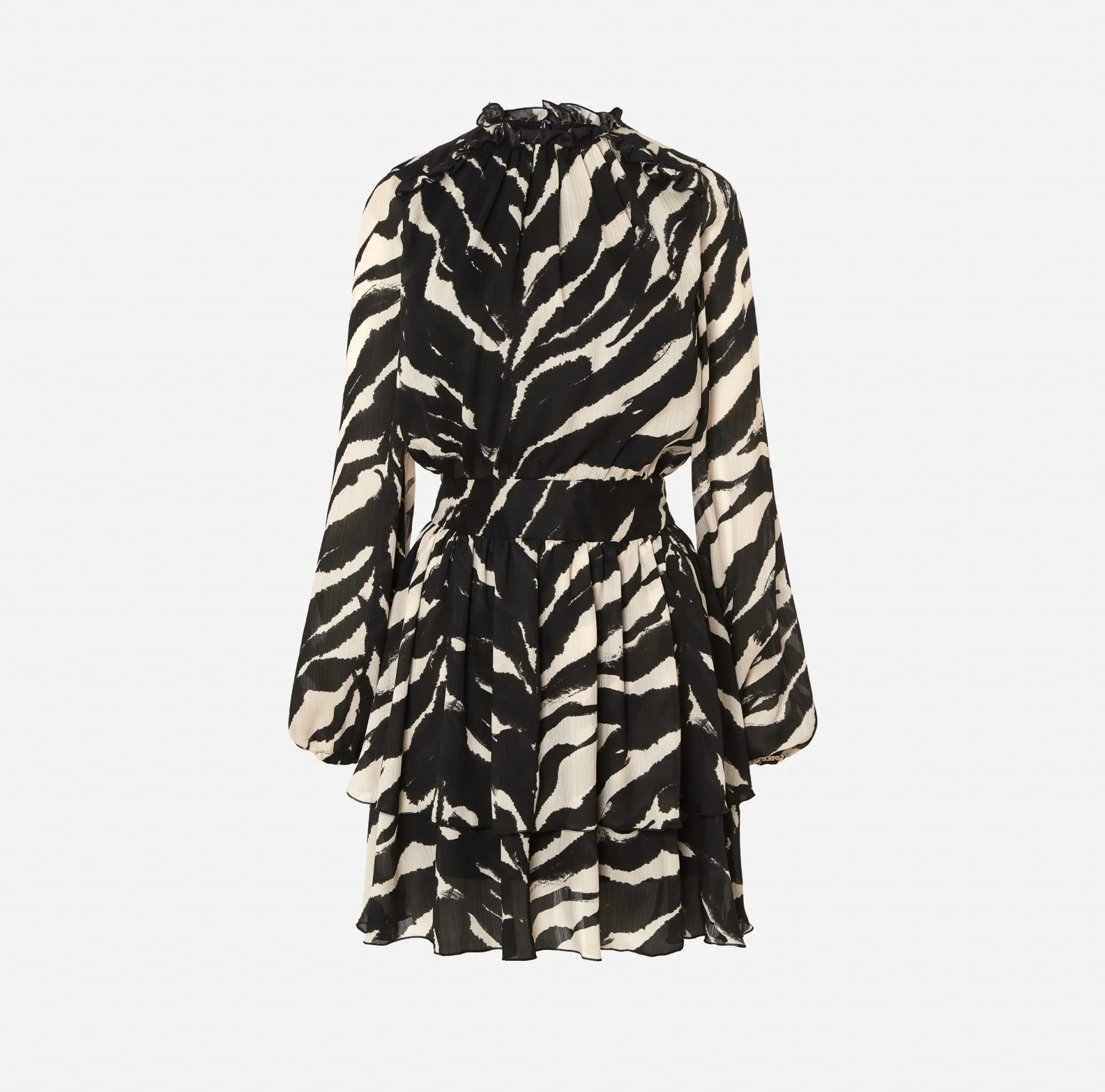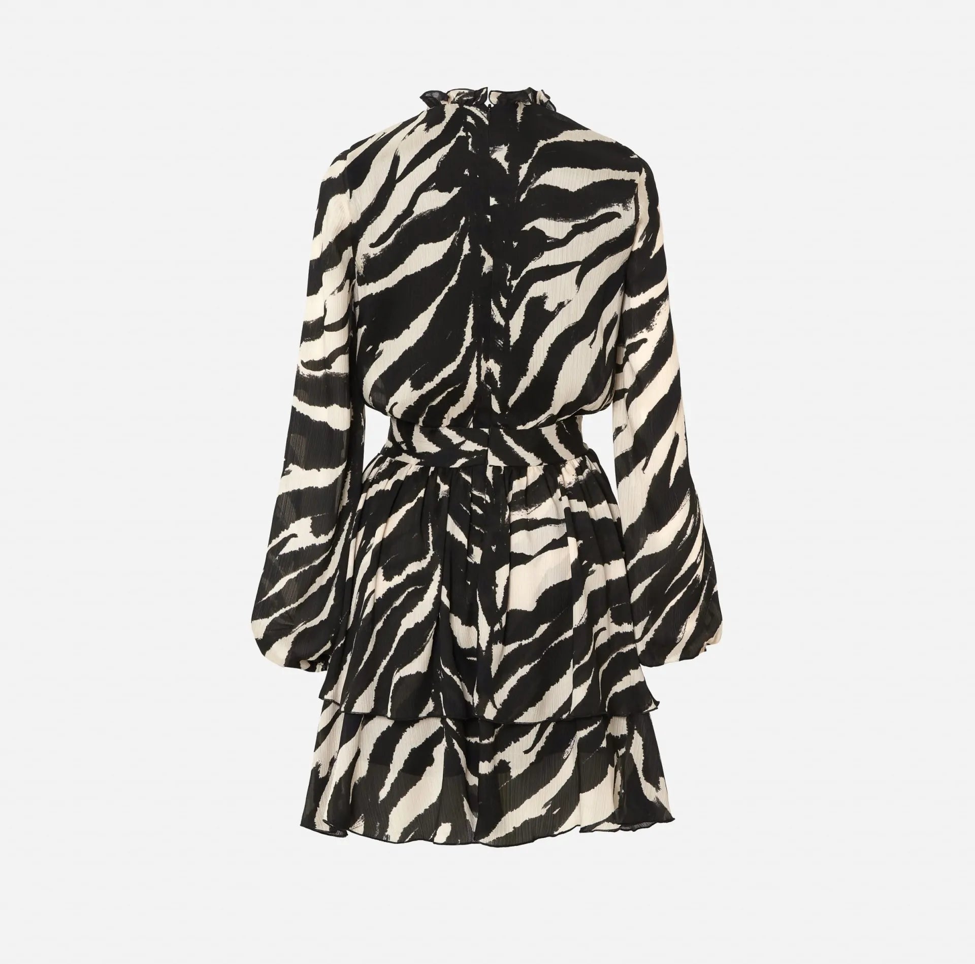 Cheio de atitude e movimento, este vestido curto em estampado zebra é a escolha perfeita para um look moderno e sofisticado. O tecido leve e fluido cria um caimento elegante, enquanto as mangas longas com punho elástico e a saia em camadas conferem um toque feminino e descontraído. Um modelo versátil que transita facilmente do dia para a noite.