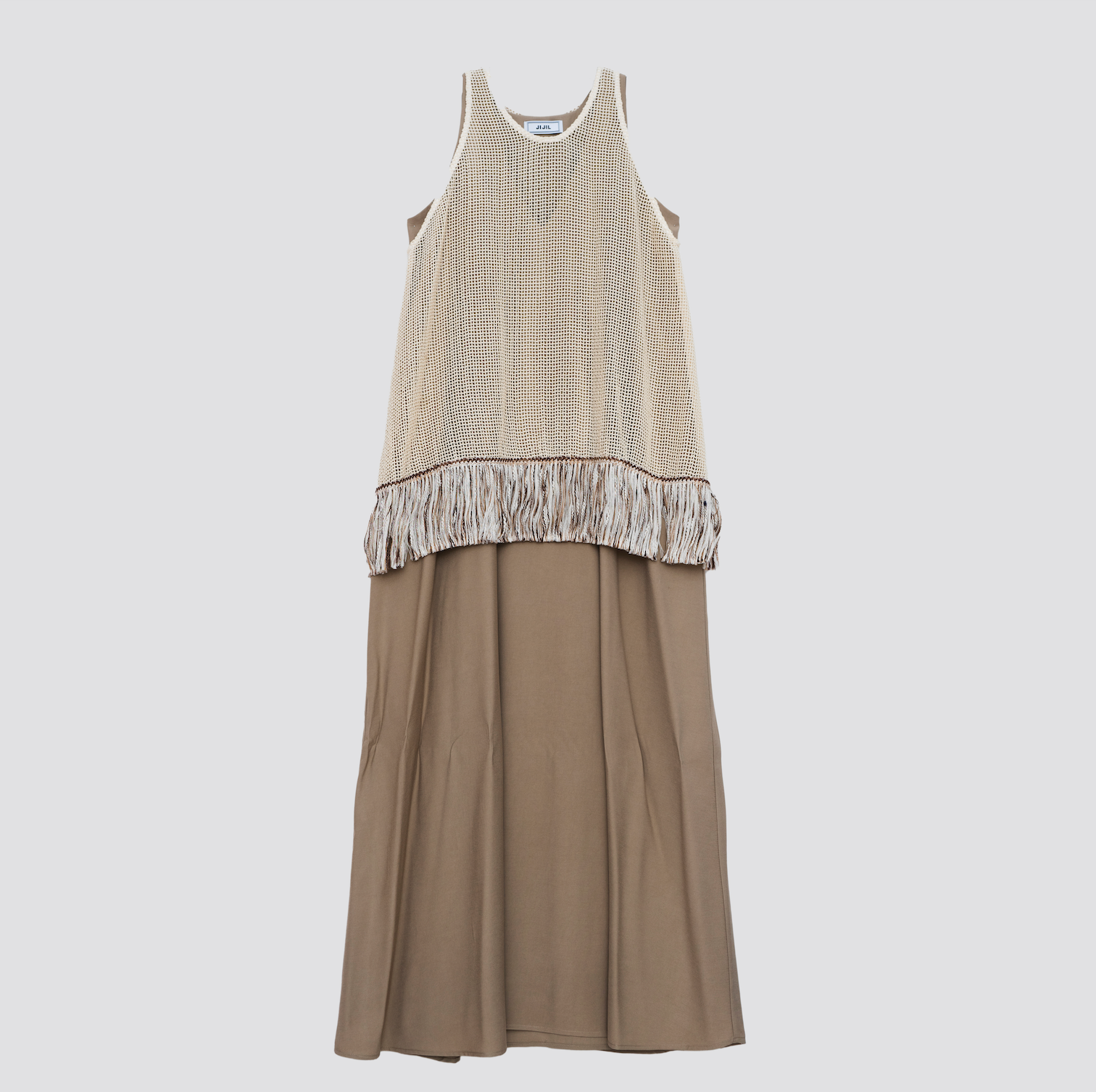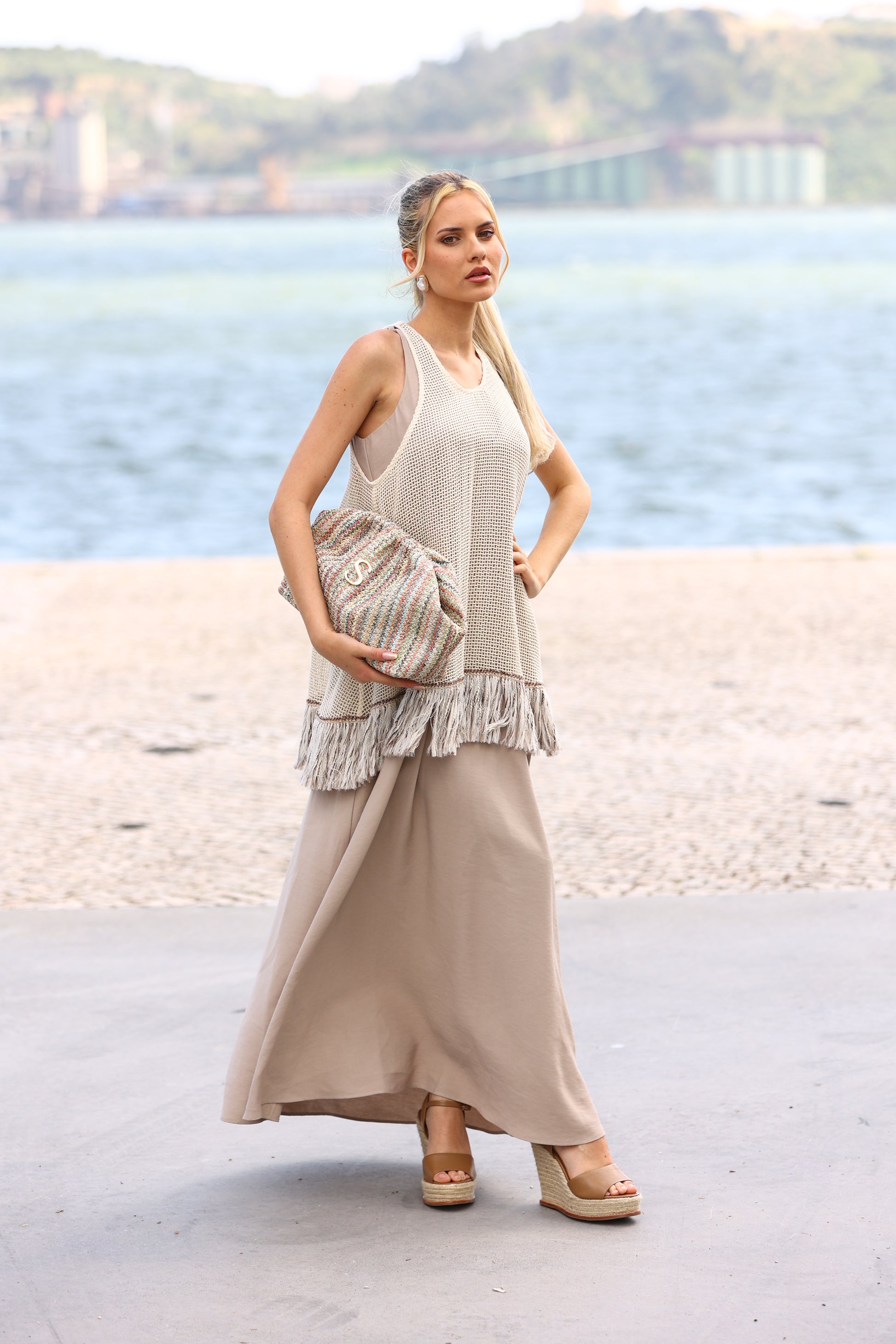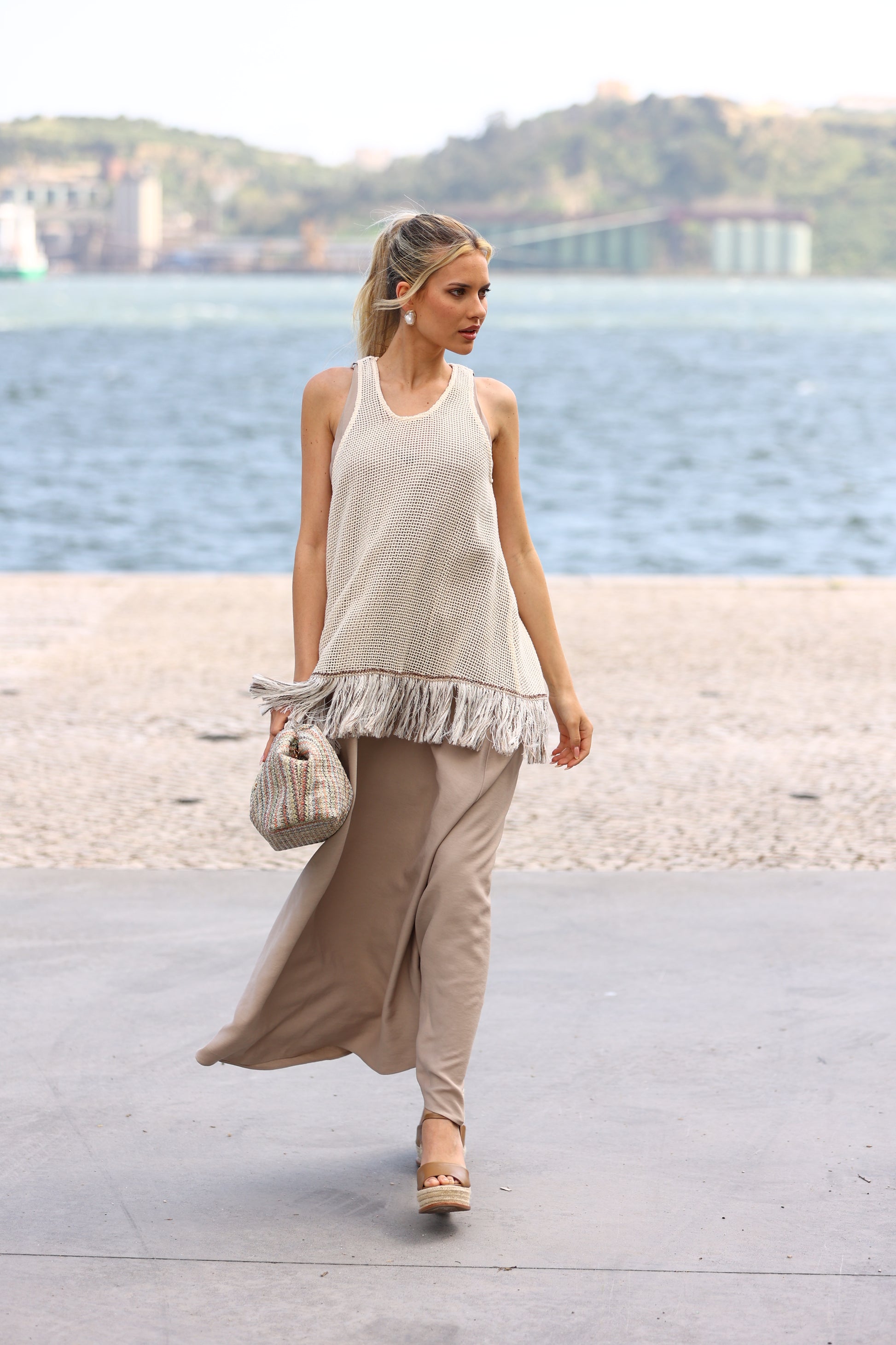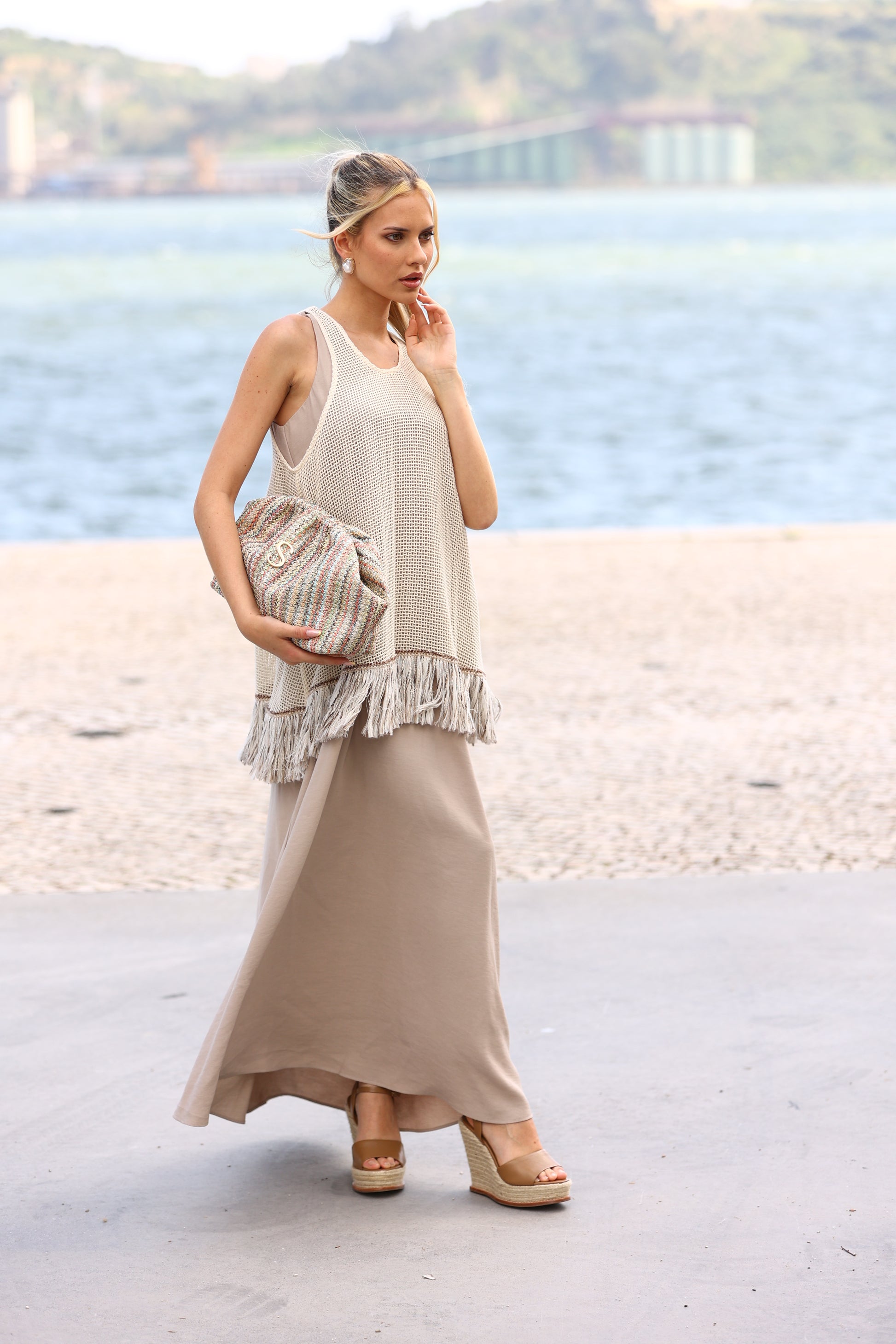 Vestido longo com design em duas camadas: a parte superior em malha aberta bege com acabamento em franjas coloridas, e a parte inferior em tecido fluido castanho, com caimento leve e elegante. A silhueta reta e o detalhe rústico nas franjas trazem um toque boho-chic à peça.