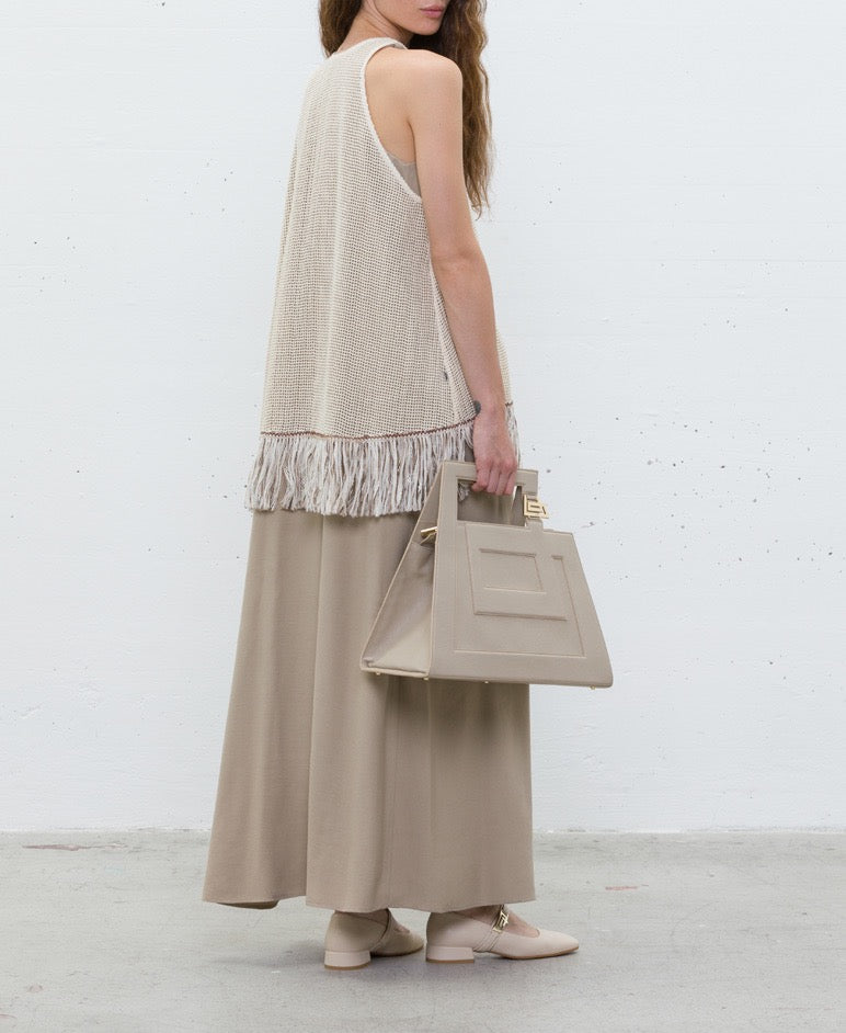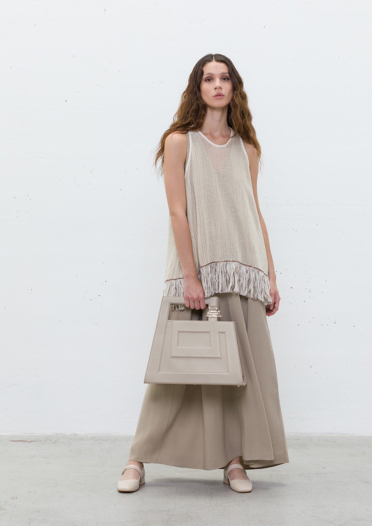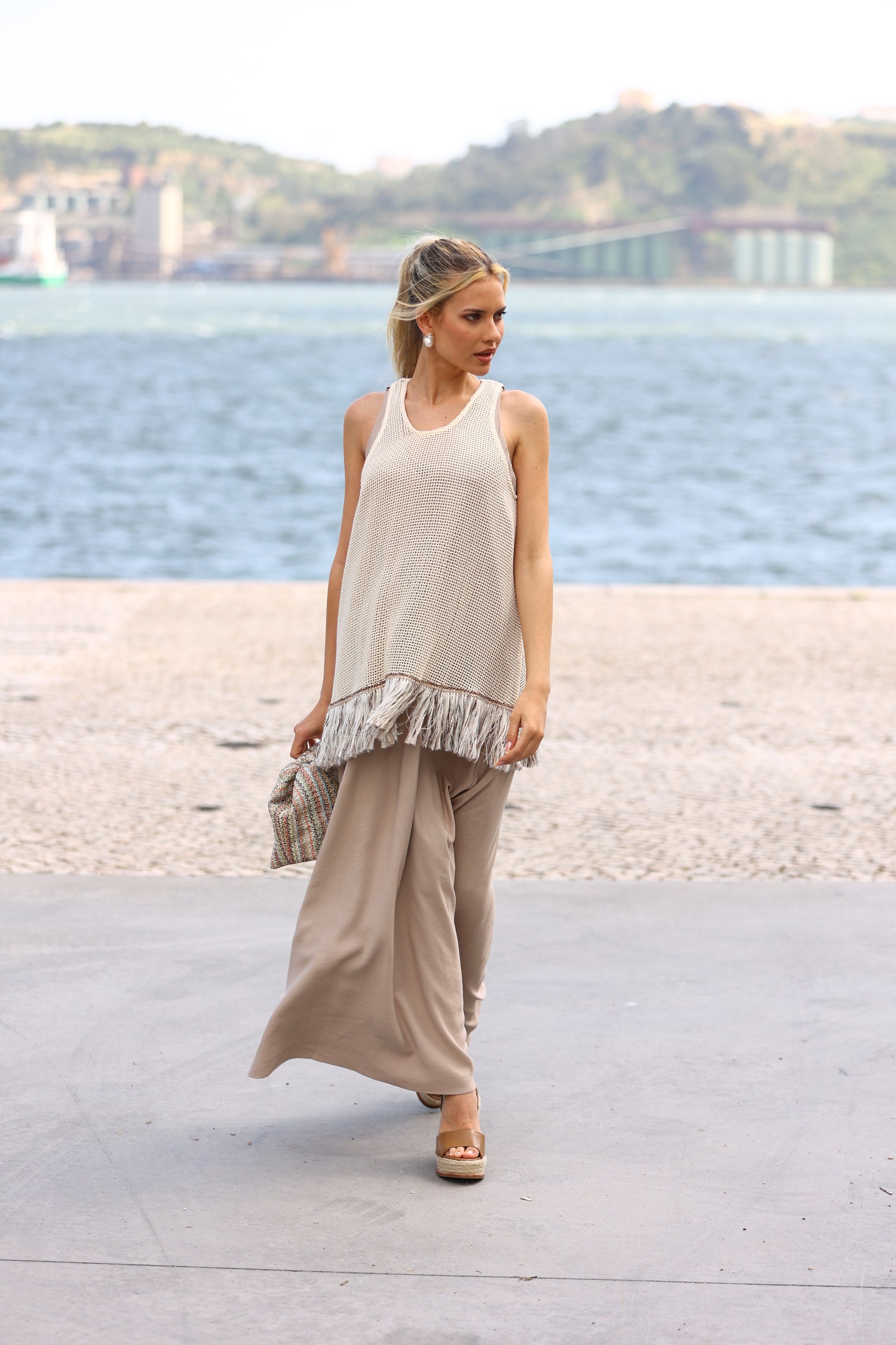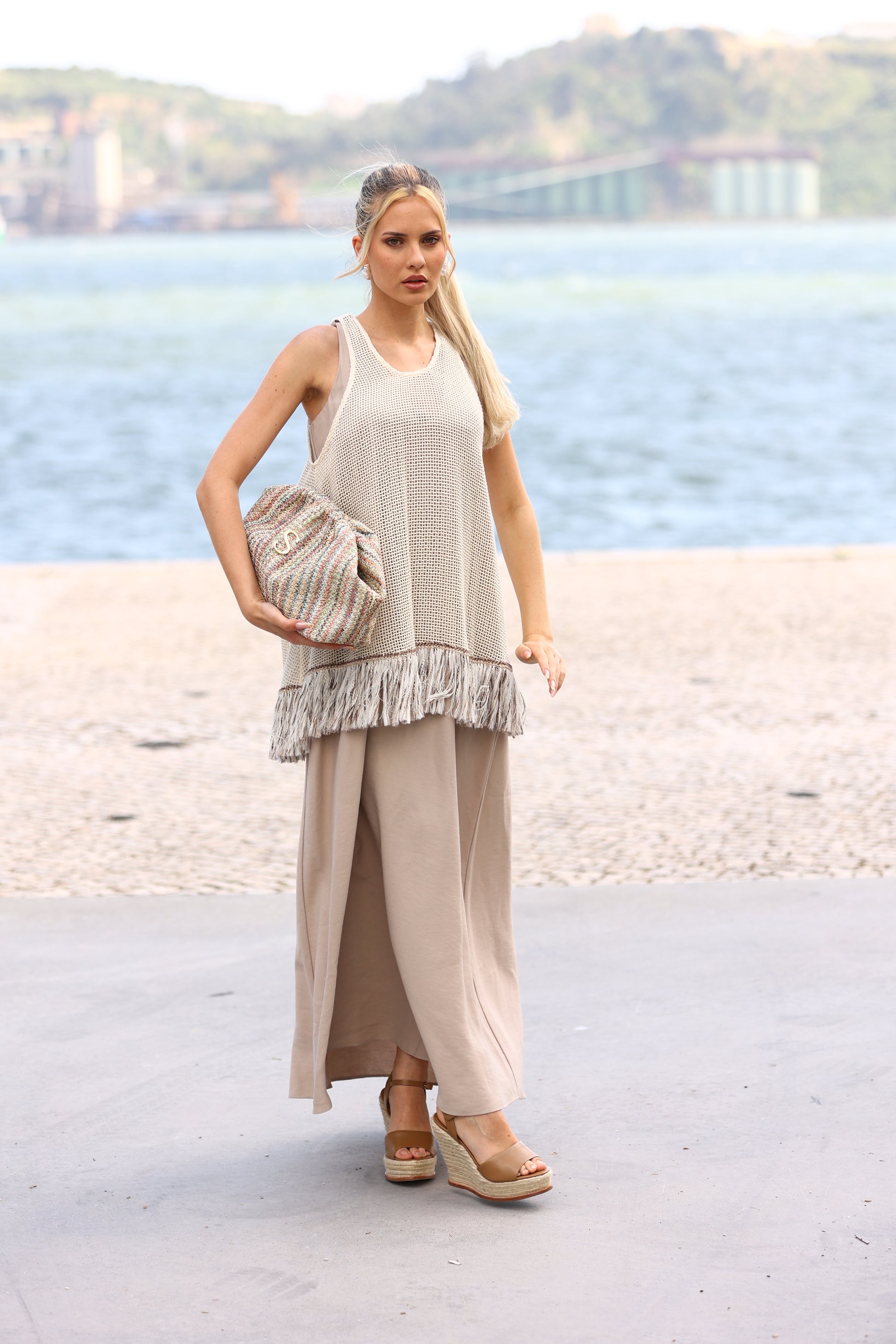 Vestido longo com design em duas camadas: a parte superior em malha aberta bege com acabamento em franjas coloridas, e a parte inferior em tecido fluido castanho, com caimento leve e elegante. A silhueta reta e o detalhe rústico nas franjas trazem um toque boho-chic à peça.