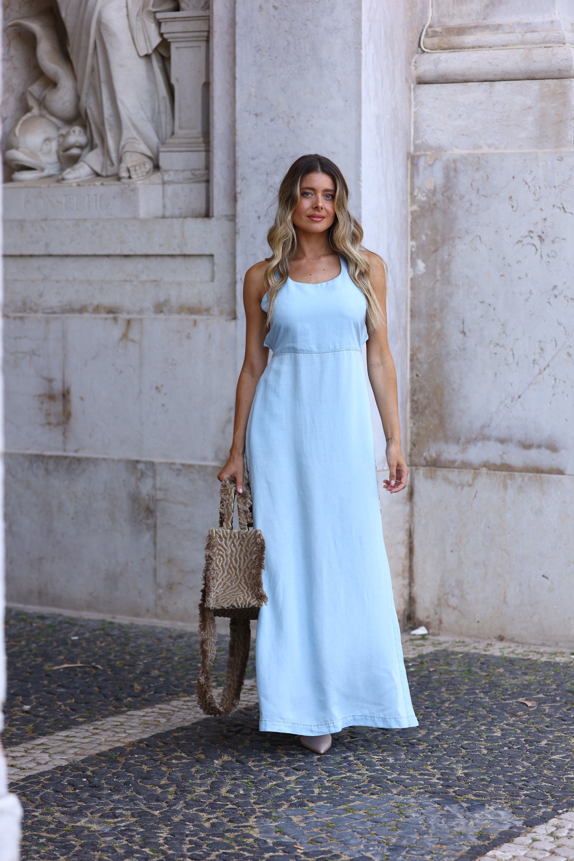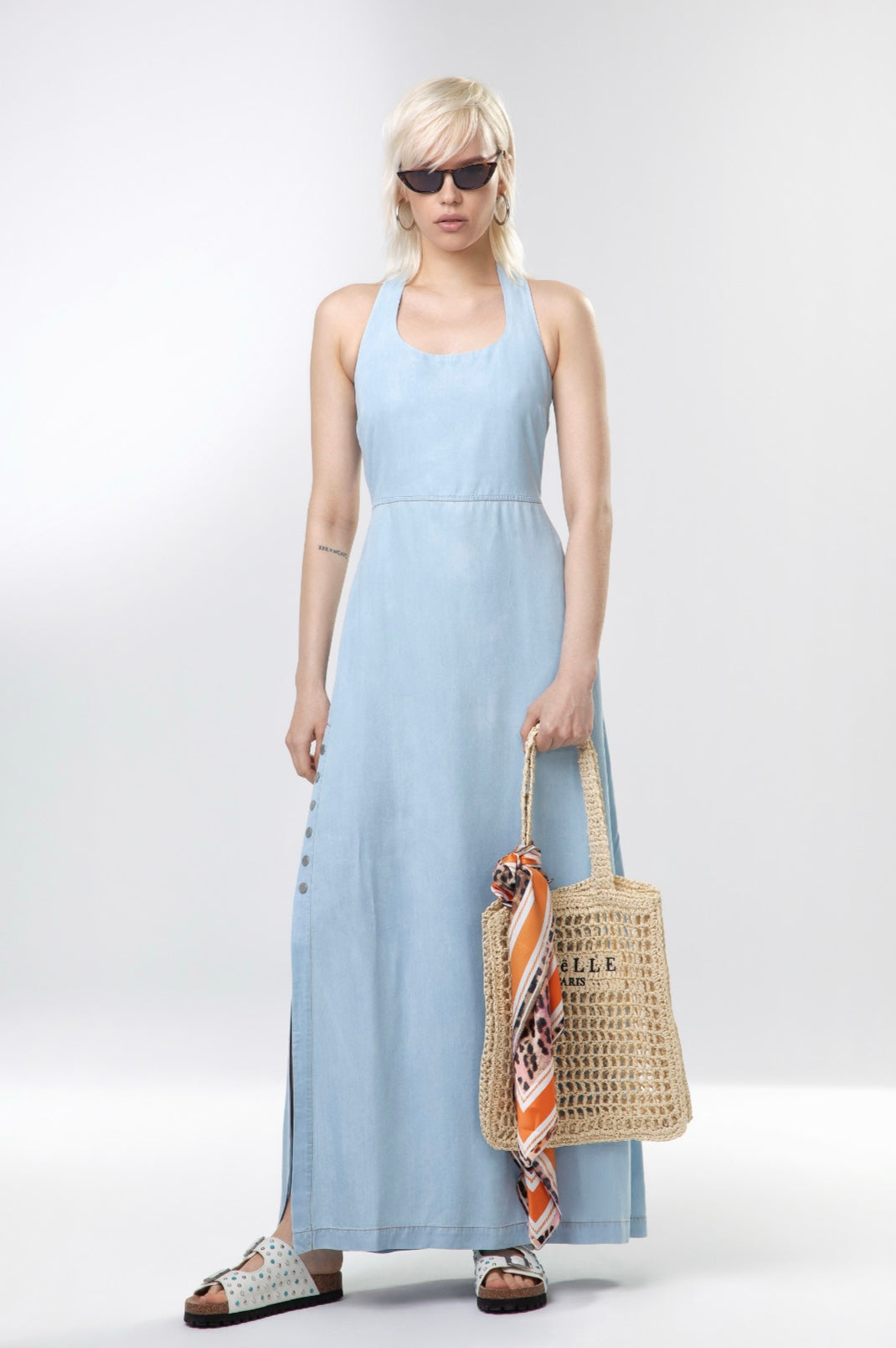 Long dress in lightweight, soft-touch denim with braided detail on the back.